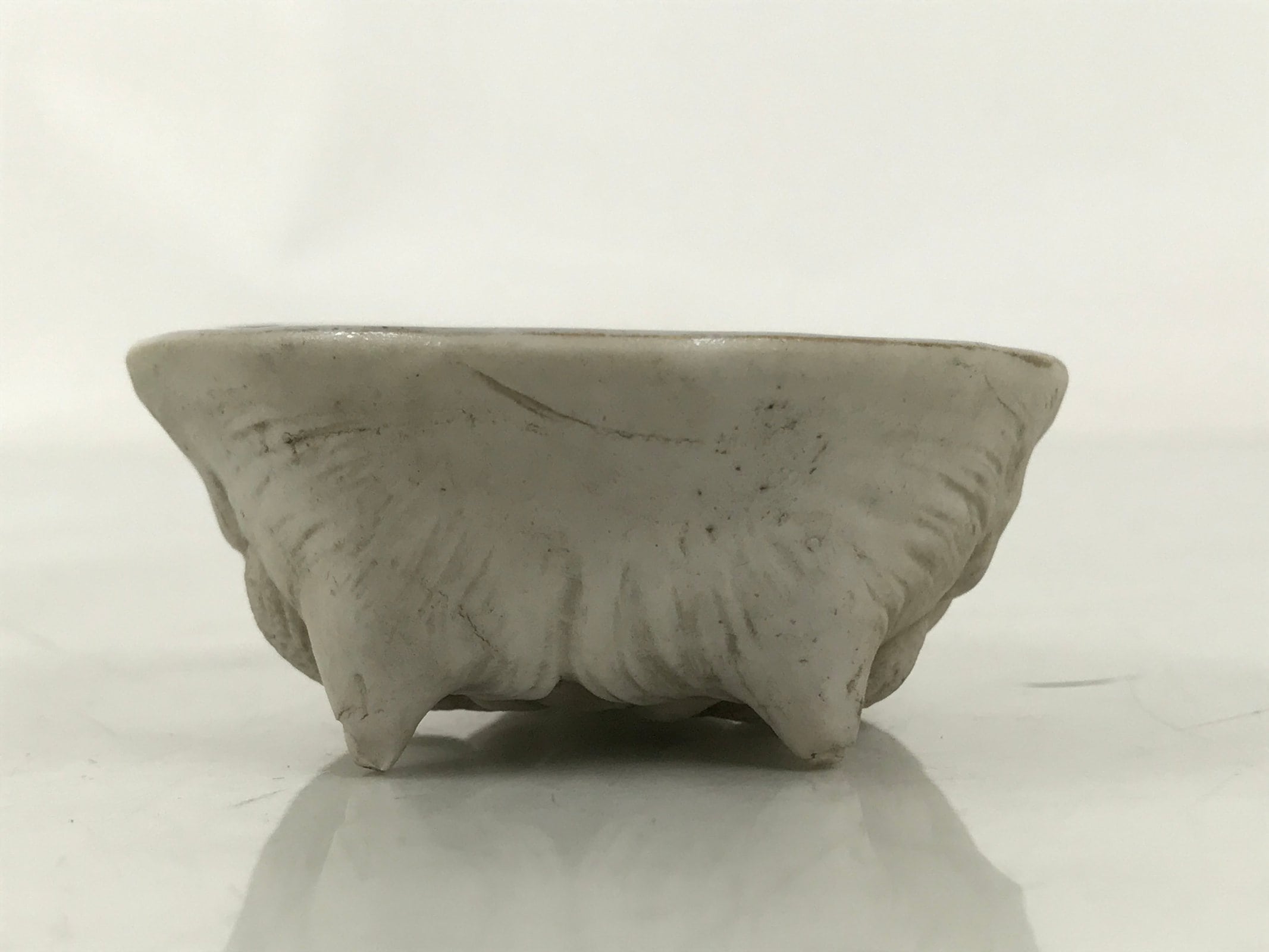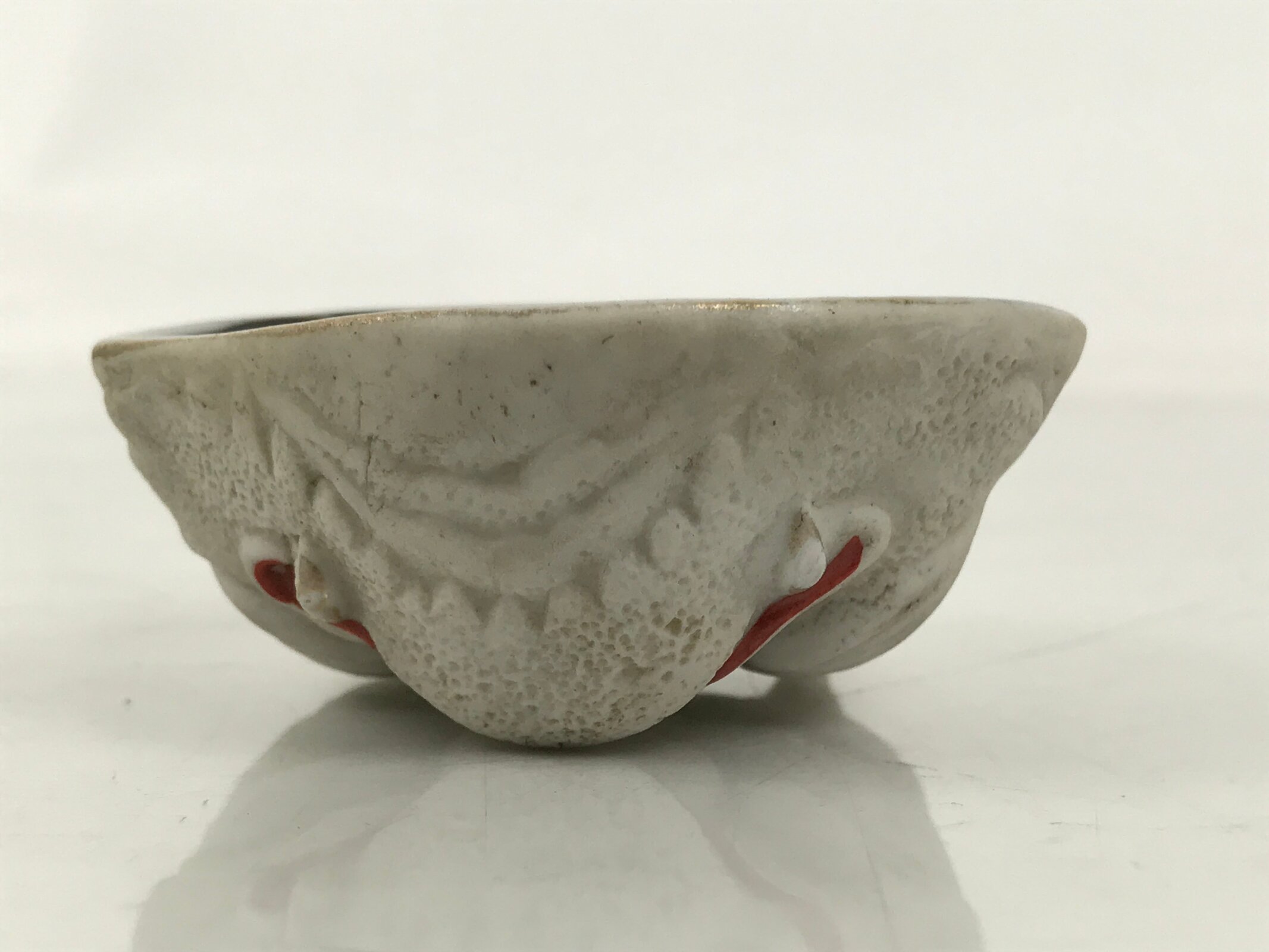 This is a vintage Japanese porcelain sake cup. It features two different designs on the inside and outside, and is called Kimen-hai or Setsubun-hai. The inside depicts Otafuku, a traditional Japanese lucky charm. The unglazed outside features a sculpture of an Oni or a devil face. This design is from Setsubun,a traditional Japanese event held in February. Devil horns and a jaw make it stand without wobbling.