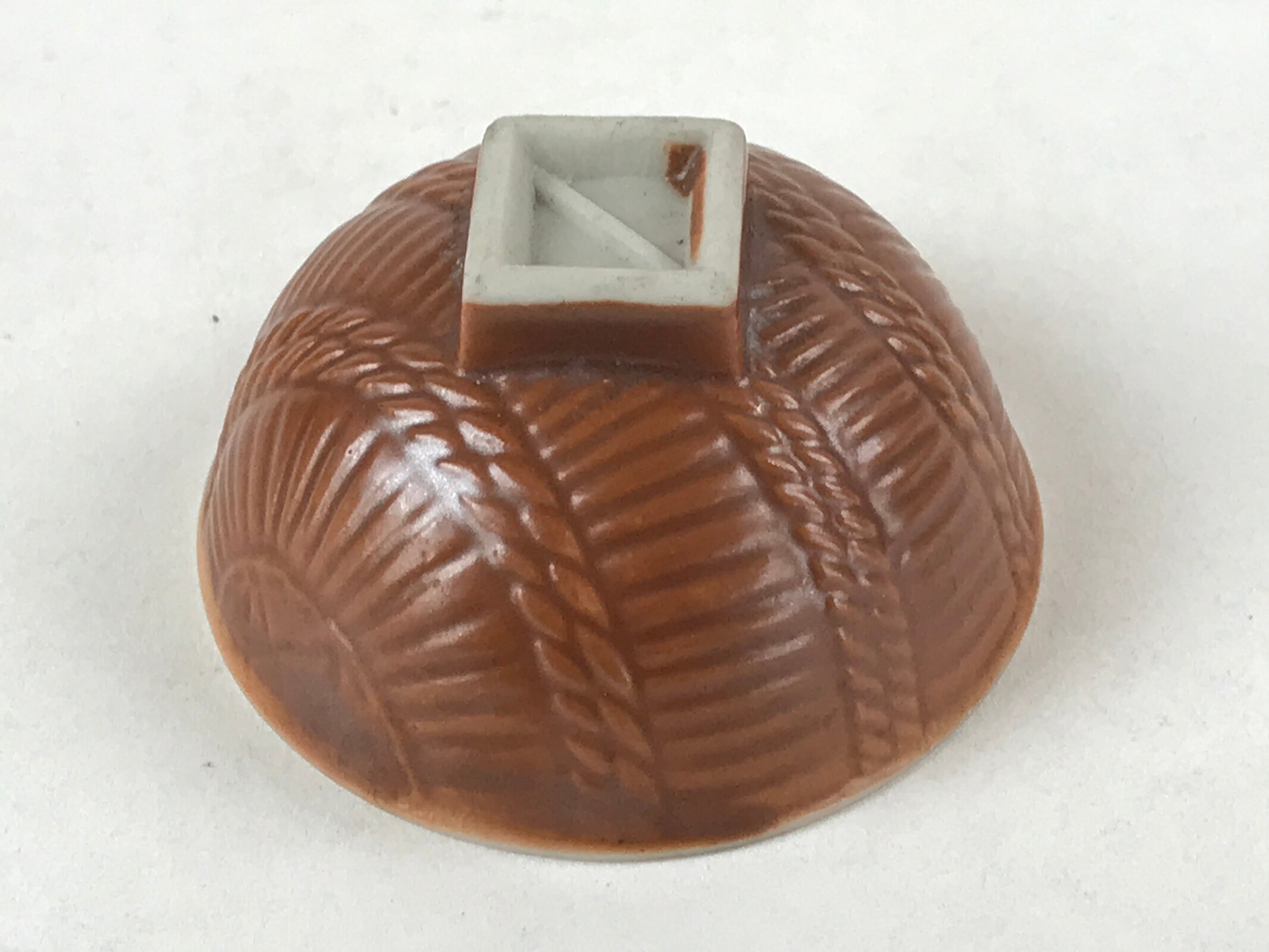 This is a vintage Japanese porcelain sake cup. It is a military service commemorative item. It has gold inscriptions on the inside, as well as an illustrated map of Manchuria when it was occupied by the Japanese Empire in the shape of a helmet surrounded by two flags. The outside of the cup is brown with a basket-like pattern and texture. This cup has a squared base. In terms of size, it is also called ochoko.