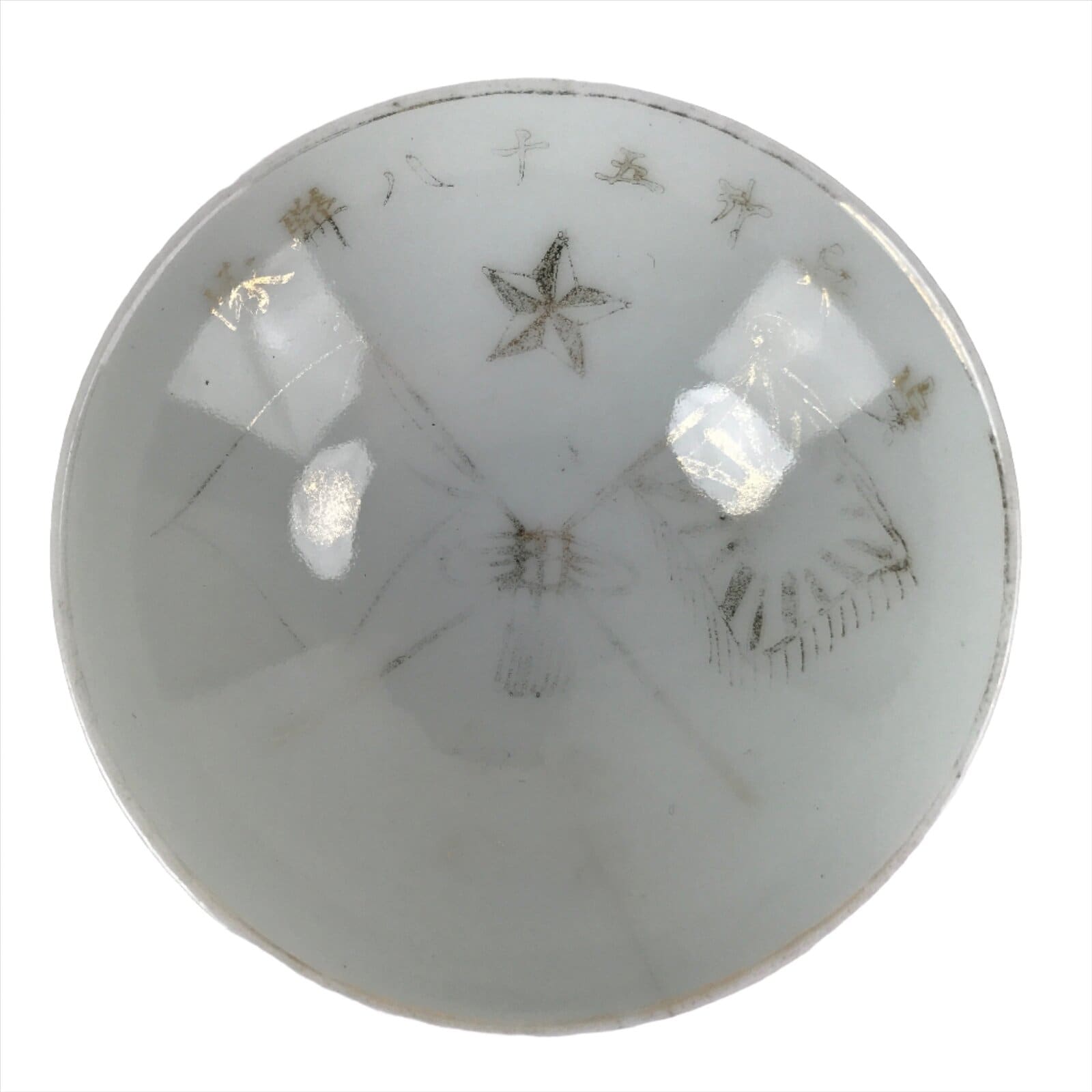 This is a vintage Japanese porcelain sake cup. It is a military service commemorative item. It has gold inscriptions on the inside, as well as a picture of a star and two crossed flag of the Japanese empire. This sakazuki cup has a rounded base.
