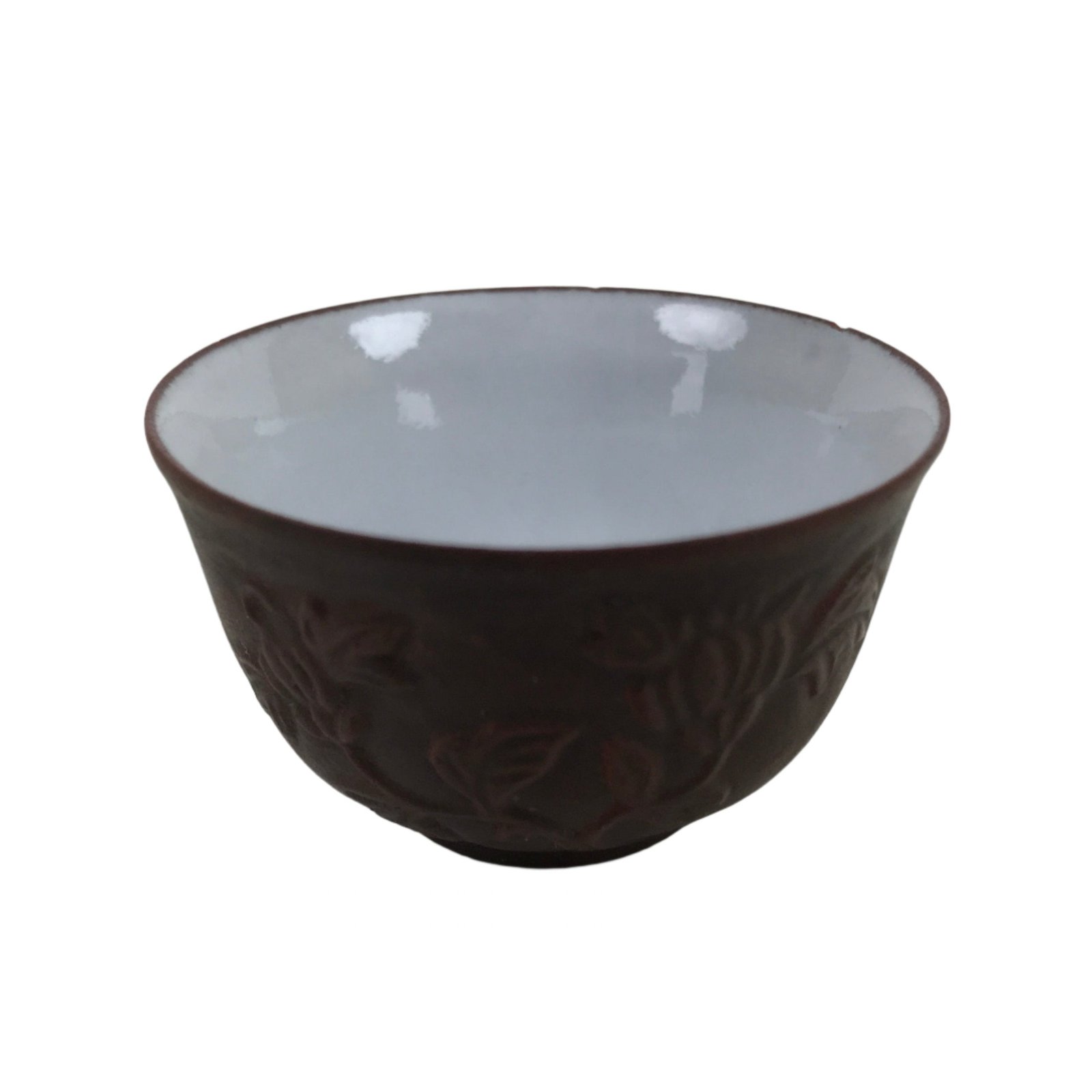This is a vintage Japanese porcelain sake cup. This particular type of cup is called tsubomi or “bud type” due to its resemblance to a flower bud. In terms of size, it is also called ochoko. It has an embossed brown image of chrysanthemums and leaves with a smooth white inside.