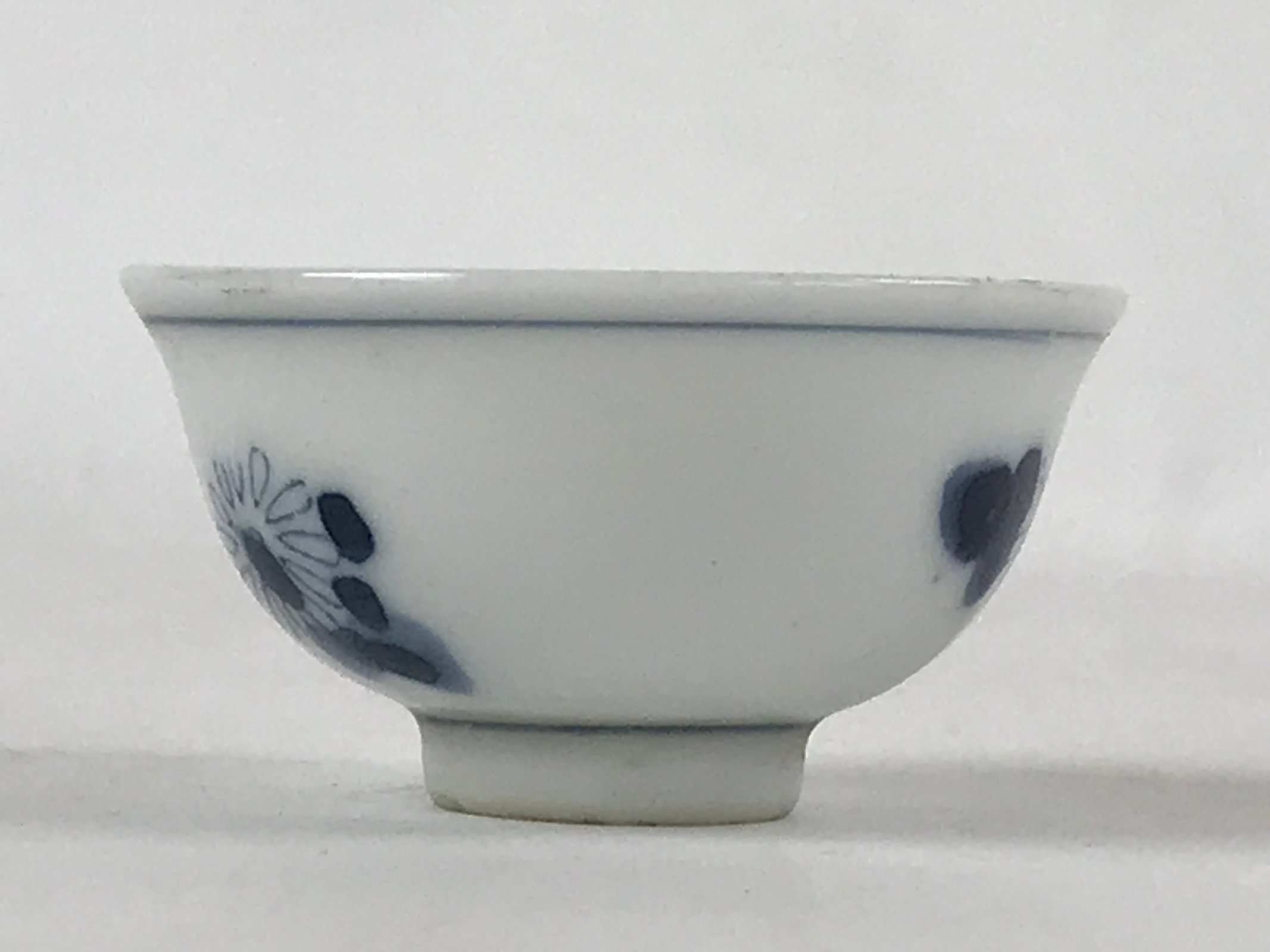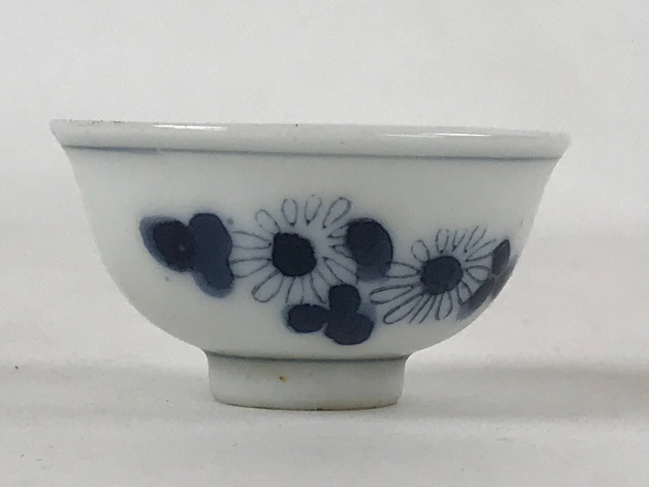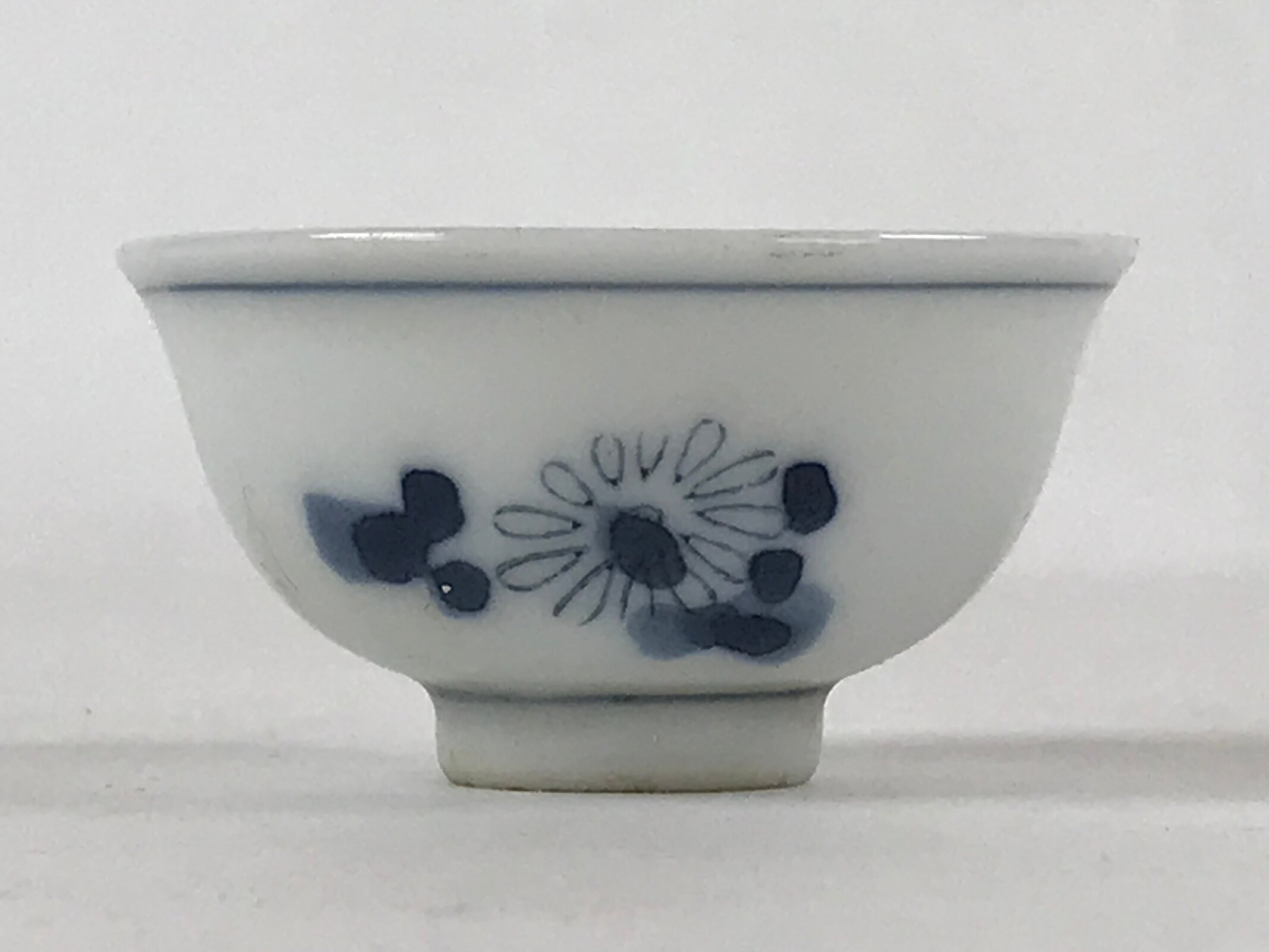 This is a vintage Japanese porcelain sake cup. This particular type of cup is called tsubomi or “bud type” due to its resemblance to a flower bud. In terms of size, it is also called ochoko. This cup has sometsuke coloring (white with indigo blue design) and features flowers with leaves.