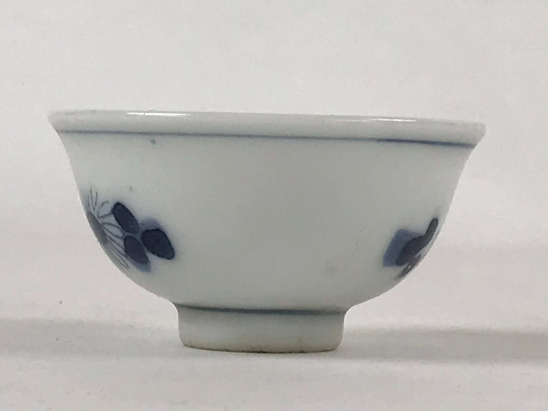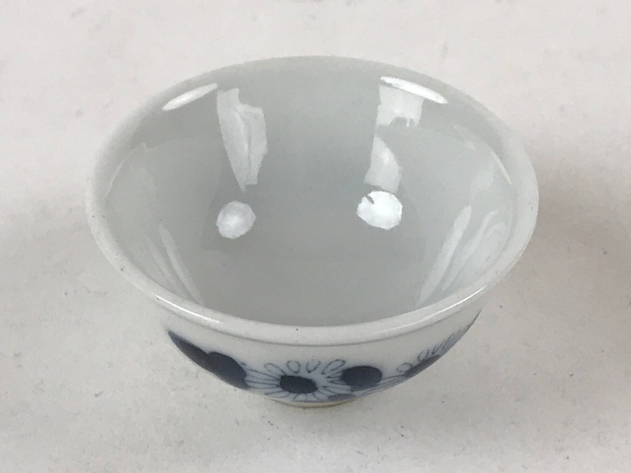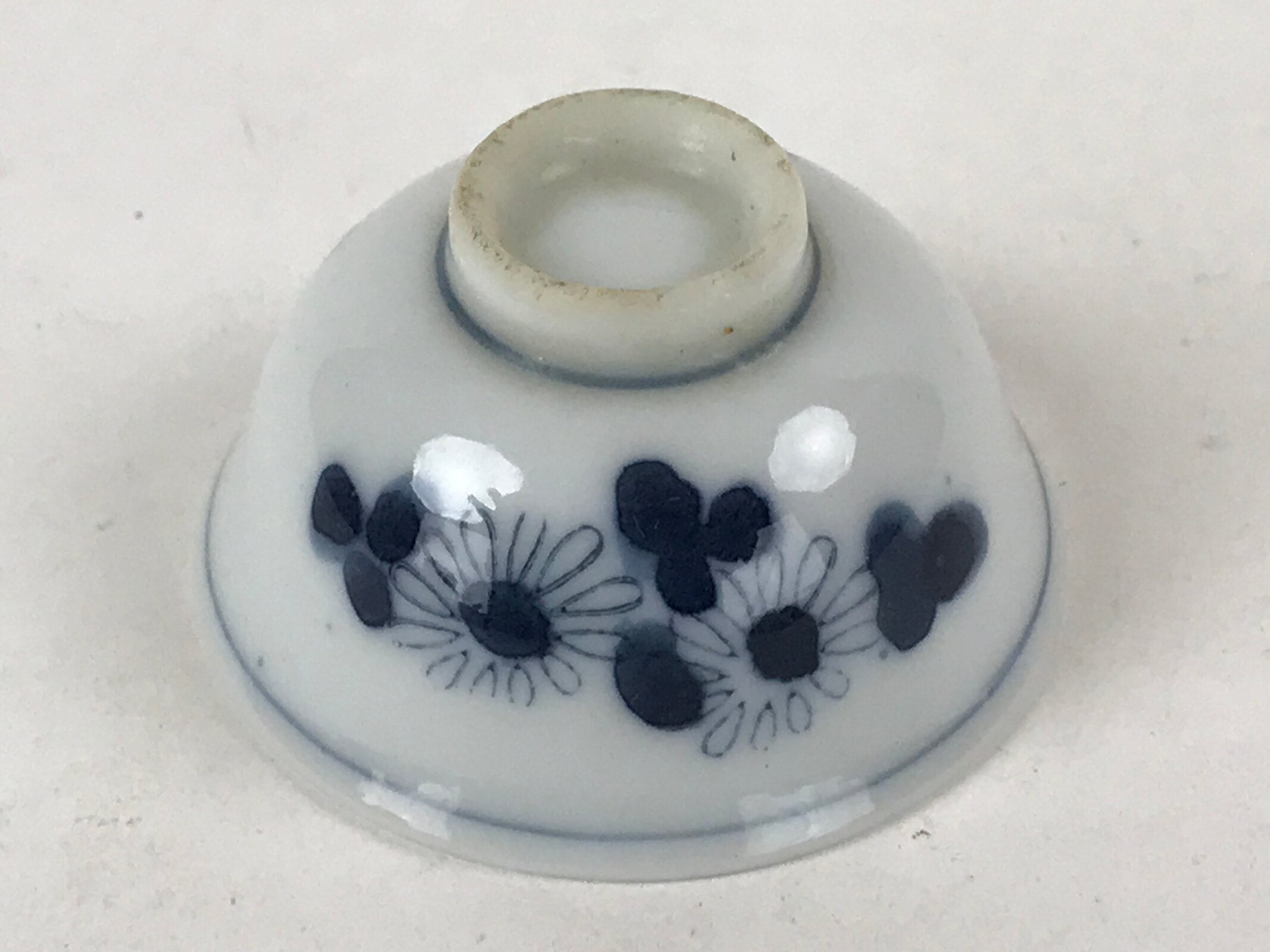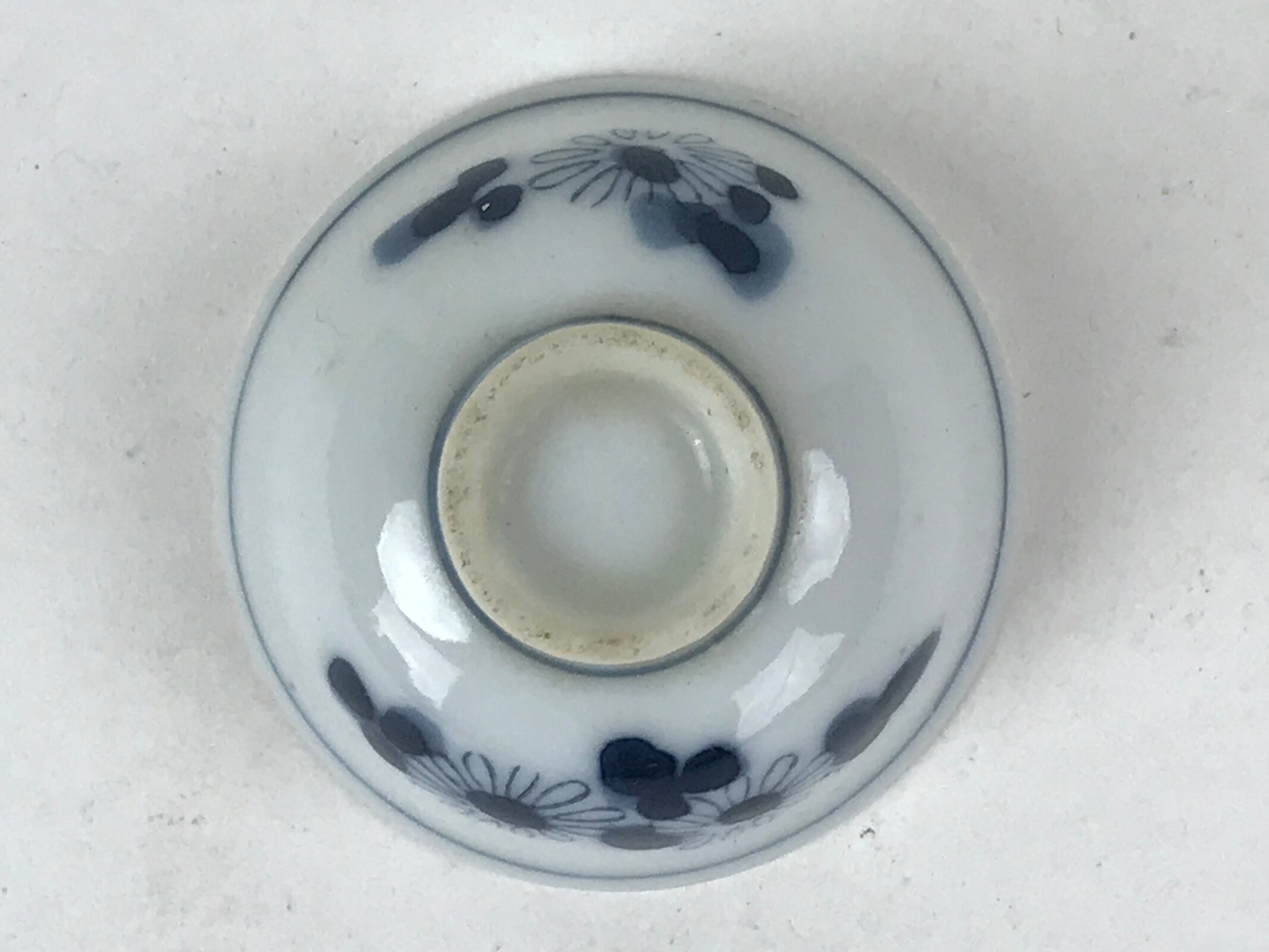 This is a vintage Japanese porcelain sake cup. This particular type of cup is called tsubomi or “bud type” due to its resemblance to a flower bud. In terms of size, it is also called ochoko. This cup has sometsuke coloring (white with indigo blue design) and features flowers with leaves.