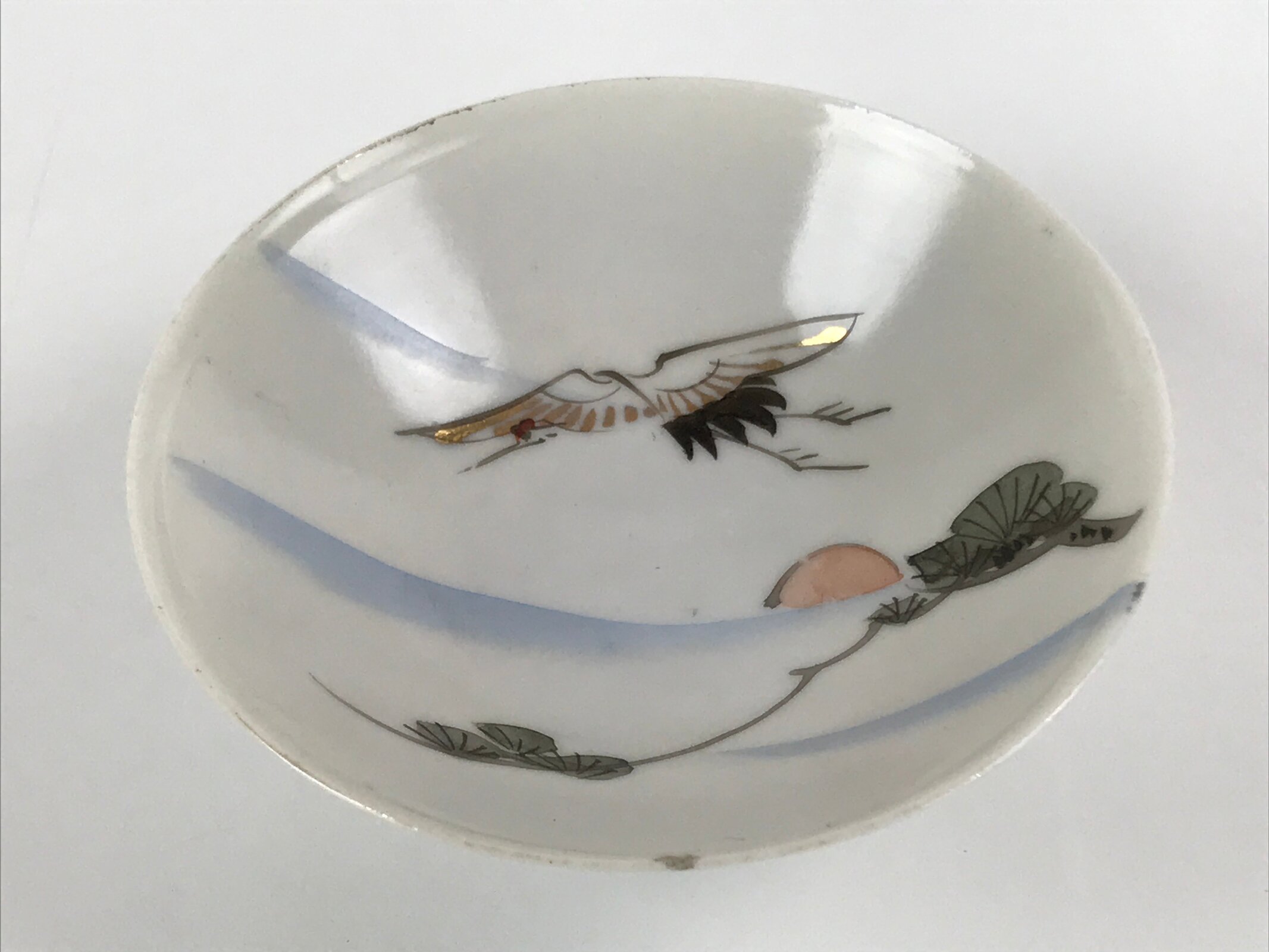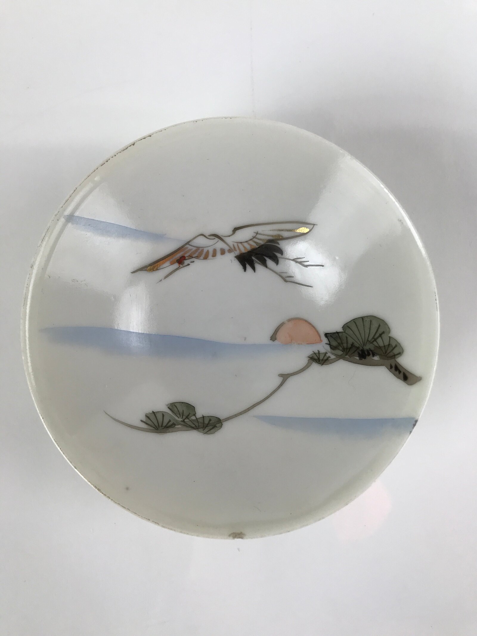 This is a vintage Japanese porcelain sake cup. This particular type of cup is called a sakazuki, a wide-mouthed, footed, flat sake cup often used for ceremonial purposes. Sakazuki typically only holds a couple of sips of sake. It is white with a hand-painted flying crane, pine tree branches, and an orange sunrise over a subtle striped blue background. It has a worn gold-painted lip.