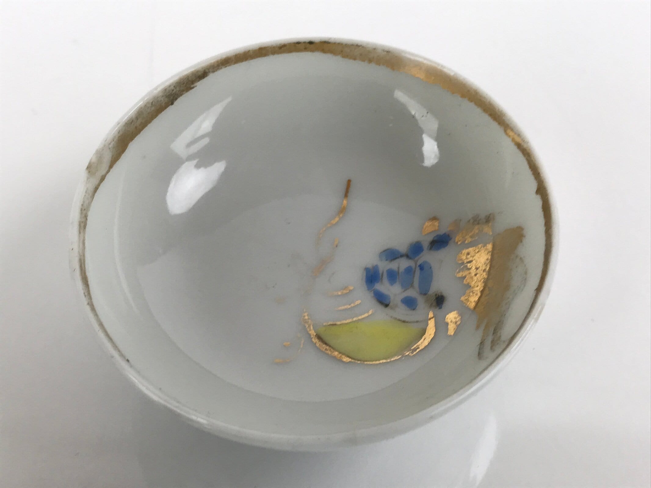 - Good condition considering age. Small chips in rim. Crack in side. Gold paint worn on lip. General imperfections in glaze, shape, and design from production. Wear and tear due to age. Please see the photos carefully.