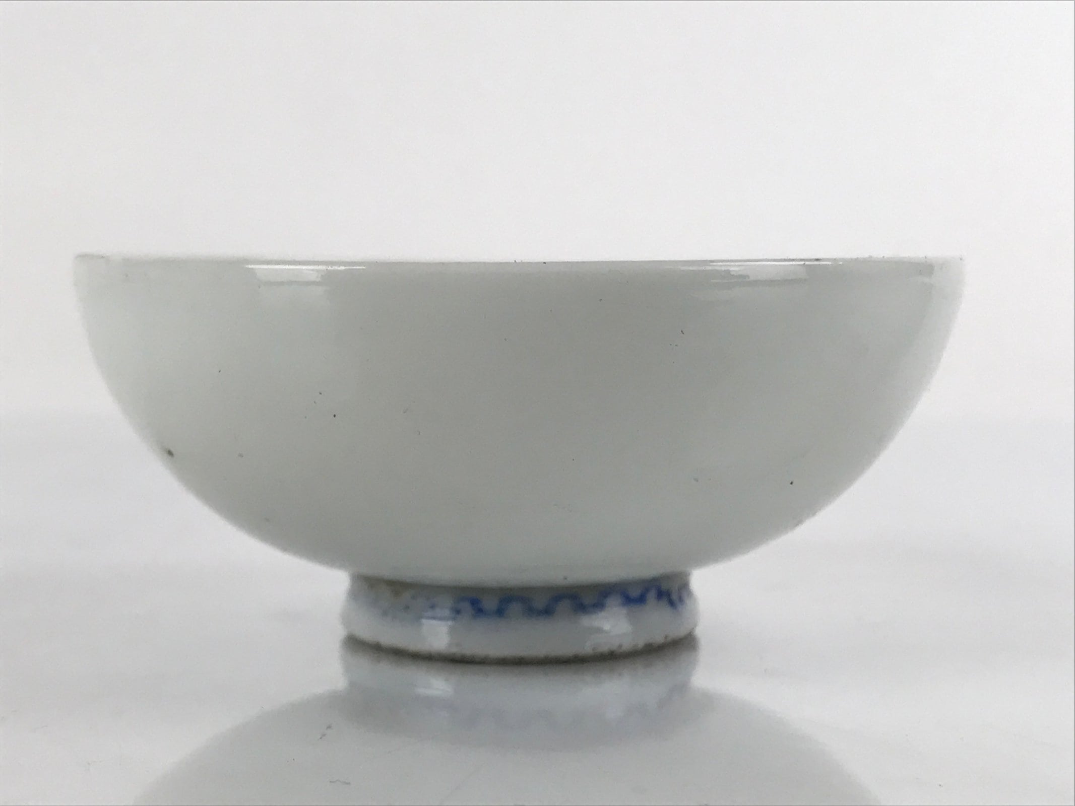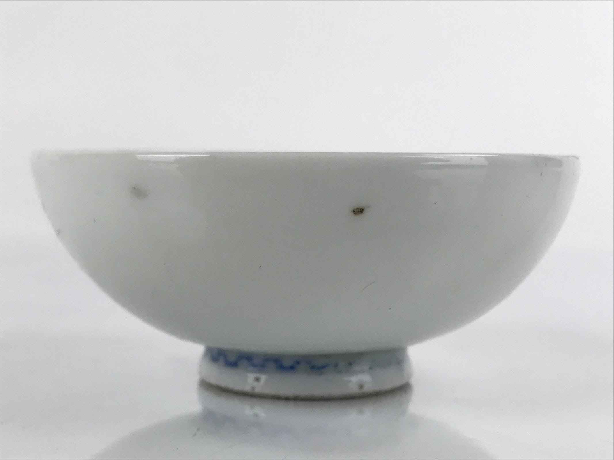 This is a vintage Japanese porcelain sake cup. This particular type of cup is called a sakazuki, a wide-mouthed sake cup often used for ceremonial purposes. Sakazuki typically only holds a couple of sips of sake. This white cup is painted with the design of a turtle (minogame). Minogame are a legendary turtle often depicted in traditional Japanese artwork and stories with a long tail and symbolizes longevity. The turtle is colored gold, blue, and yellow and the inside rim has a worn gold band.