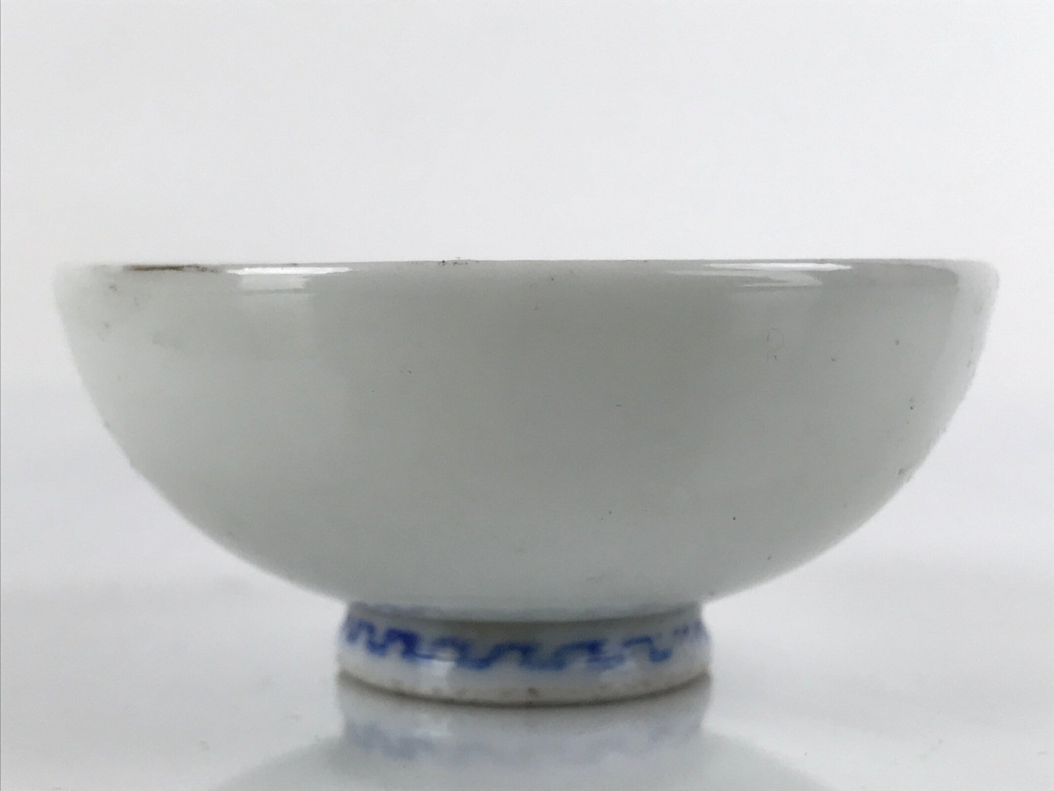 This is a vintage Japanese porcelain sake cup. This particular type of cup is called a sakazuki, a wide-mouthed sake cup often used for ceremonial purposes. Sakazuki typically only holds a couple of sips of sake. This white cup is painted with the design of a turtle (minogame). Minogame are a legendary turtle often depicted in traditional Japanese artwork and stories with a long tail and symbolizes longevity. The turtle is colored gold, blue, and yellow and the inside rim has a worn gold band.
