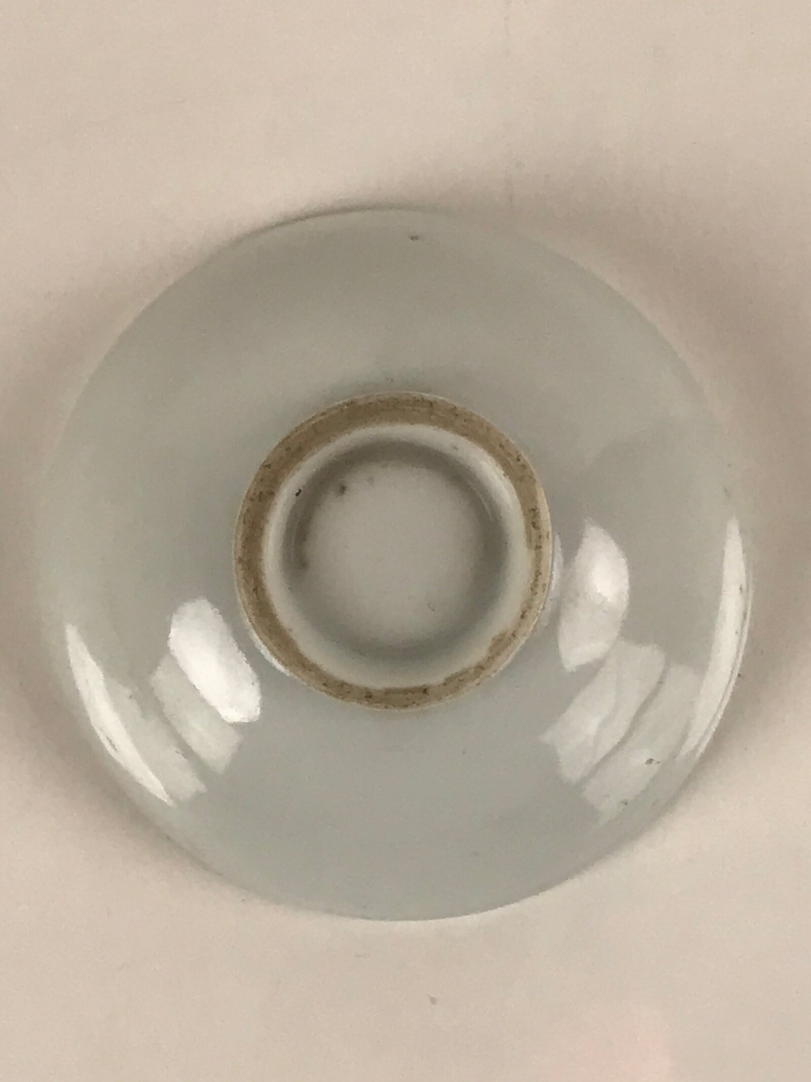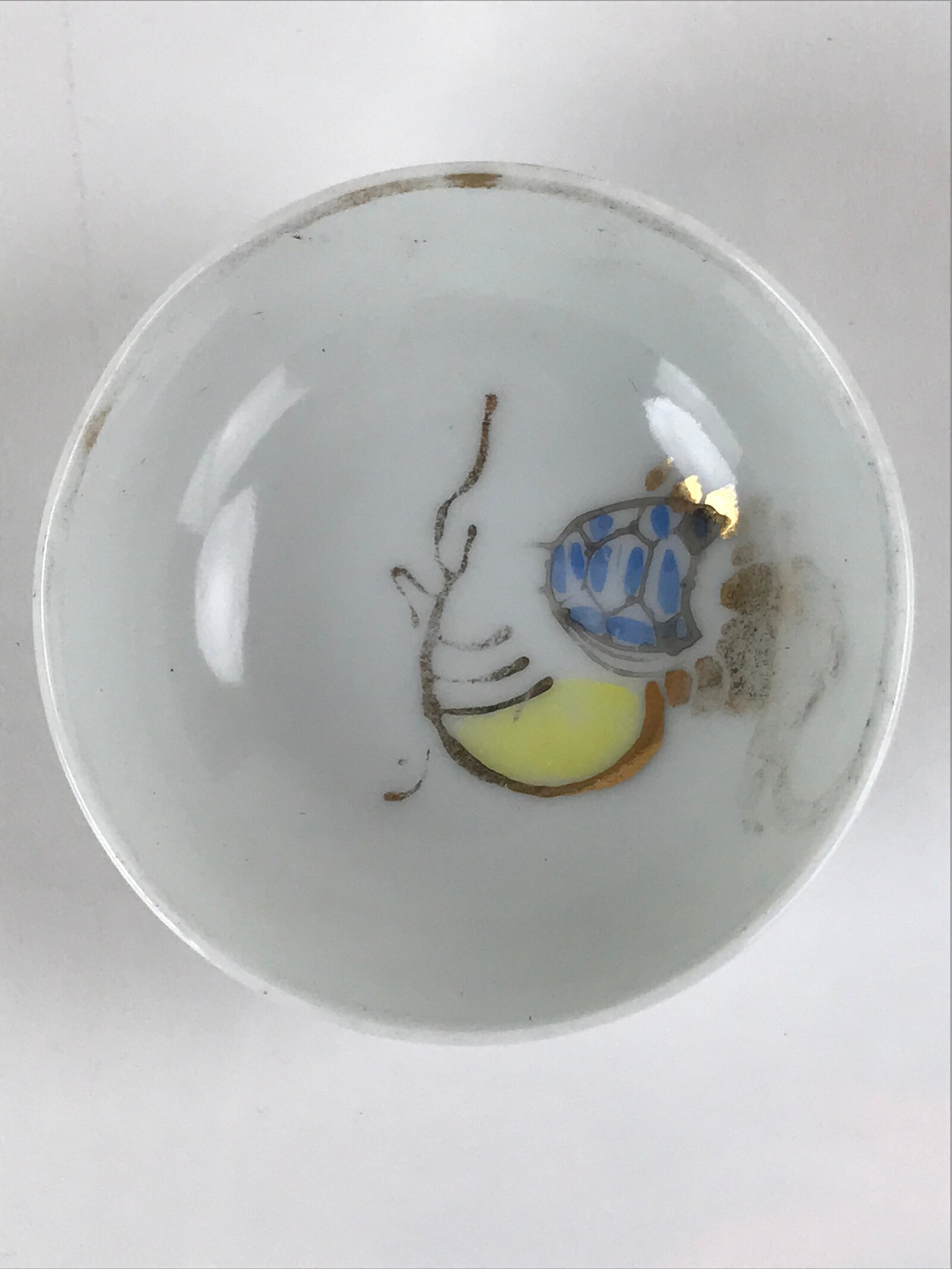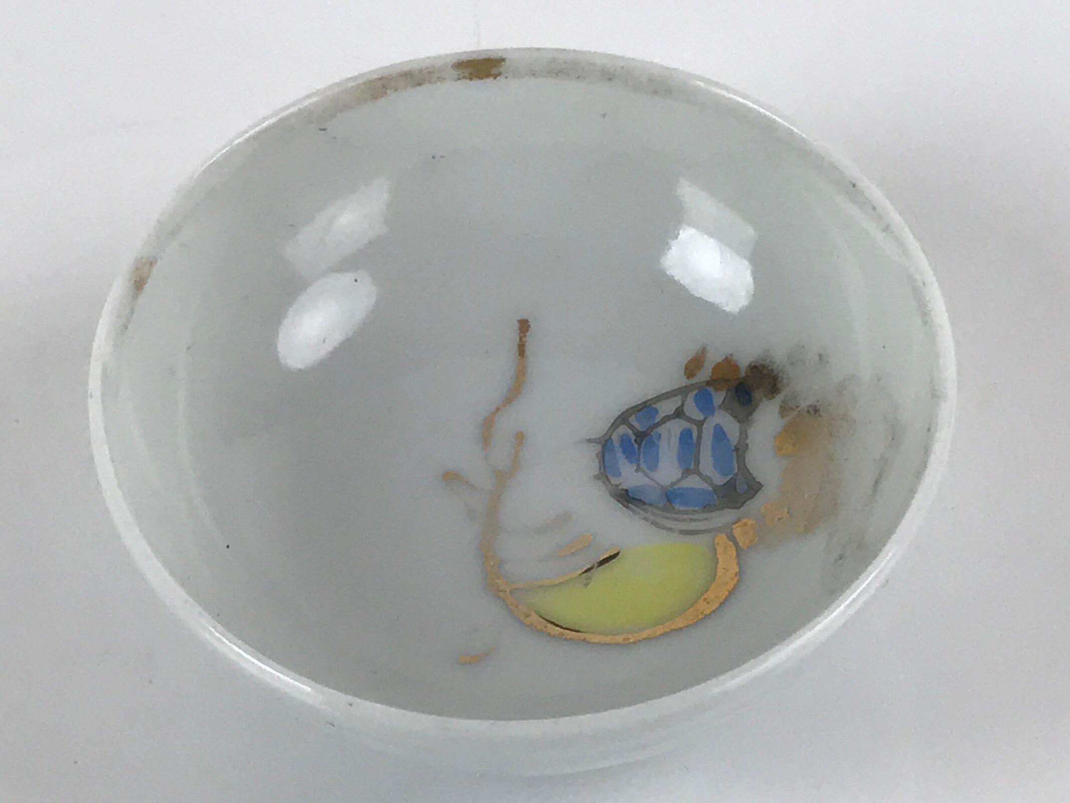 This is a vintage Japanese porcelain sake cup. This particular type of cup is called a sakazuki, a wide-mouthed sake cup often used for ceremonial purposes. Sakazuki typically only holds a couple of sips of sake. This white cup is painted with the design of a turtle (minogame). Minogame are a legendary turtle often depicted in traditional Japanese artwork and stories with a long tail and symbolizes longevity. The turtle is colored gold, blue, and yellow and the inside rim has a worn gold band.