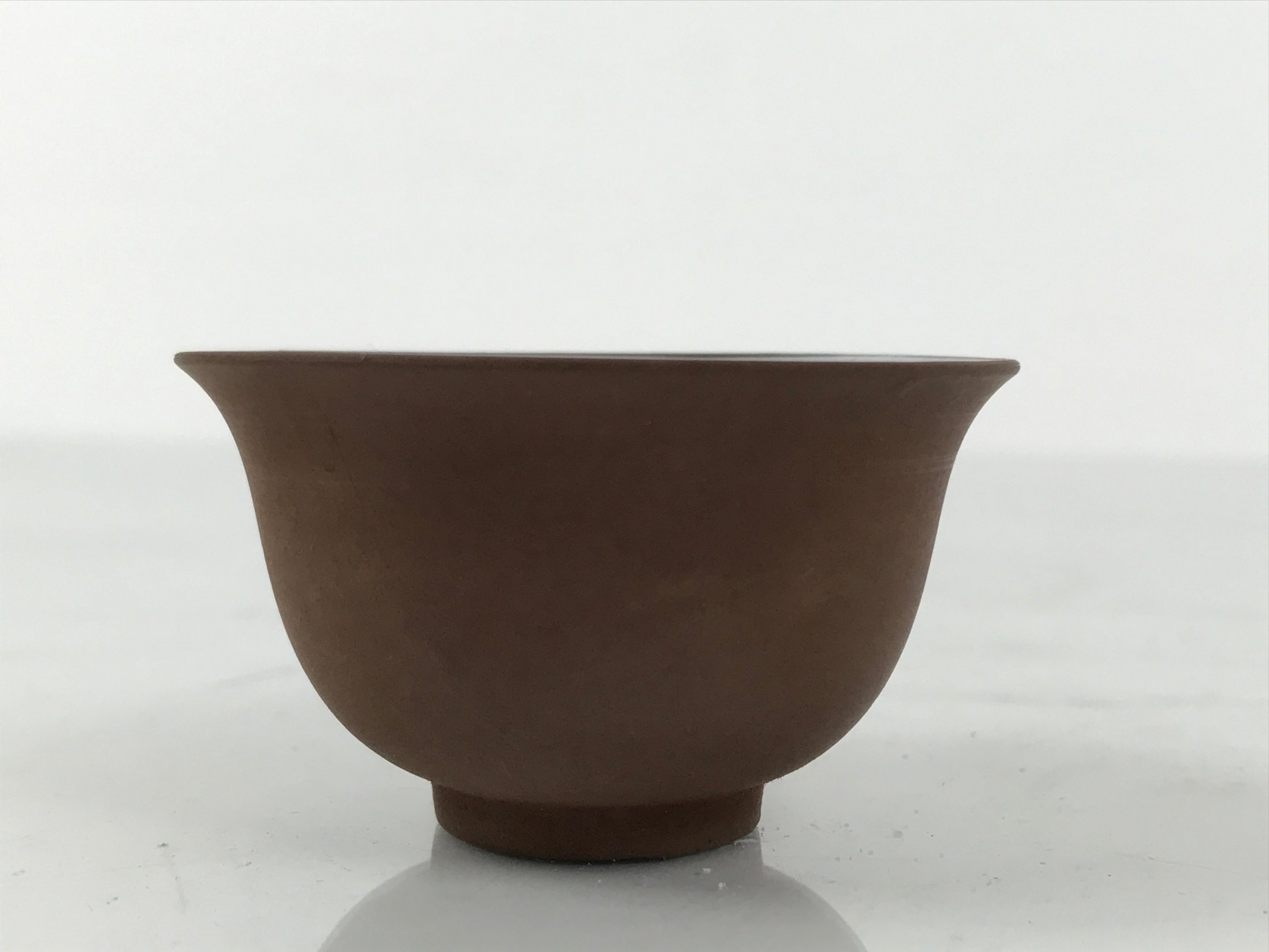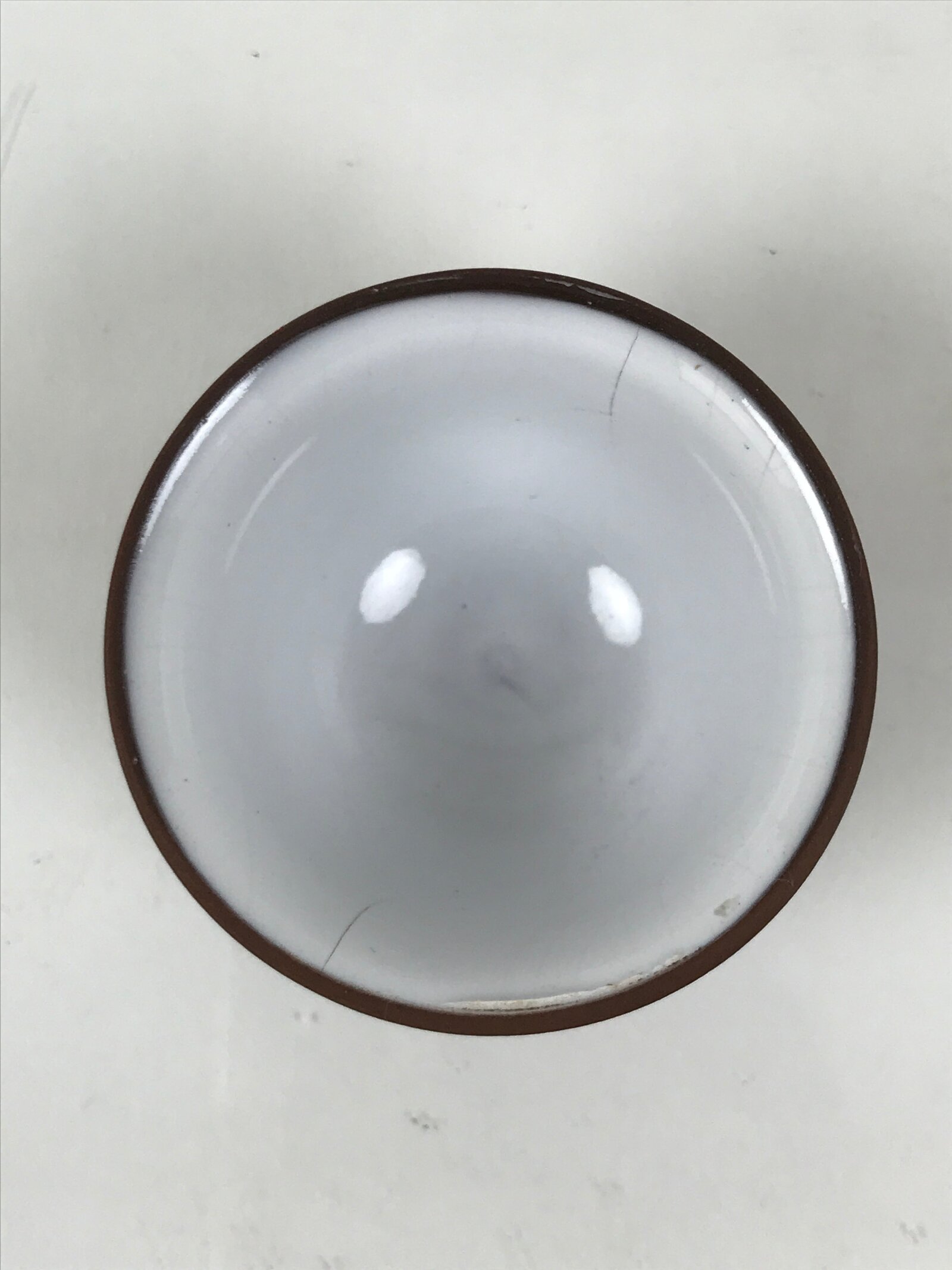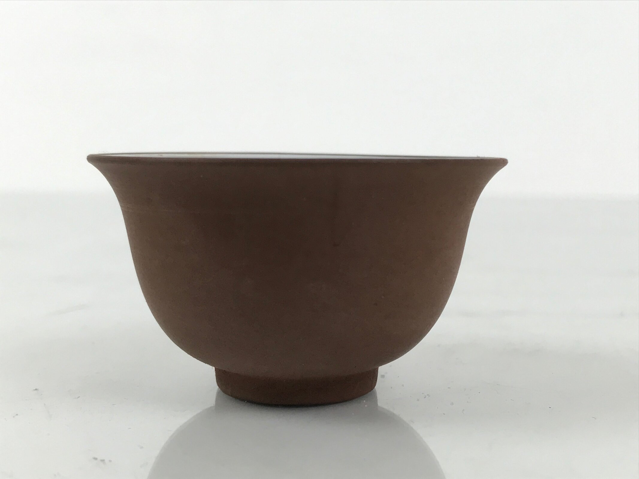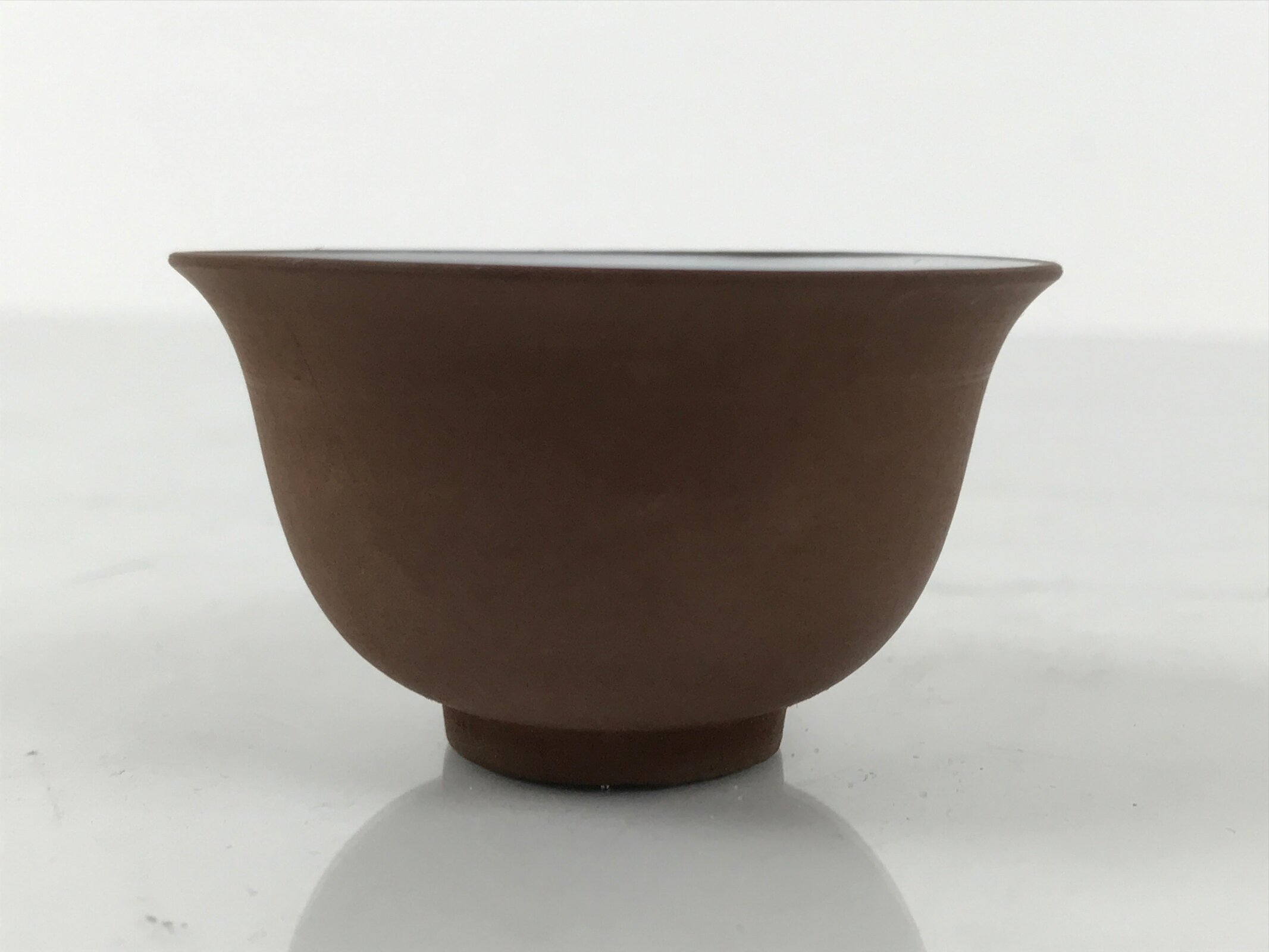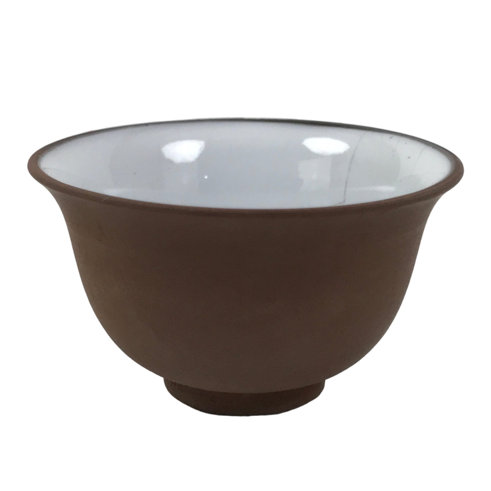 This is a vintage Japanese porcelain sake cup. This particular type of cup is called tsubomi or “bud type” due to its resemblance to a flower bud. In terms of size, it is also called ochoko. It has a matte brown outside with a smooth white inside and no other designs or embellishments.
