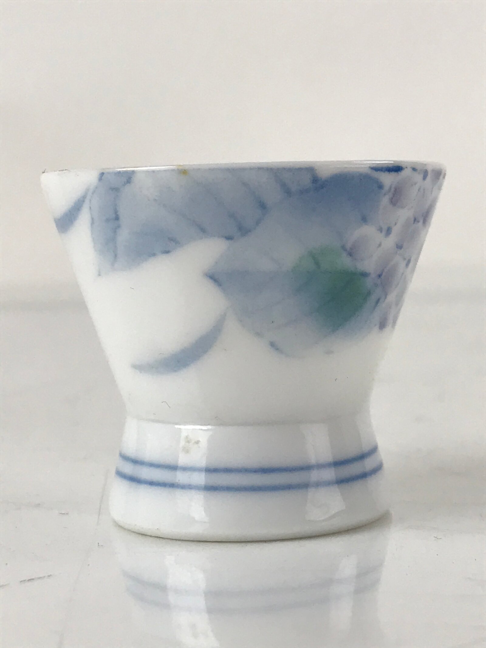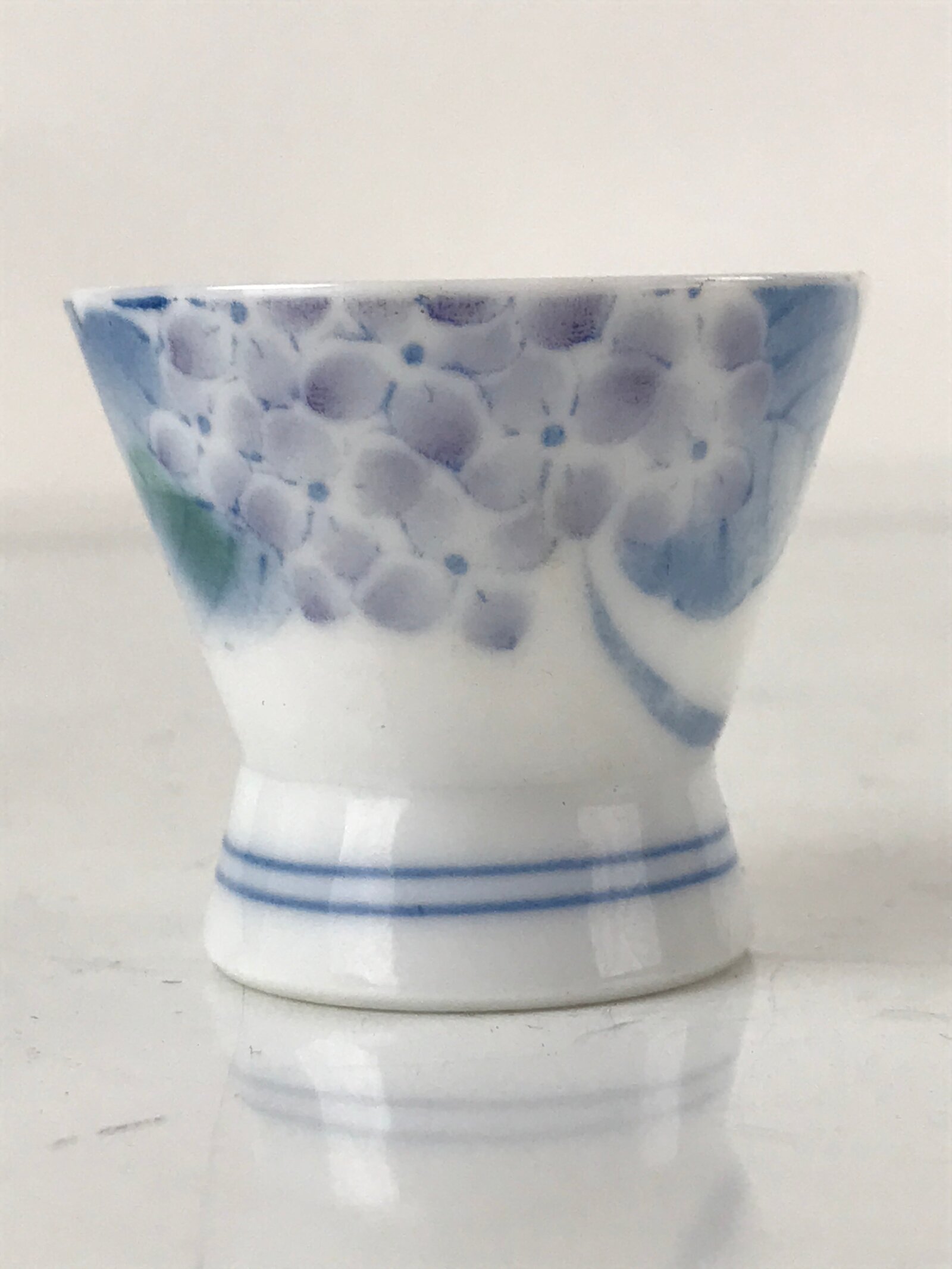 This is a vintage Japanese porcelain sake cup. This particular type of cup is called wan or “bowl type” due to its wide mouth and resemblance to a rice or tea bowl. In terms of size, it is also called ochoko. This footed cup is a stark white with purple hydrangea blooms and blue-colored leaves. The foot also has a blue double-line pattern.