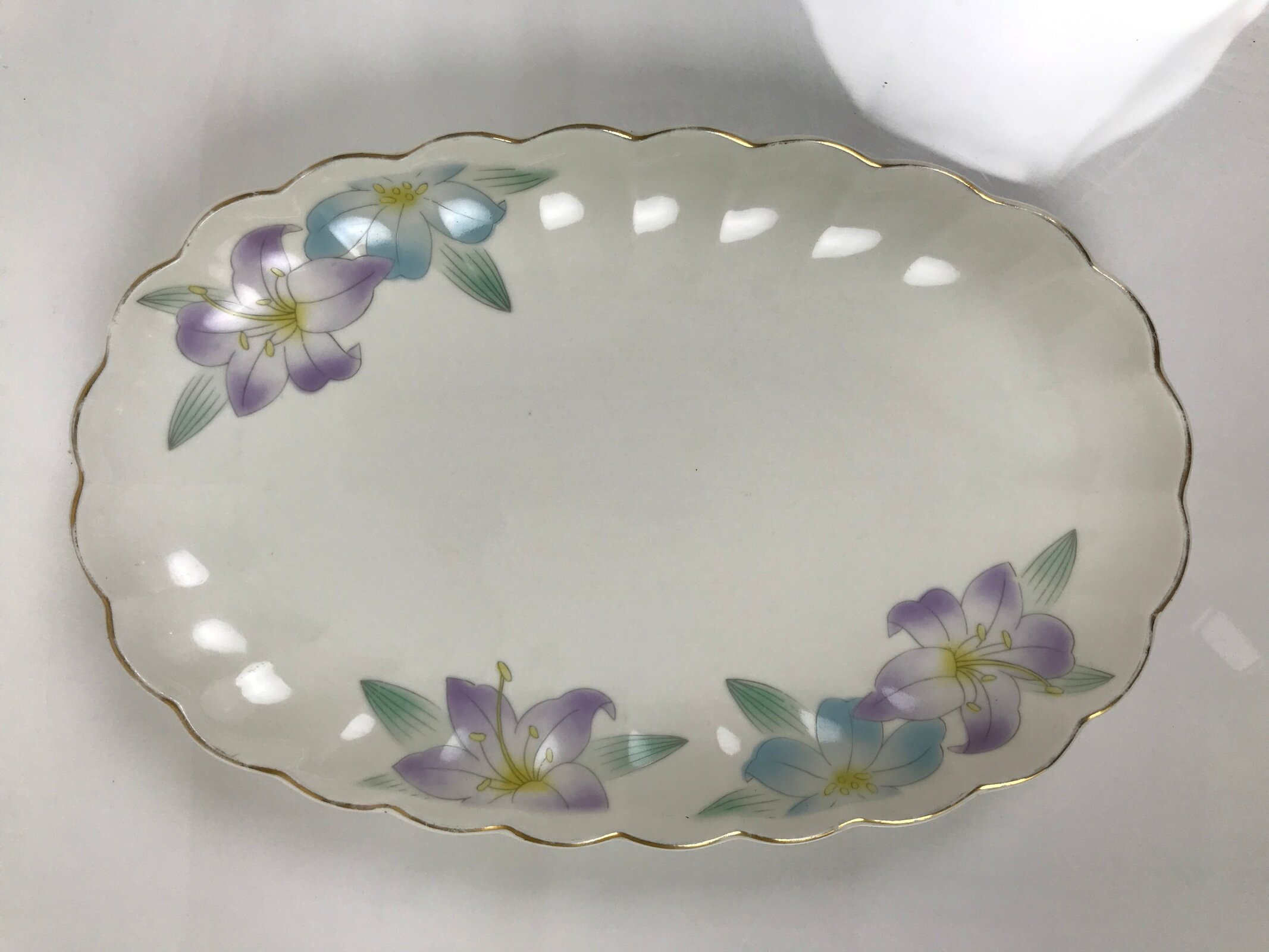 This is a vintage Japanese porcelain serving plate. It is white and has a design of purple and blue lilies, and a gold line on the rim. The shape is oval with a raised side, and the rim is wavy like the petals of a chrysanthemum, which is called kikuzara. It is great for serving side dishes, desserts, and other light dishes.