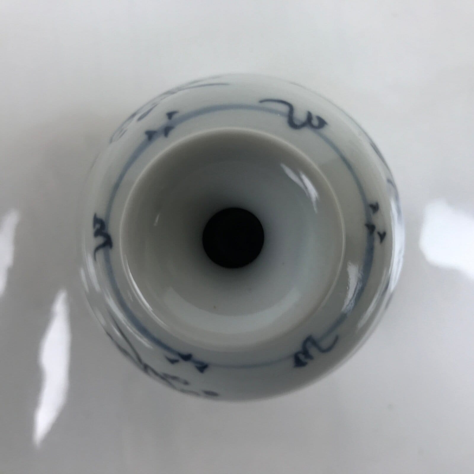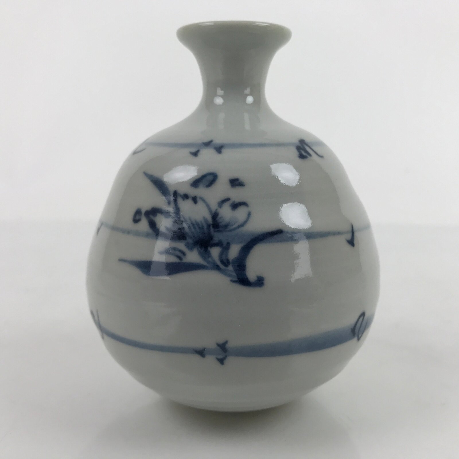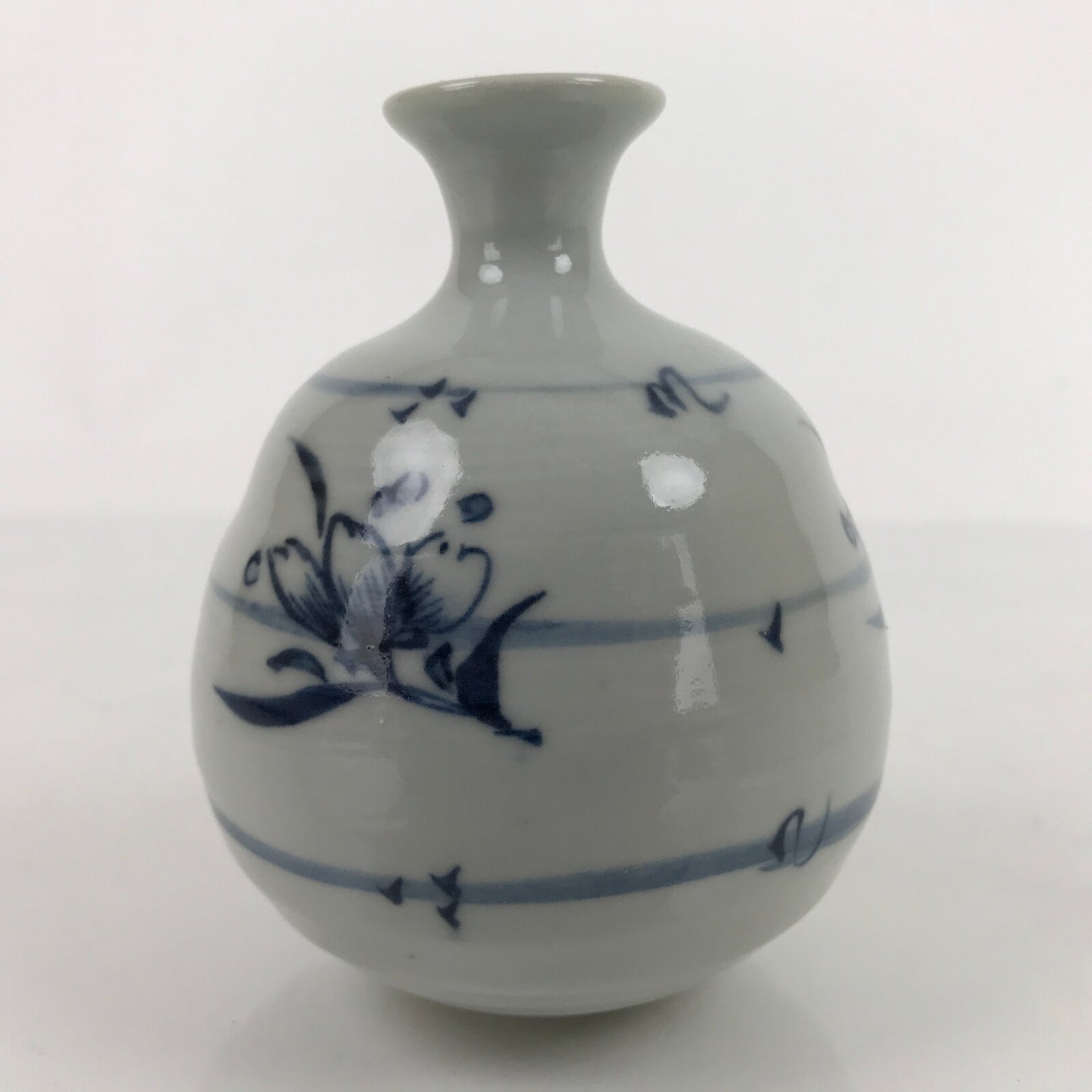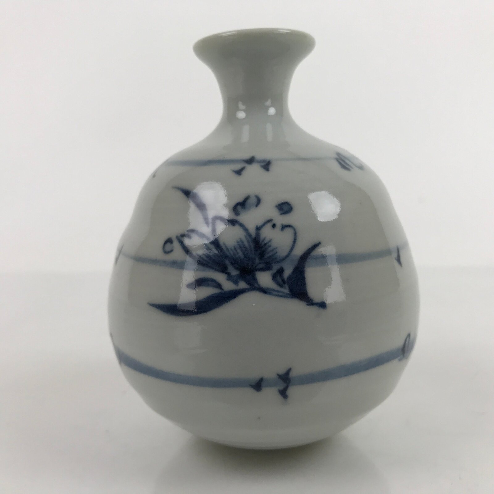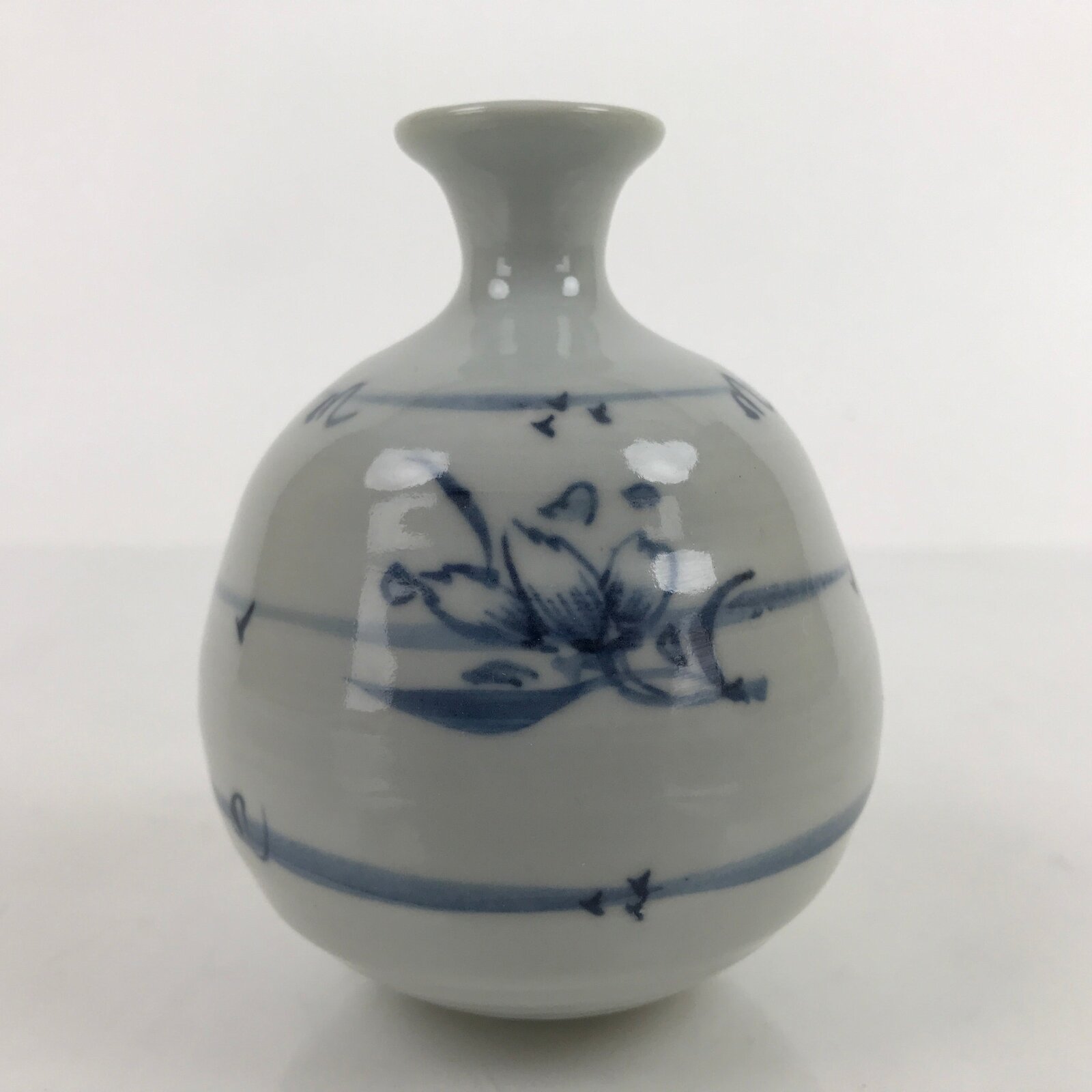 This is a vintage Japanese porcelain flower vase, or kabin. With a spherical base and a white and blue sometsuke design of flowers and flying petals, this beautiful vase is small enough for a single flower (ichirin zashi). There is a maker’s stamp on the bottom.