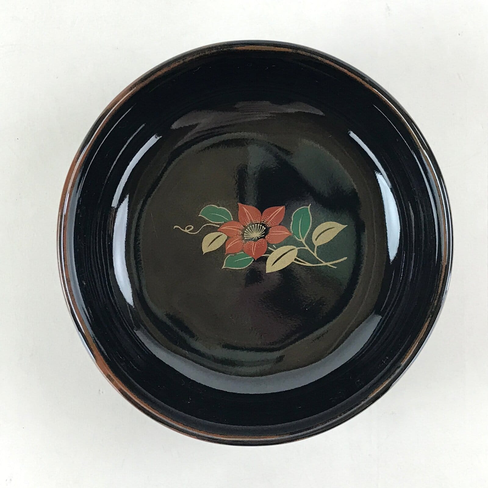 This is a vintage Japanese porcelain small bowl (Kobachi or Hachi). This black bowl is adorned with a red flower design centered and is edged in brown. It has an ideal size for containing soup or other small foods.