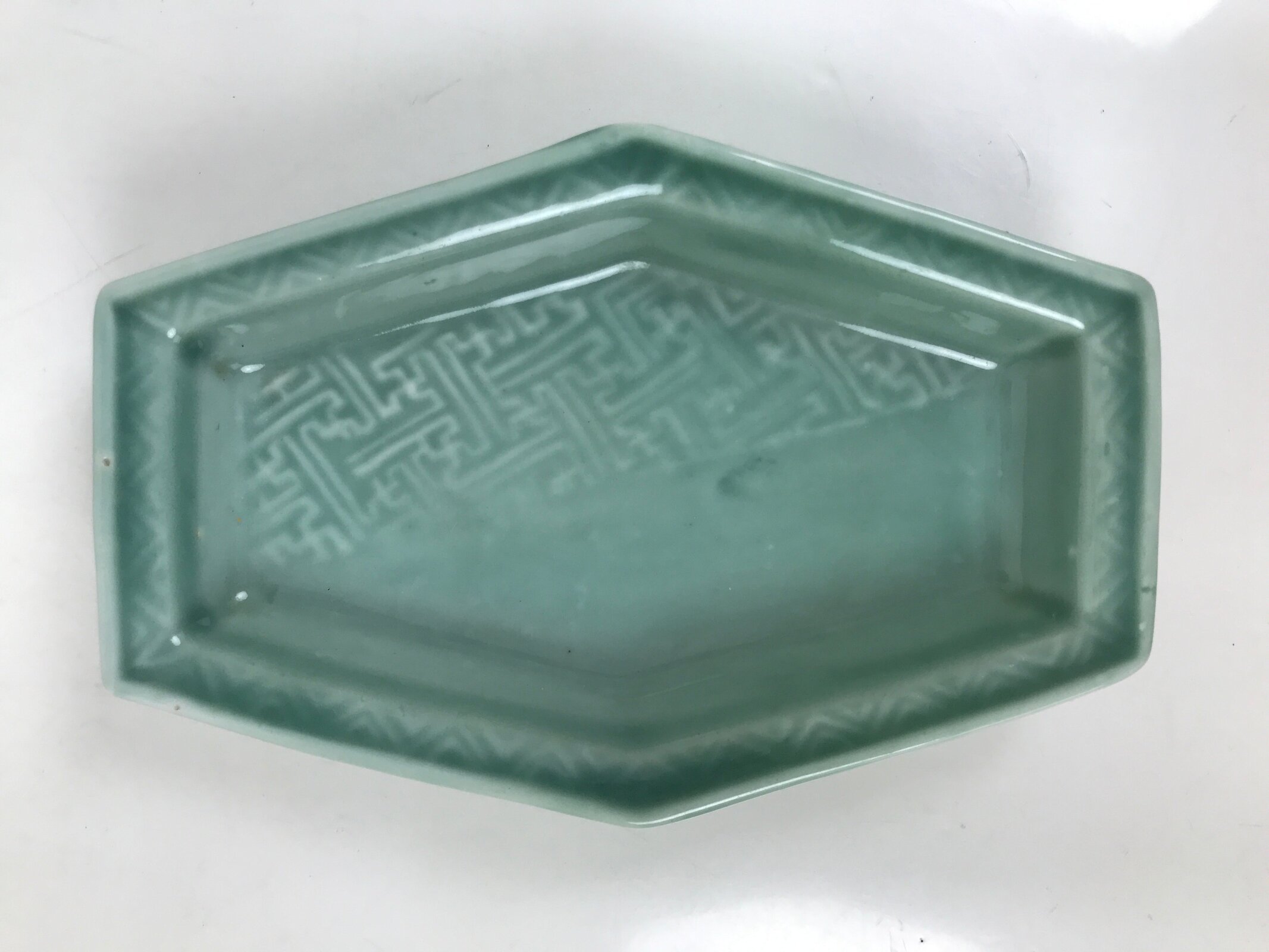 This antique Japanese small narrow hexagonal plate is made of a sturdy porcelain and has a smooth celadon green glaze. The overall design features a slighty raised sayagata pattern. Sayagata is a Buddhist-derived geometric pattern that uses the manji symbol. This type of plate is called kozara and is the perfect size to serve side dishes in a Japanese meal set.
