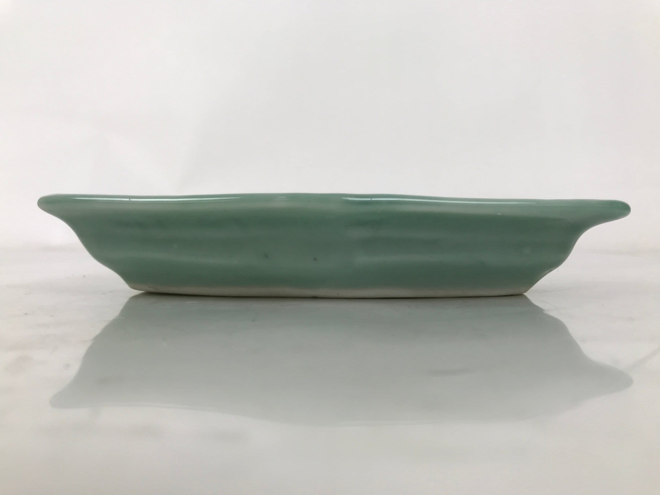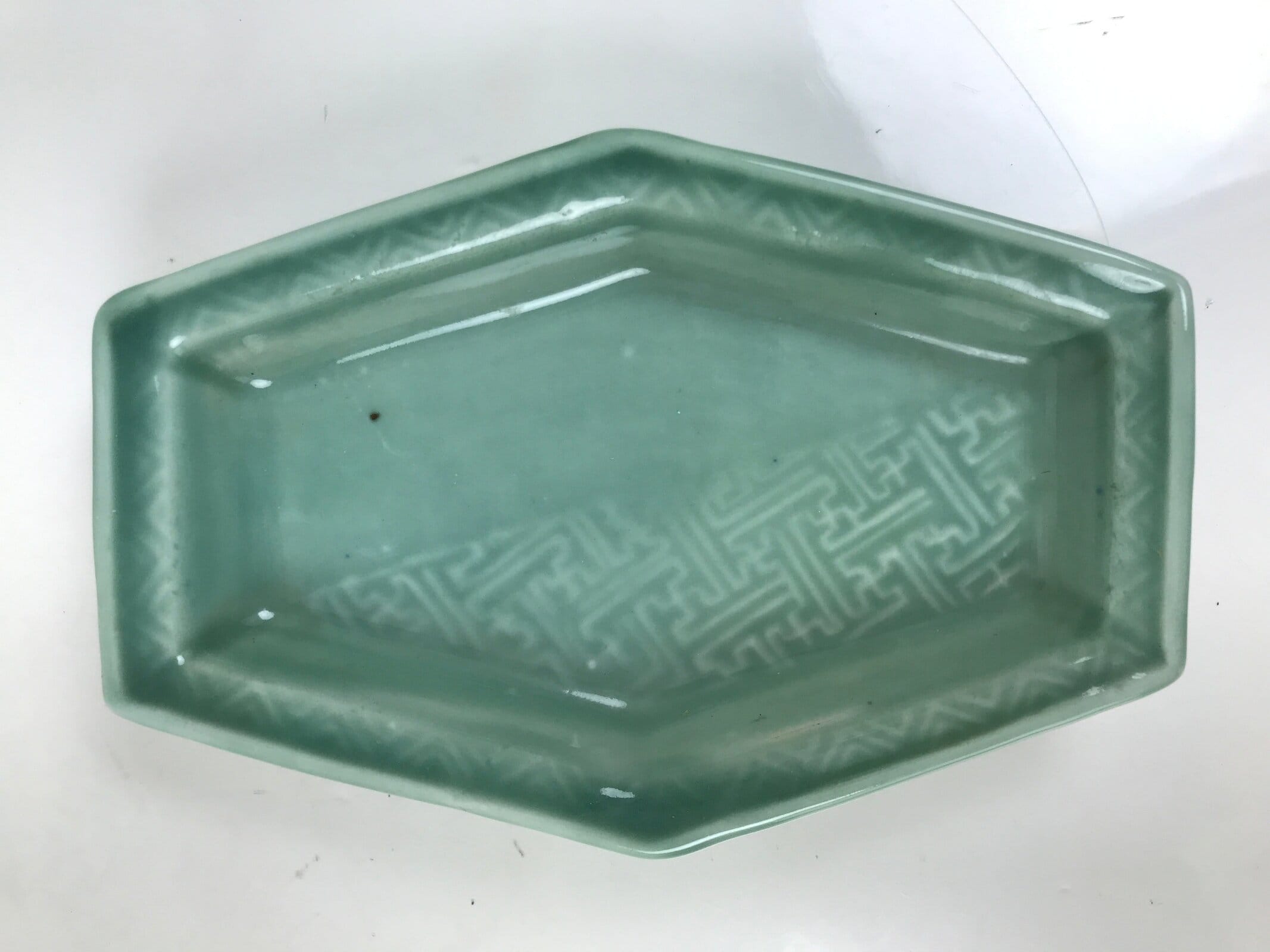 This antique Japanese small narrow hexagonal plate is made of a sturdy porcelain and has a smooth celadon green glaze. The overall design features a slighty raised sayagata pattern. Sayagata is a Buddhist-derived geometric pattern that uses the manji symbol. This type of plate is called kozara and is the perfect size to serve side dishes in a Japanese meal set.