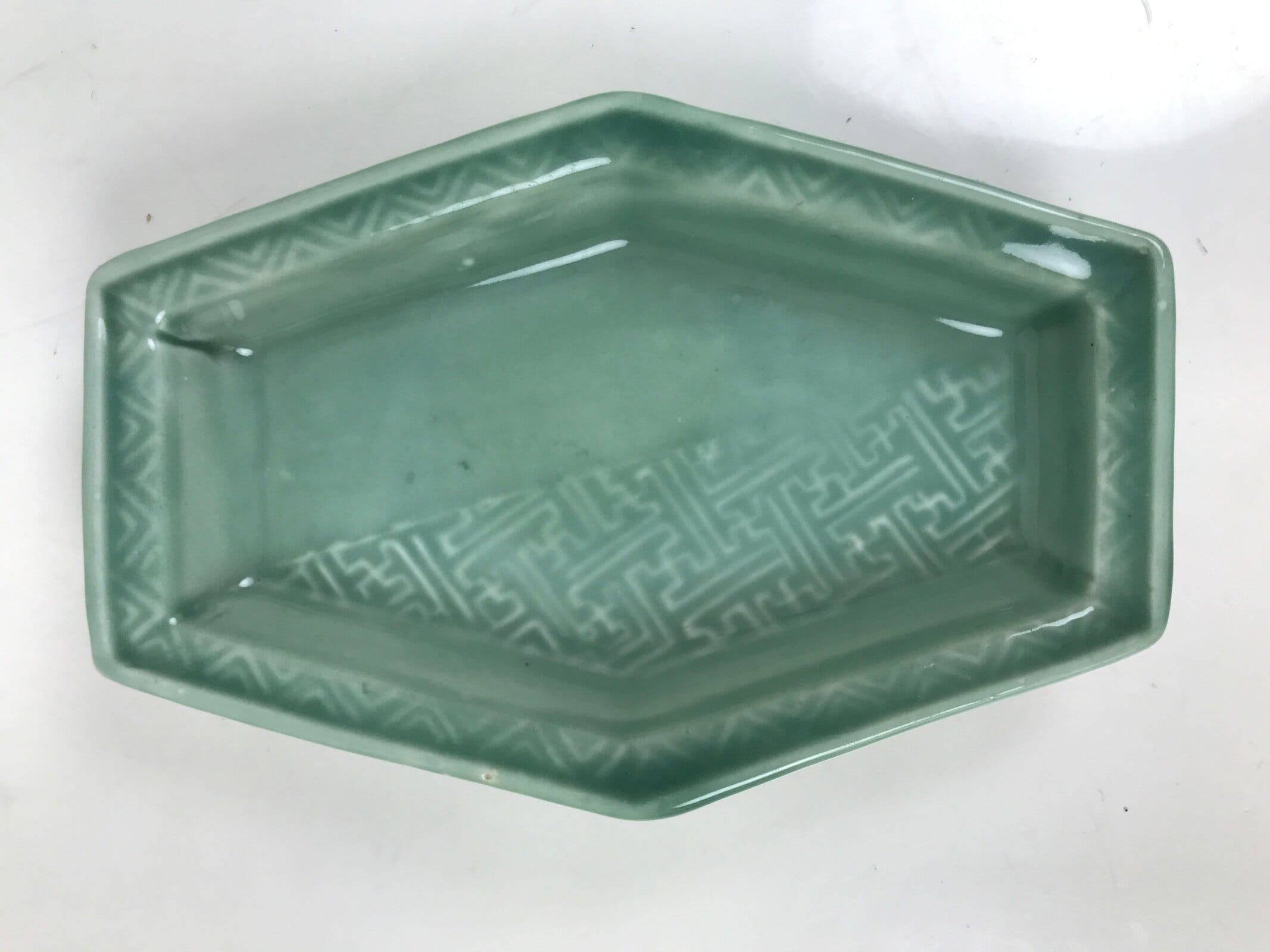 This antique Japanese small narrow hexagonal plate is made of a sturdy porcelain and has a smooth celadon green glaze. The overall design features a slighty raised sayagata pattern. Sayagata is a Buddhist-derived geometric pattern that uses the manji symbol. This type of plate is called kozara and is the perfect size to serve side dishes in a Japanese meal set.