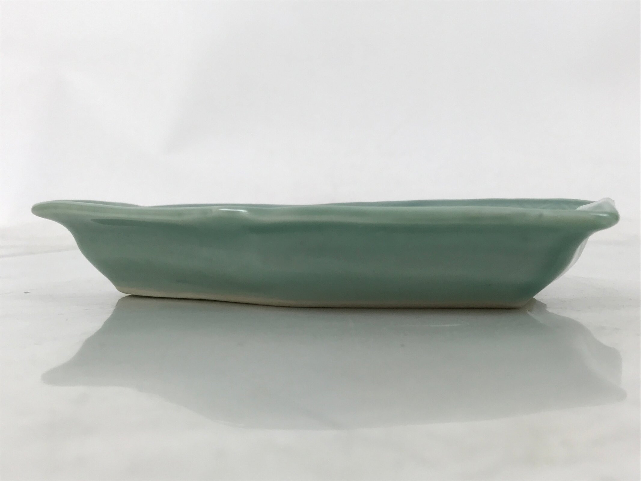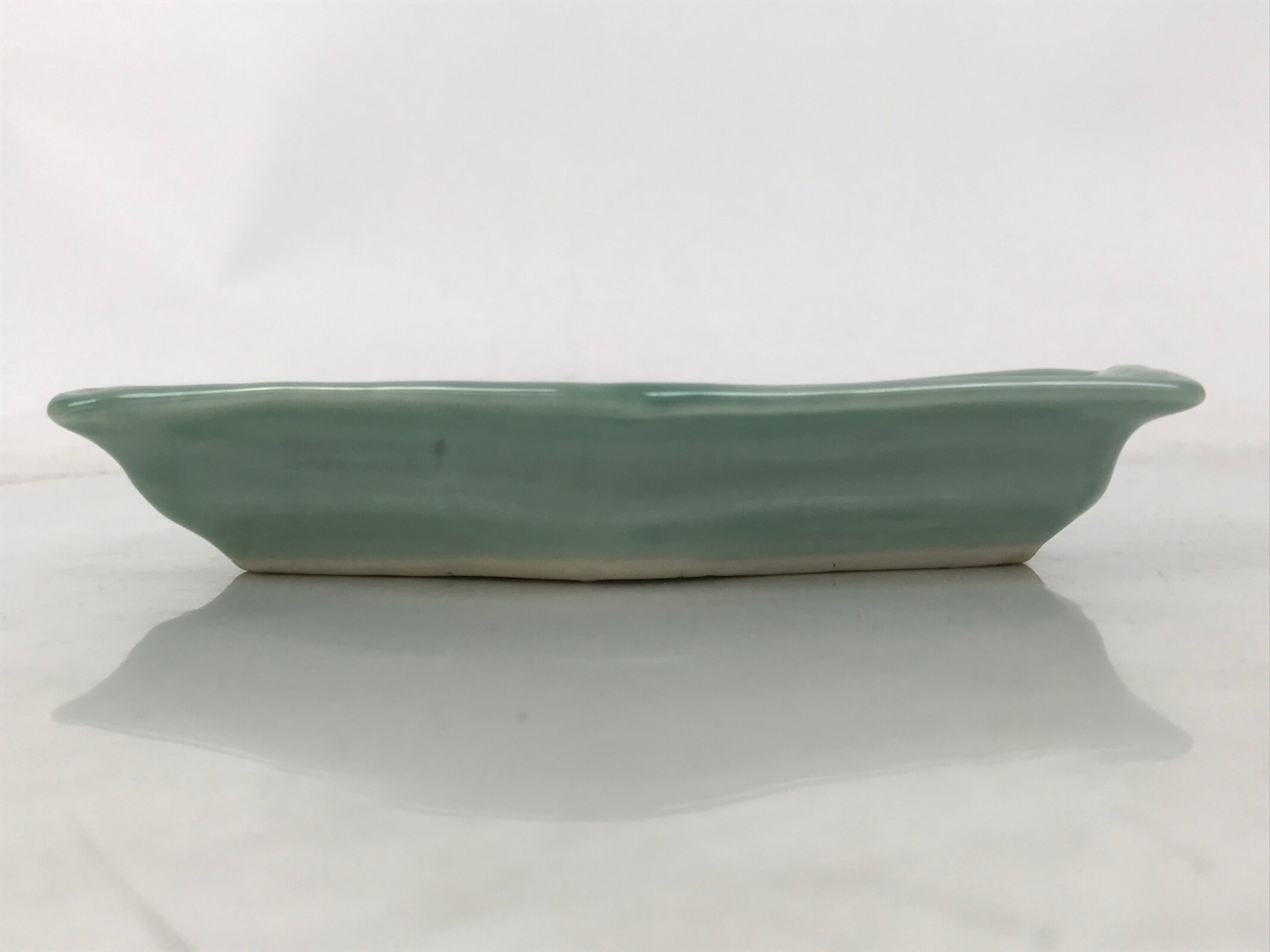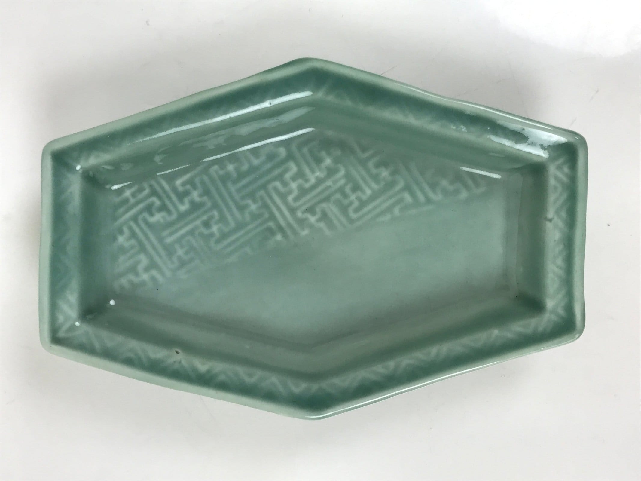 This antique Japanese small narrow hexagonal plate is made of a sturdy porcelain and has a smooth celadon green glaze. The overall design features a slighty raised sayagata pattern. Sayagata is a Buddhist-derived geometric pattern that uses the manji symbol. This type of plate is called kozara and is the perfect size to serve side dishes in a Japanese meal set.