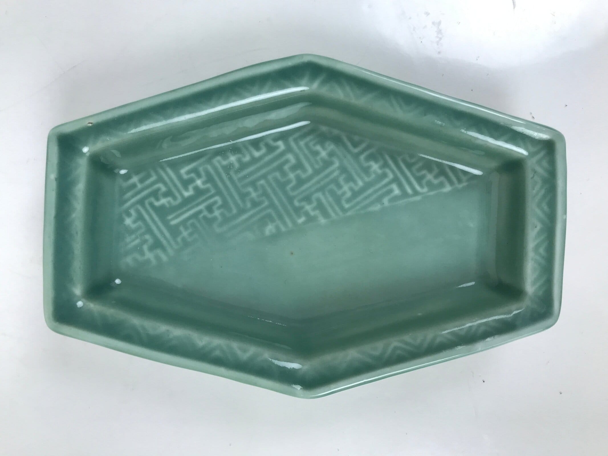 This antique Japanese small narrow hexagonal plate is made of a sturdy porcelain and has a smooth celadon green glaze. The overall design features a slighty raised sayagata pattern. Sayagata is a Buddhist-derived geometric pattern that uses the manji symbol. This type of plate is called kozara and is the perfect size to serve side dishes in a Japanese meal set.