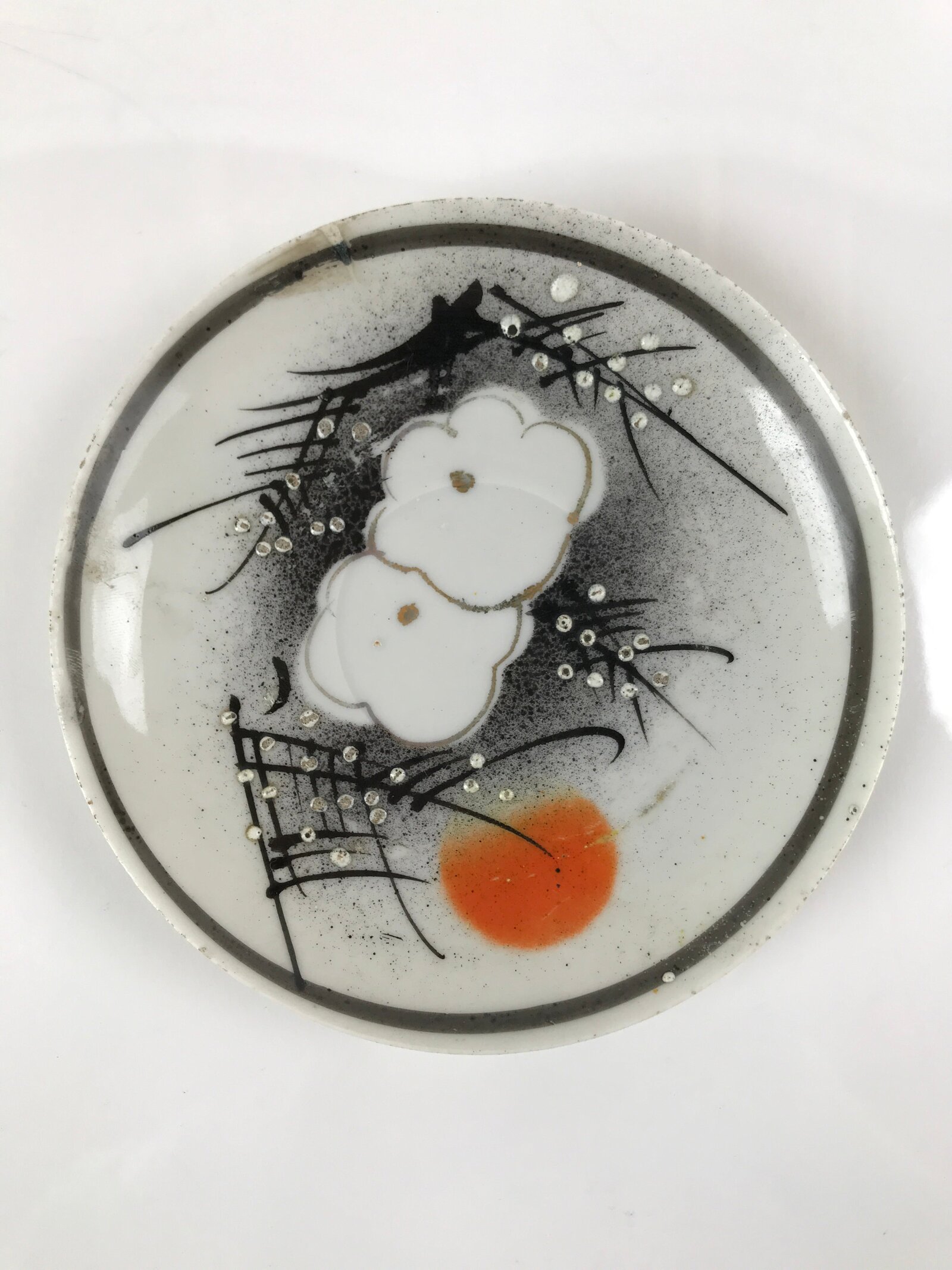 Japanese Porcelain Small Plate Kozara Vtg Plum Blossom Sun Black White PY683