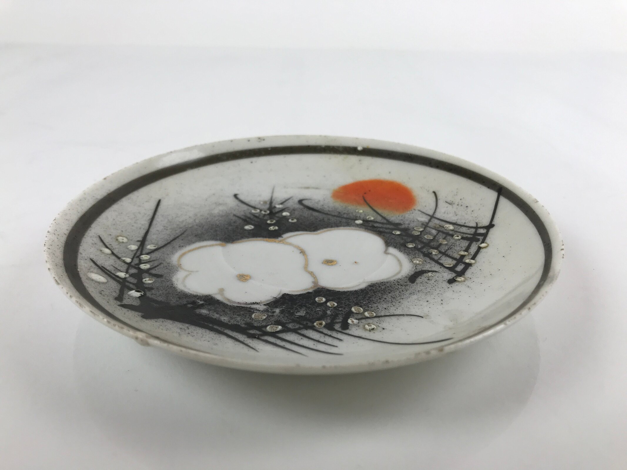 This item is a vintage Japanese porcelain small plate, or Kozara. White with a black border, this delicate, handcrafted plate features lush white and gold plum blossoms (ume) on black branches with an orange sun. It has raised bumps where flower buds on the branches are. Plum blossoms bloom at the end of winter, and this image gives a cold winter morning sunrise feel.