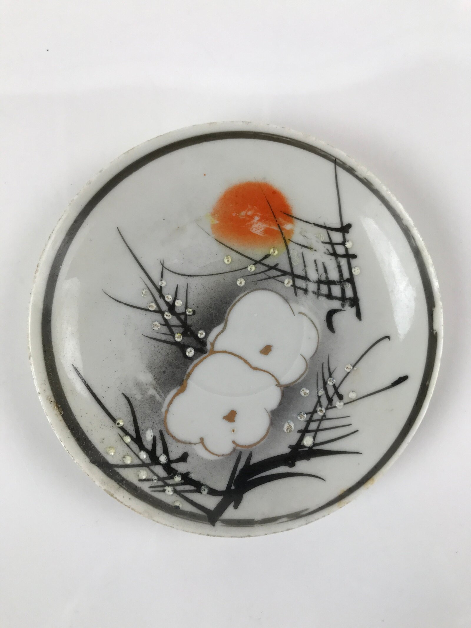 This item is a vintage Japanese porcelain small plate, or Kozara. White with a black border, this delicate, handcrafted plate features lush white and gold plum blossoms (ume) on black branches with an orange sun. It has raised bumps where flower buds on the branches are. Plum blossoms bloom at the end of winter, and this image gives a cold winter morning sunrise feel.
