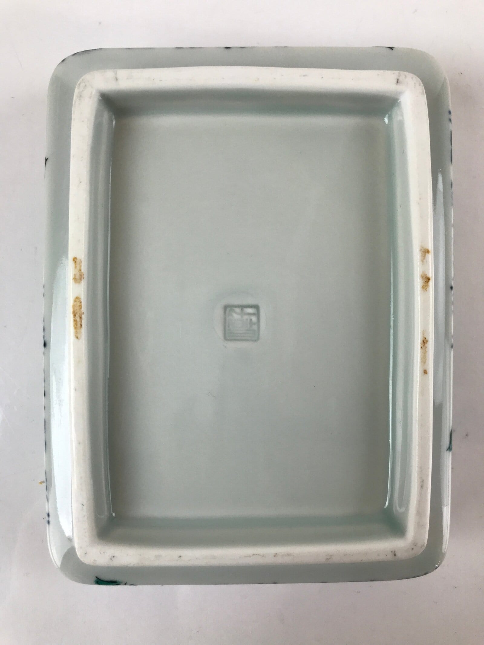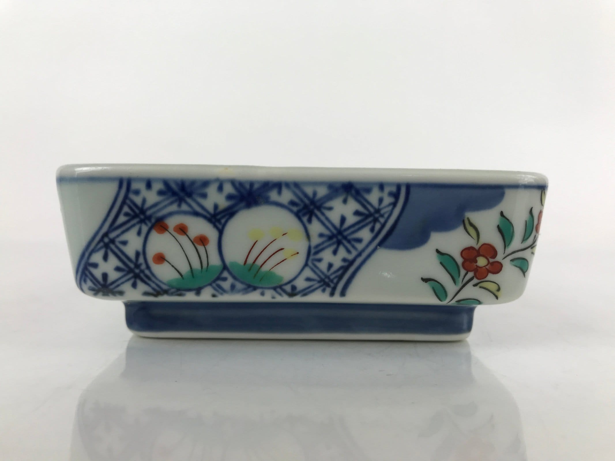 This is a vintage Japanese porcelain plate. This rectangular, small plate, also called kozara, is white with blue, red, and yellow and features floral blooms and buds on the outer sides. Kozara are often used for side dishes and serving desserts. This particular plate is most likely used for single servings of sashimi. There is a maker’s stamp on the bottom.