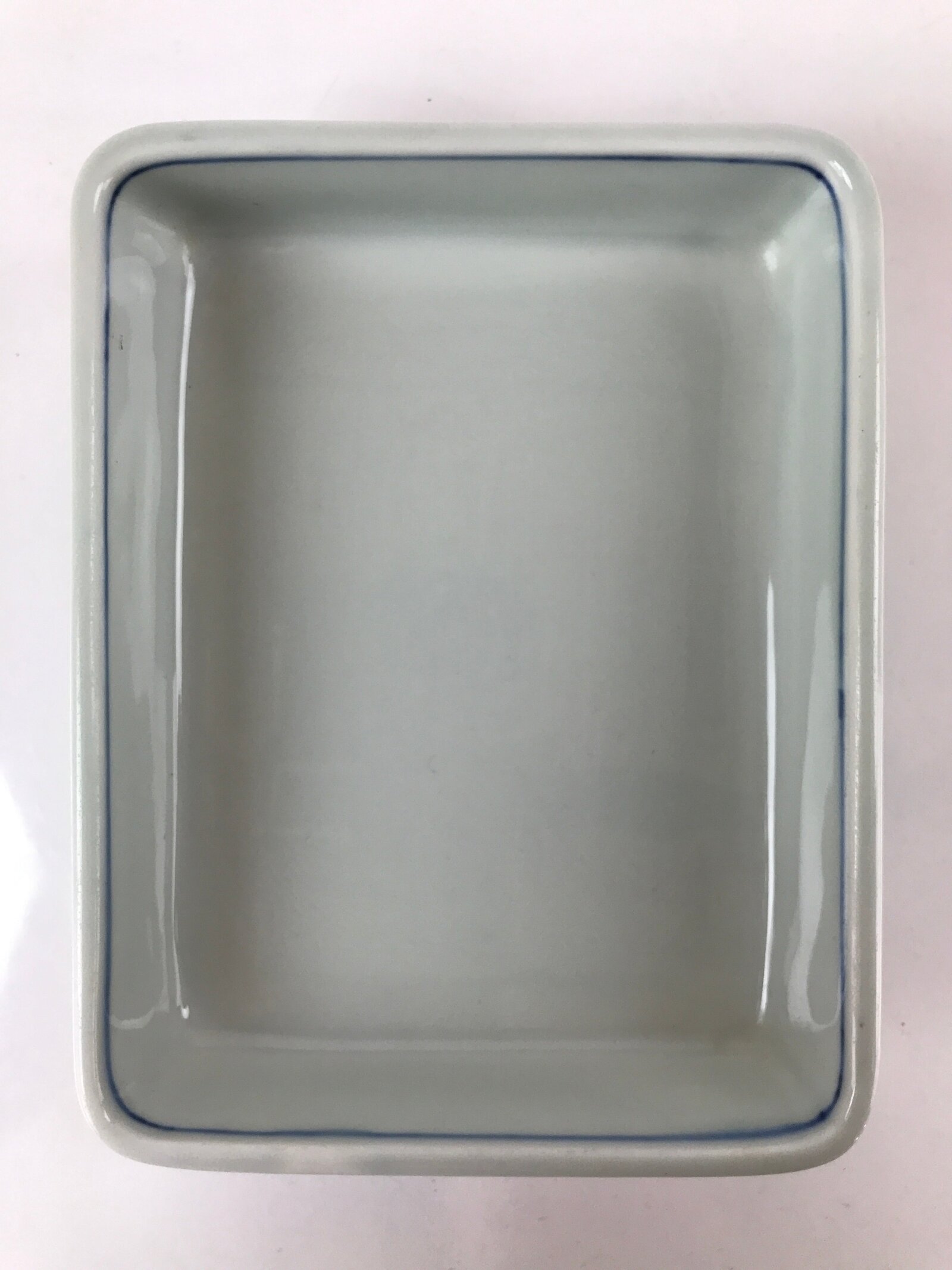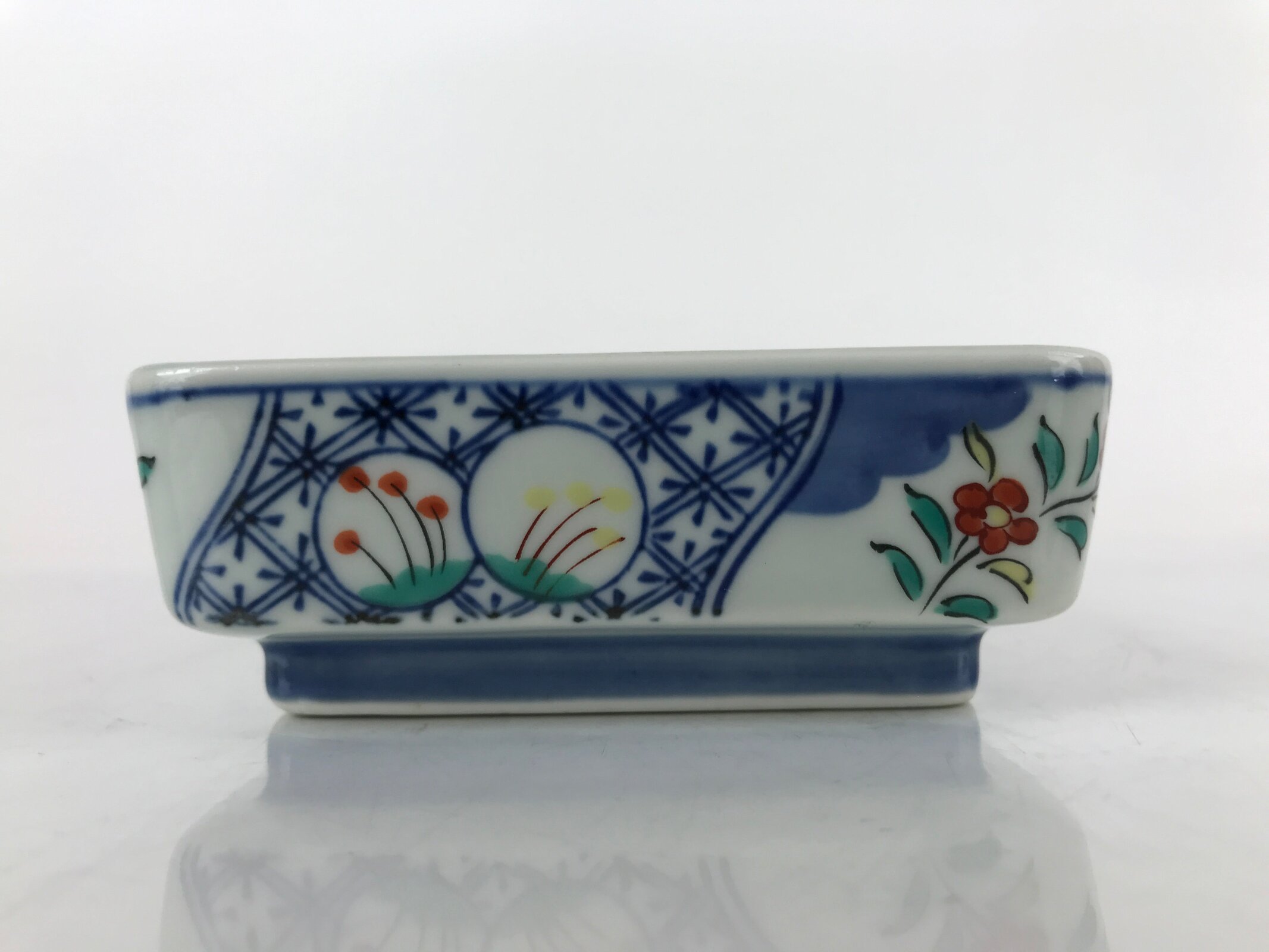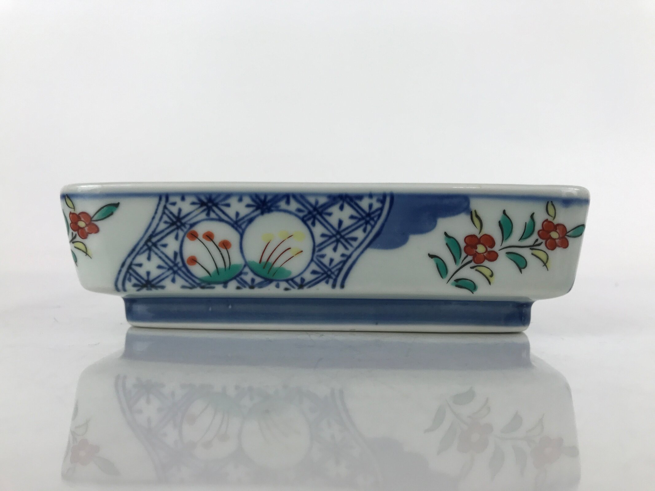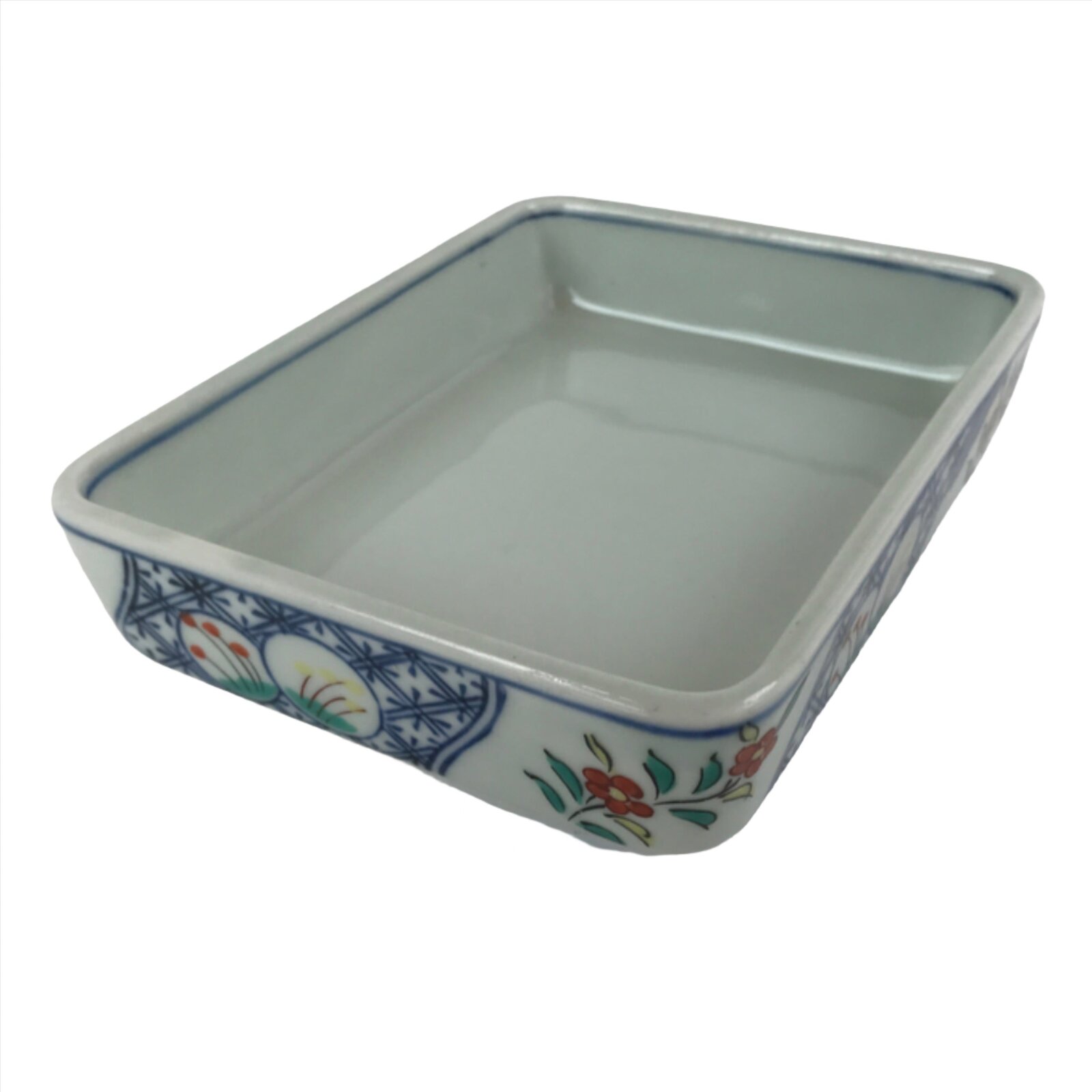 This is a vintage Japanese porcelain plate. This rectangular, small plate, also called kozara, is white with blue, red, and yellow and features floral blooms and buds on the outer sides. Kozara are often used for side dishes and serving desserts. This particular plate is most likely used for single servings of sashimi. There is a maker’s stamp on the bottom.