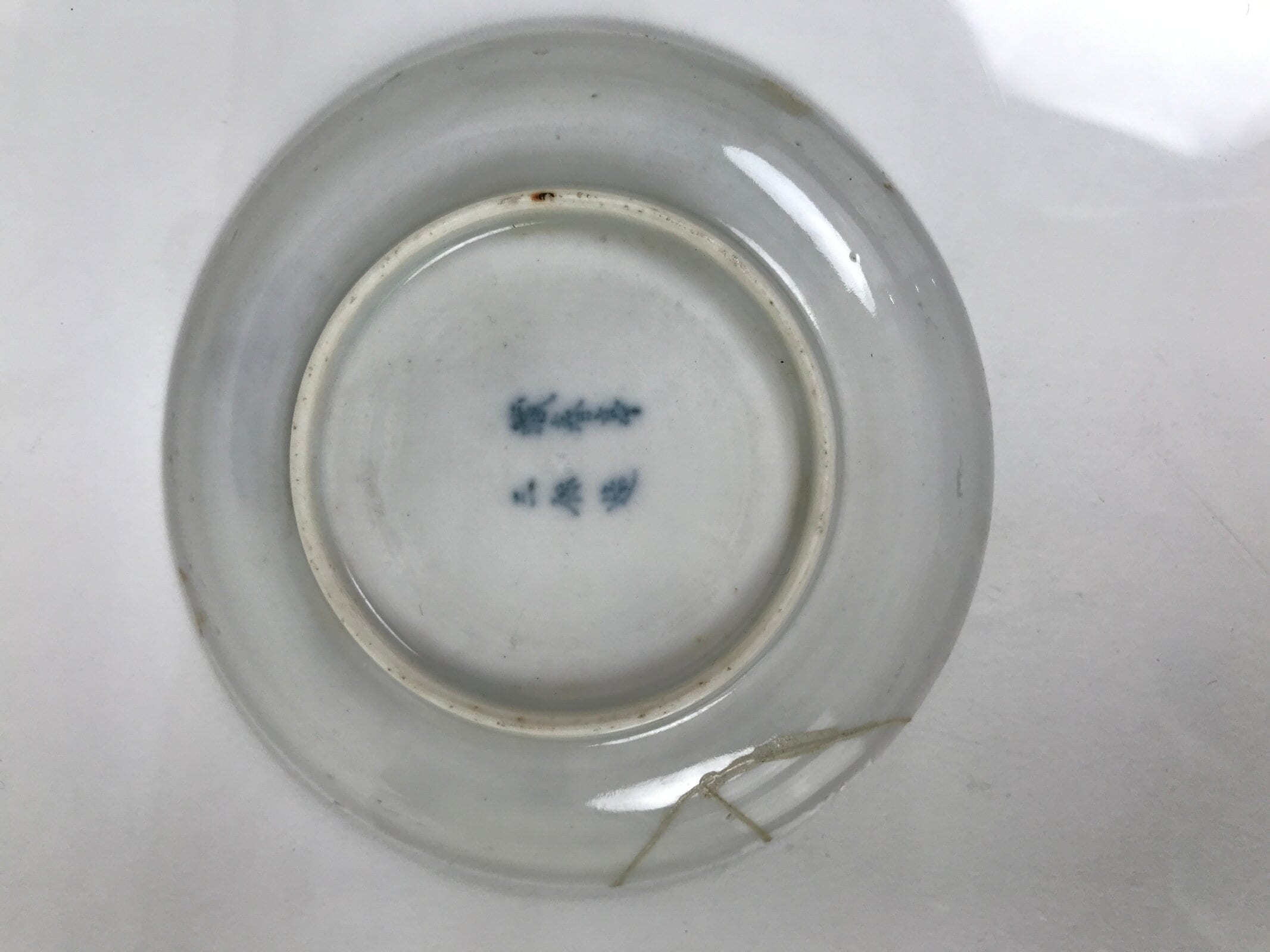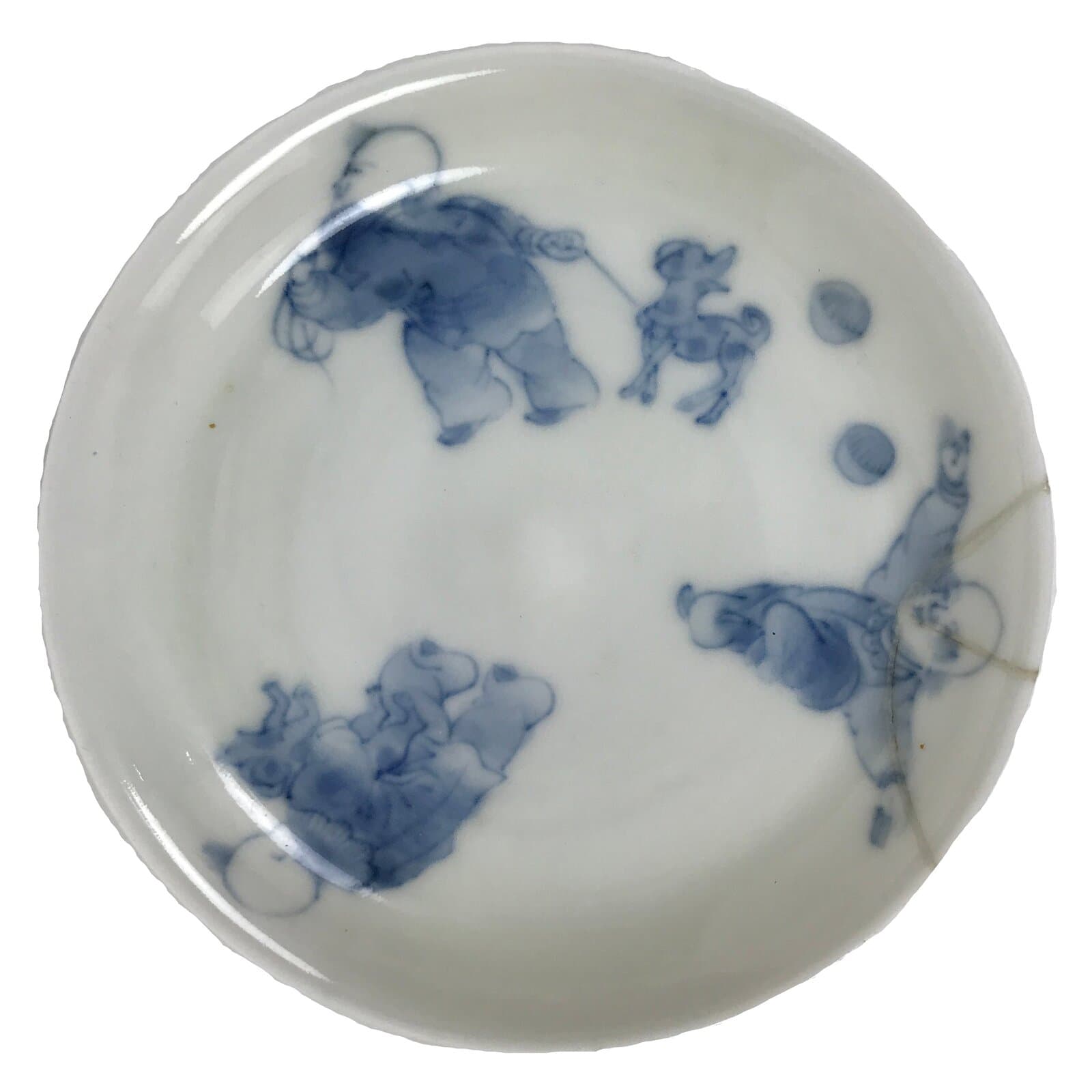 This is a vintage Japanese small porcelain plate called mamezara. Mostly white, this ultra-thin plate has a blue sometsuke design of three Tang Dynasty children (called Karako in Japanese). This Chinese-themed motif was popular in the Edo period of Japan and well into the modern era. It symbolizes longevity and health for children.