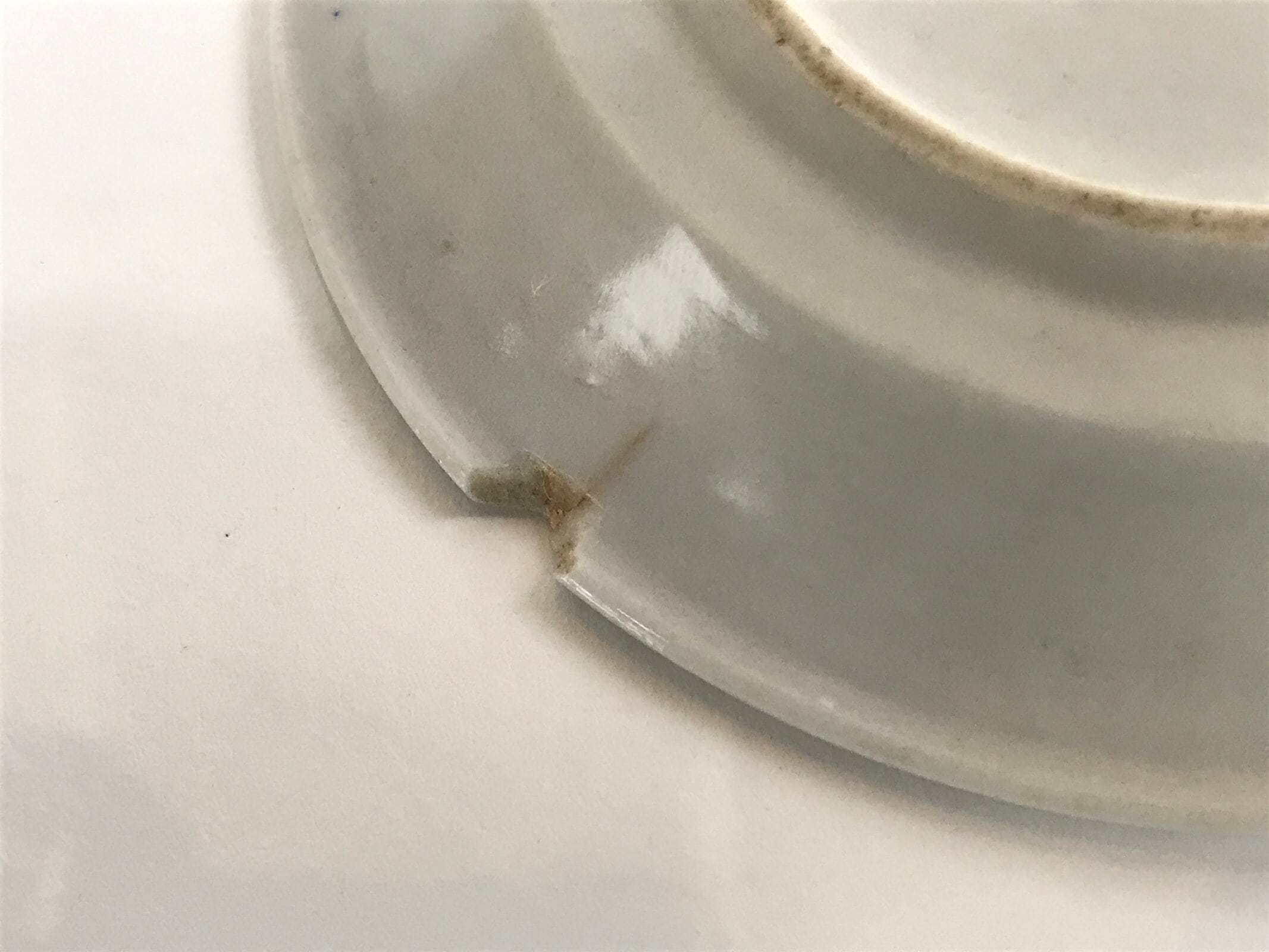 - Good condition considering age. Chips and cracks on edge. Rough blemishes in glaze from production (raised unglazed sections). Wear and tear due to age. Please see the photos carefully.