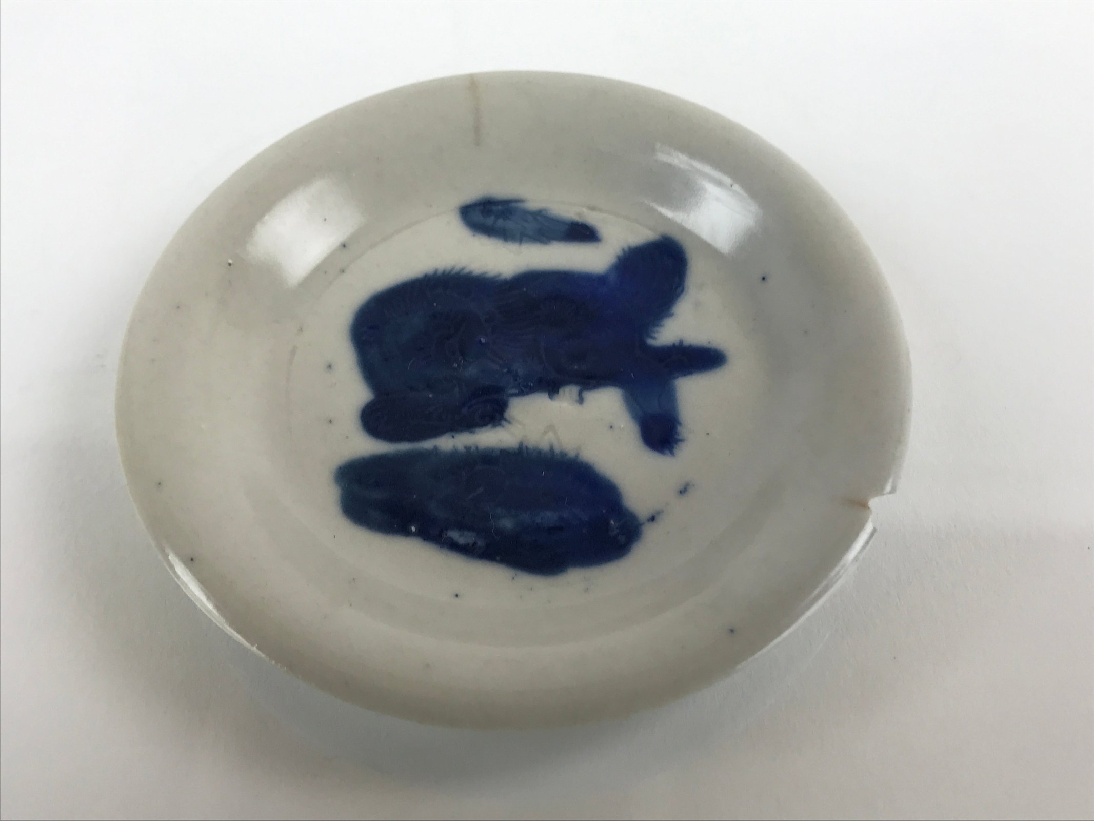 This is a vintage Japanese porcelain plate. This round small plate, also called mamezara, is sometsuke (white porcelain with indigo blue), has the image of a shishi lion in the center. Mamezara are tiny plates in a Japanese tableware set that typically hold dipping sauces such as soy sauce, garnishes, and other condiments. It is also the perfect size for holding small jewelry.