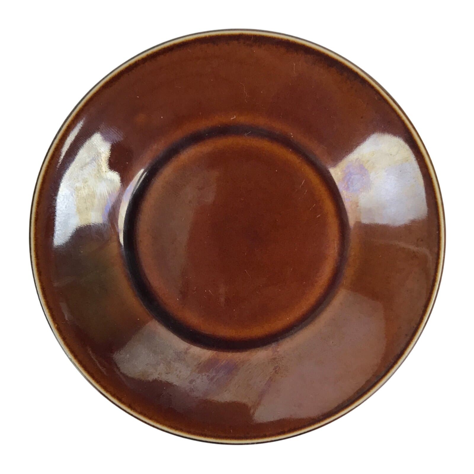 This is a vintage Japanese porcelain plate. This round, simple small plate, also called mamezara, is a dark brown with no added details. Mamezara are tiny plates in a Japanese tableware set that typically hold dipping sauces such as soy sauce, garnishes, and other condiments. It is also the perfect size for holding small jewelry.