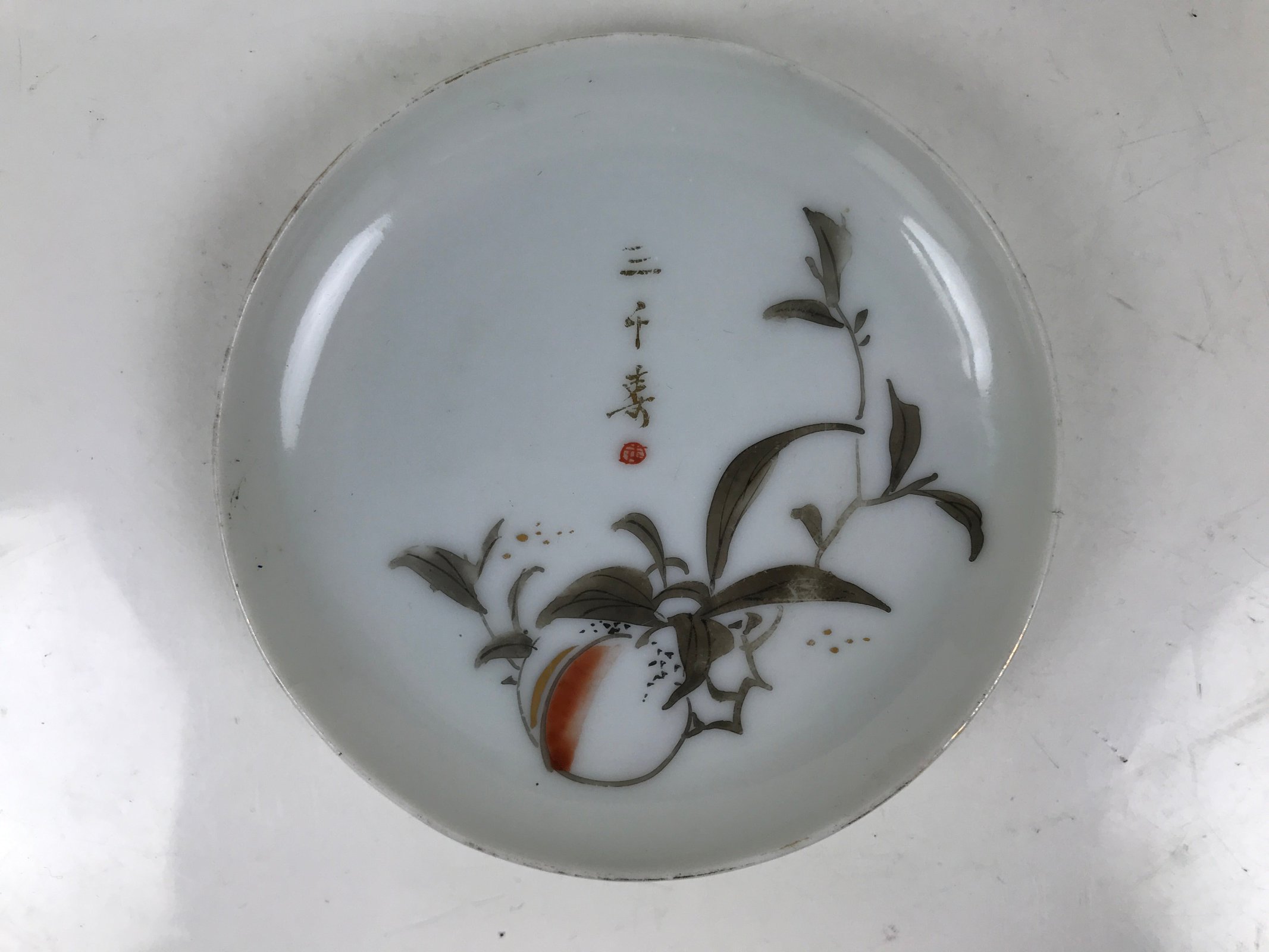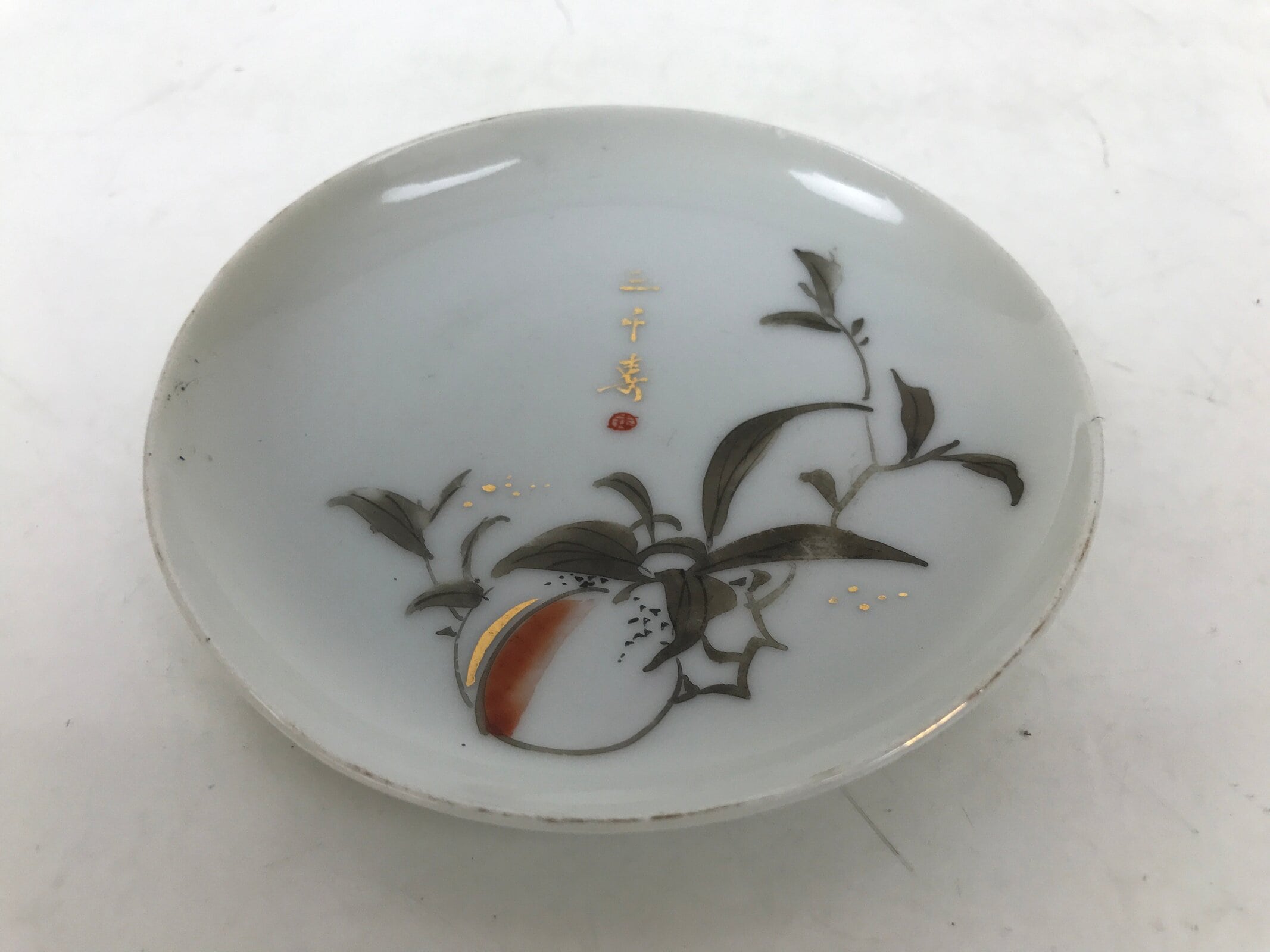 This is a vintage Japanese tiny porcelain plate. Mostly white with gold kanji characters and accents, this piece features a peach with stem and leaves.