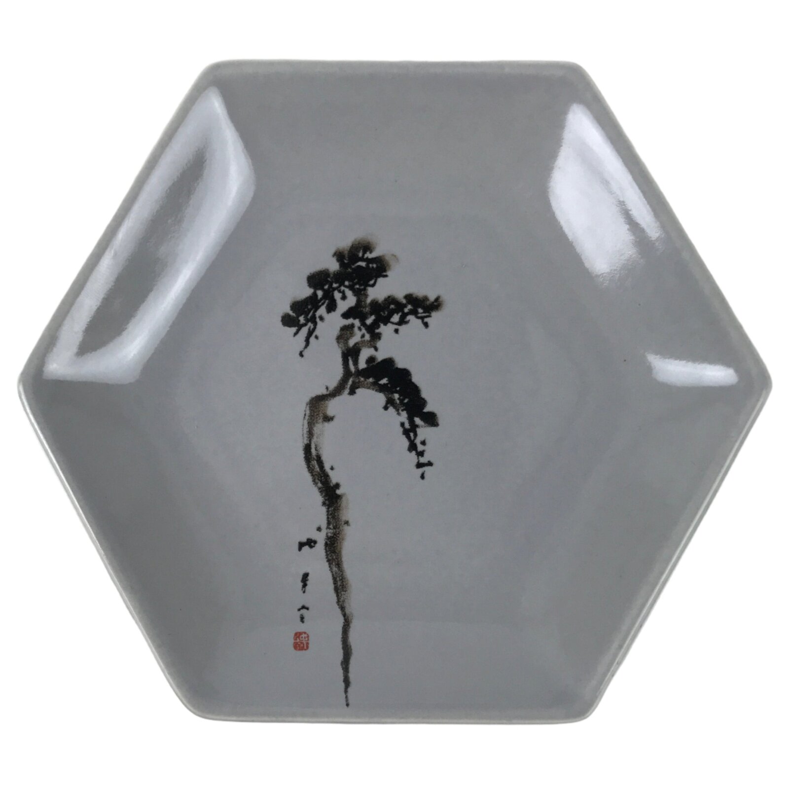 This vintage Japanese small hexagonal plate is made of porcelain and has a smooth gray glaze. The overall design features a black, printed pine tree. This type of plate is called meimeizara and is the perfect size to serve wagashi, traditional Japanese sweets. It also serves as a plate for side dishes in a Japanese meal set.
