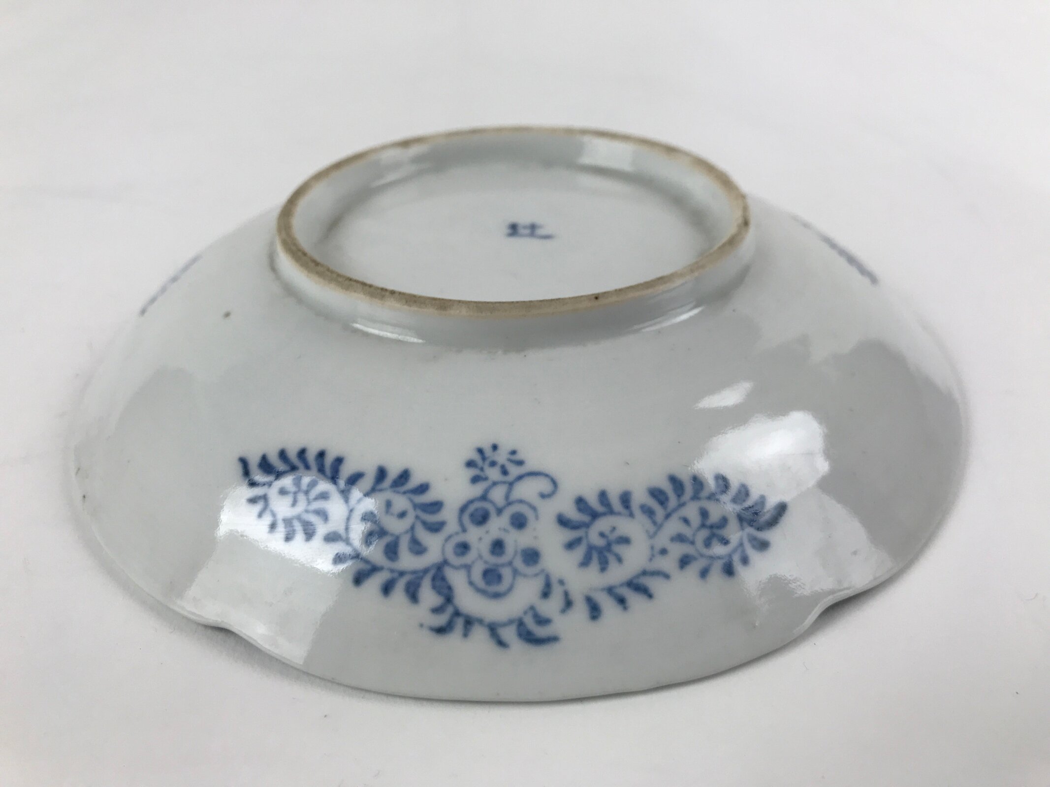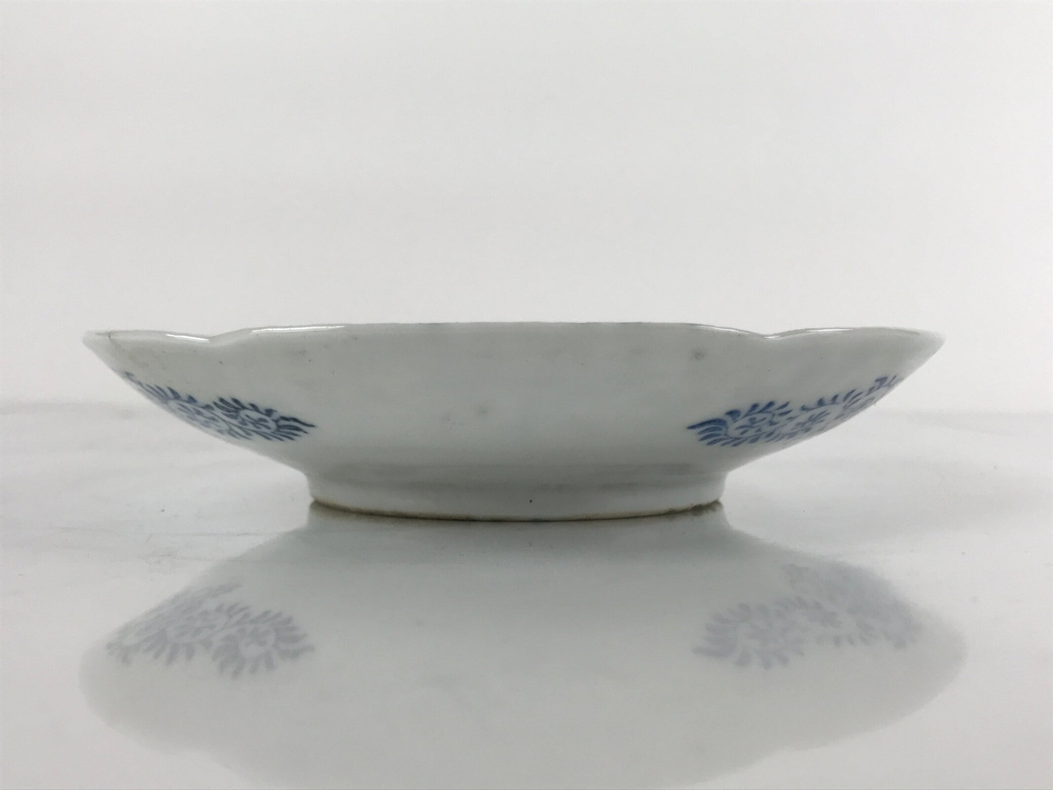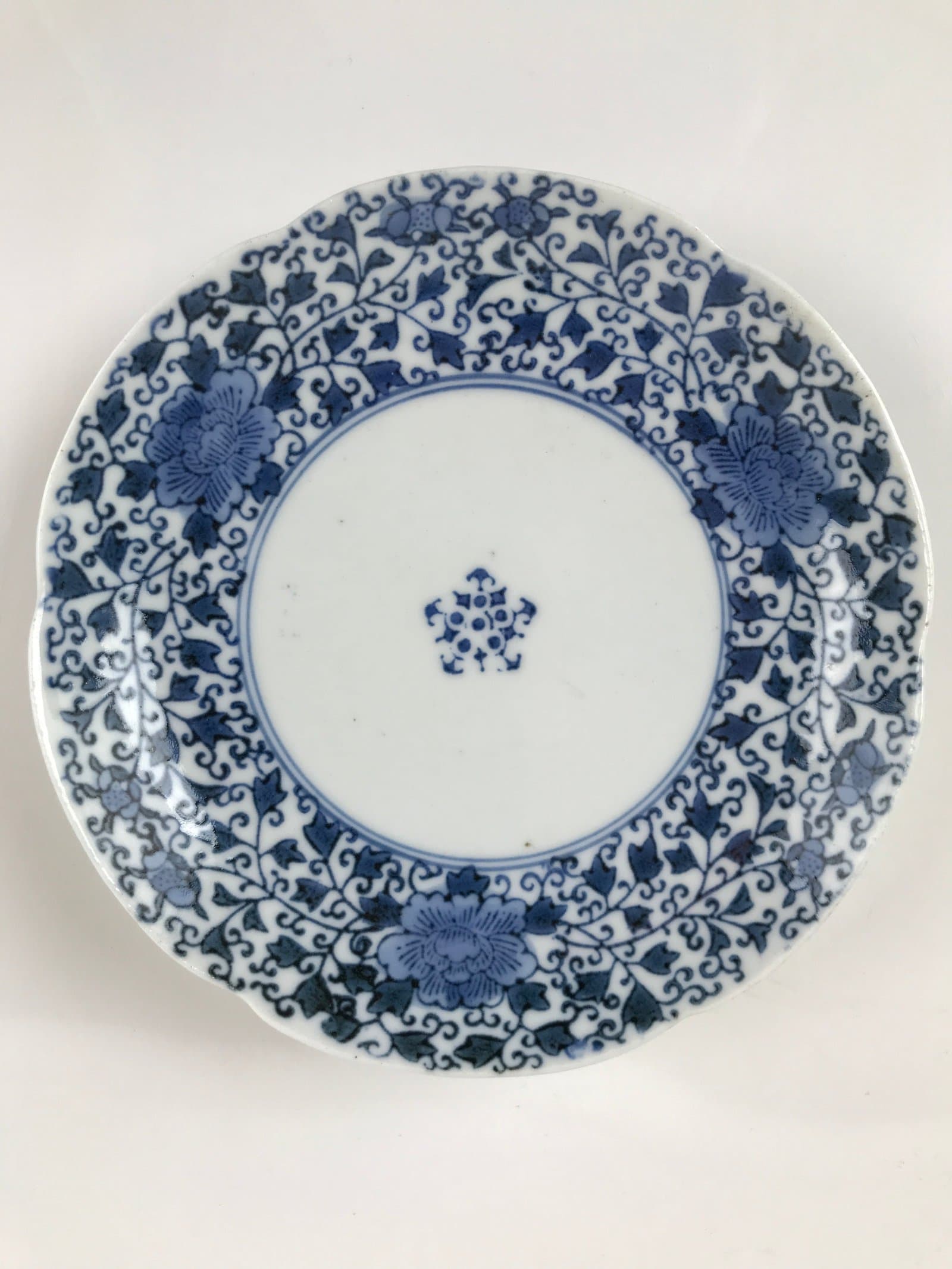 This item is a vintage Japanese porcelain small plate, or Kozara. White with a blue design of vines and peony blossoms, this sometsuke plate is the perfect size to serve small food and desserts. It has a decorative scalloped edge and floral design on the back side as well.