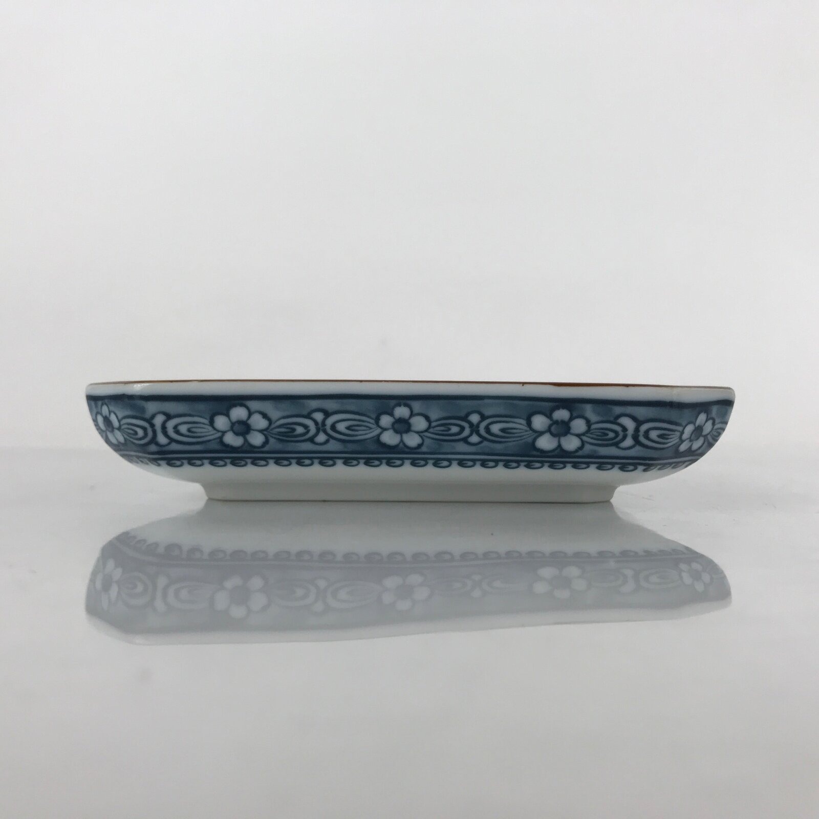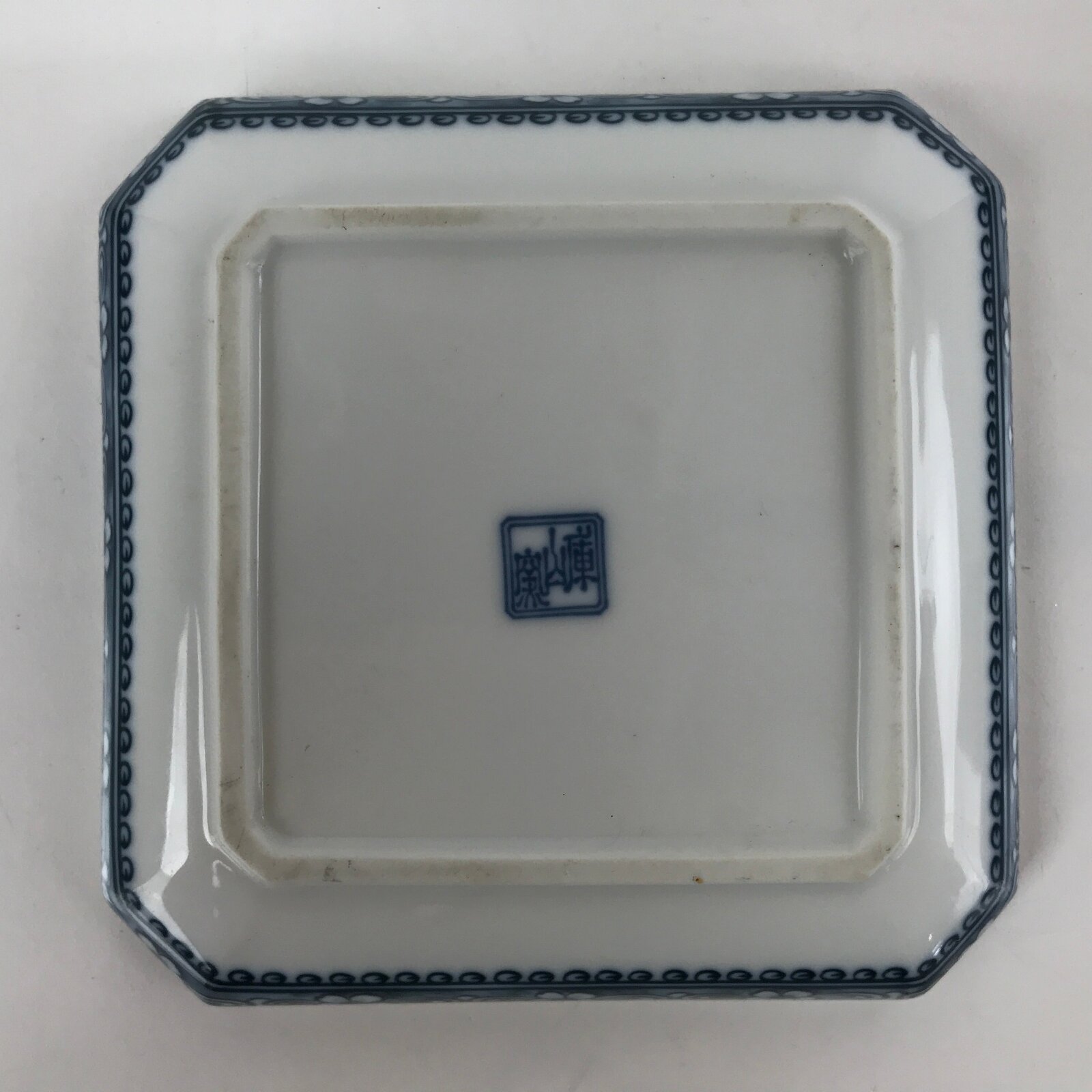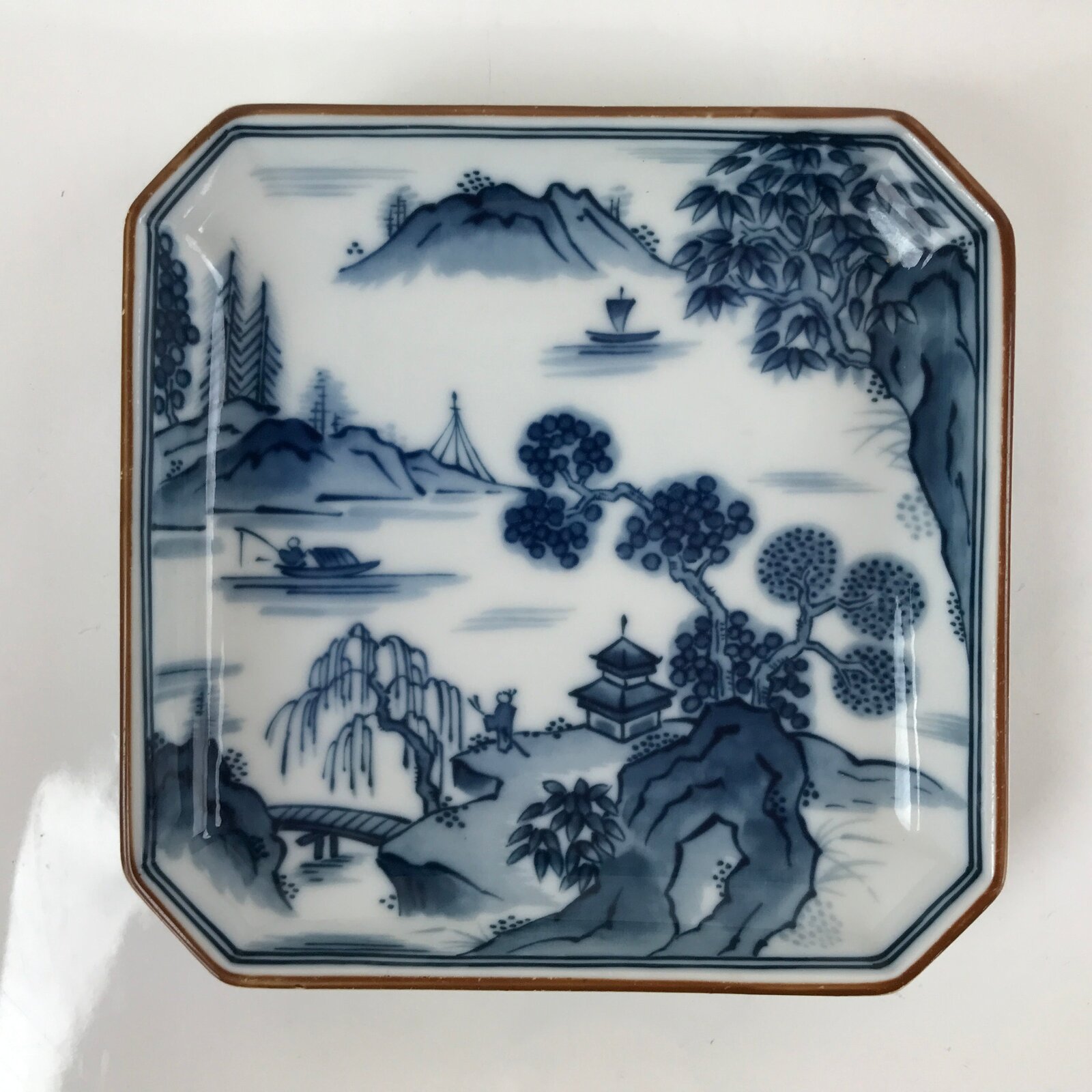 This is a vintage Japanese porcelain small plate. This square plate with squared corners is sometsuke (white porcelain with indigo blue design) with a brown edge. It has a beautiful mountain and river design with a fisherman, pagoda, and various trees. The underside has a blue floral pattern border. There is a blue maker’s mark on the back.