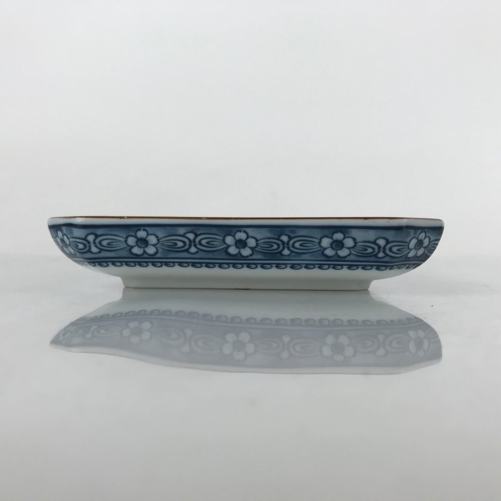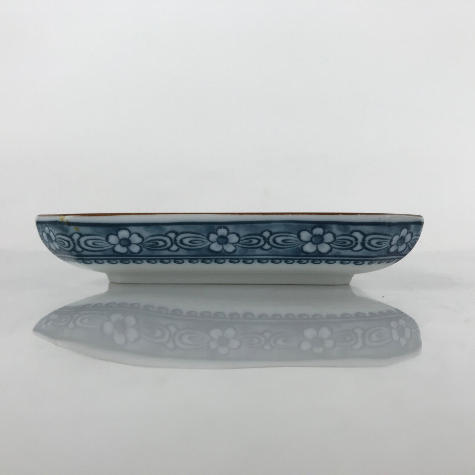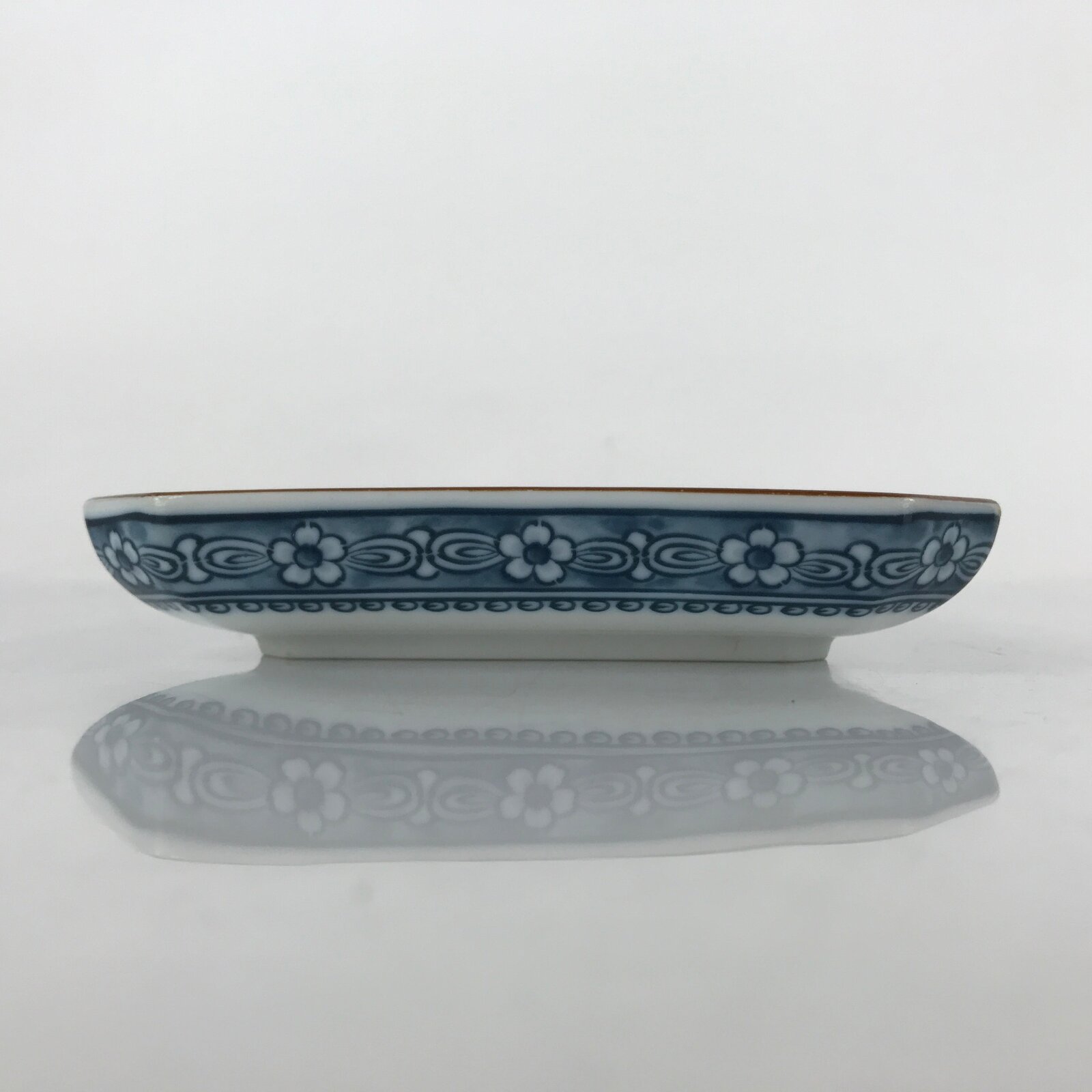 This is a vintage Japanese porcelain small plate. This square plate with squared corners is sometsuke (white porcelain with indigo blue design) with a brown edge. It has a beautiful mountain and river design with a fisherman, pagoda, and various trees. The underside has a blue floral pattern border. There is a blue maker’s mark on the back.