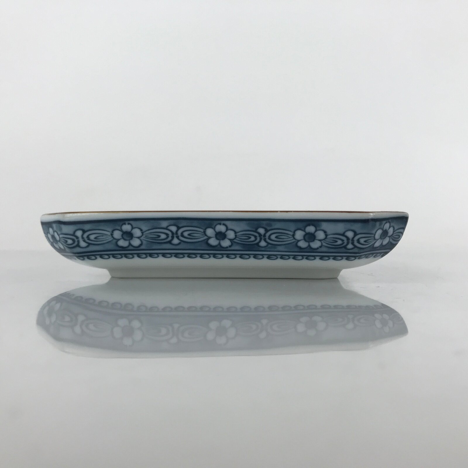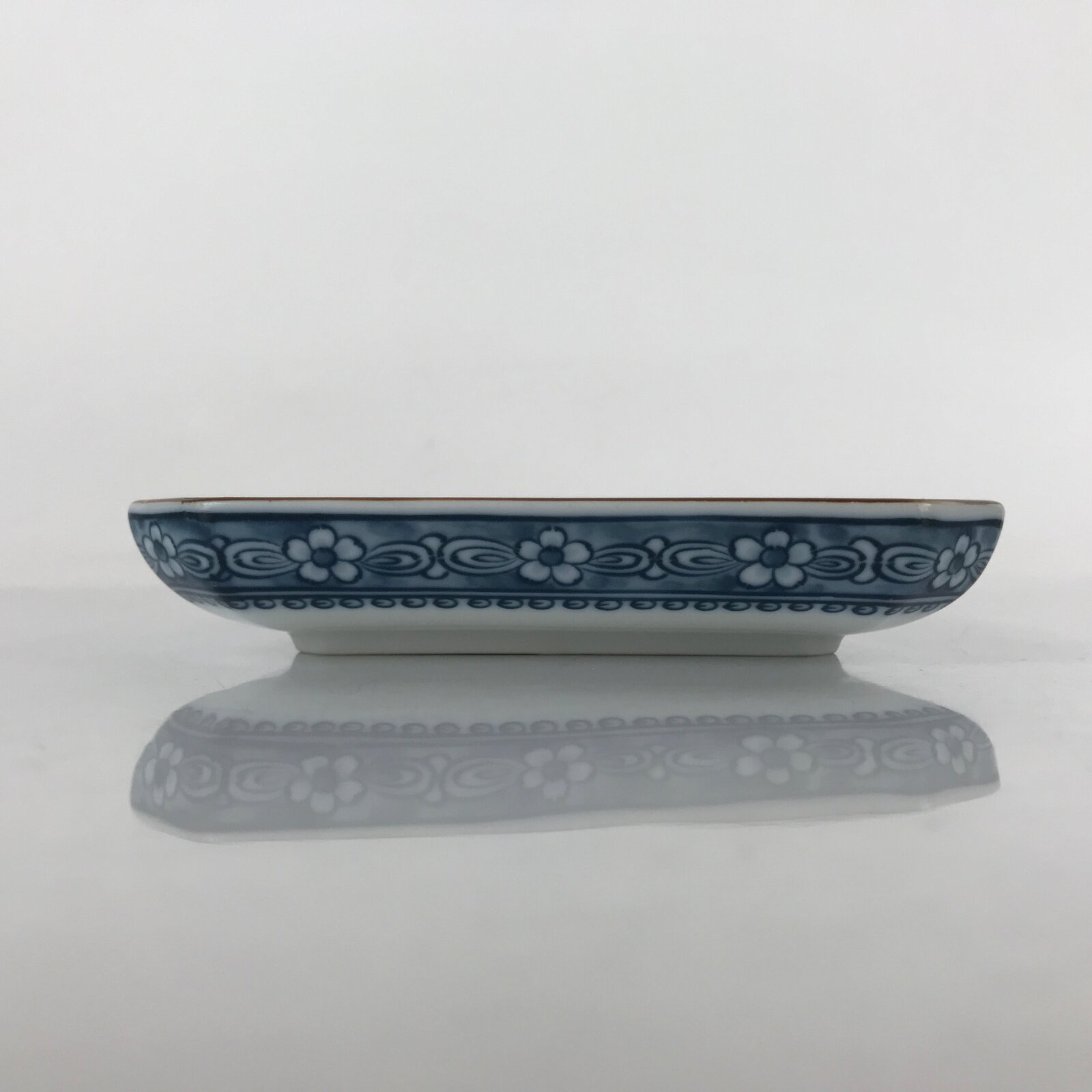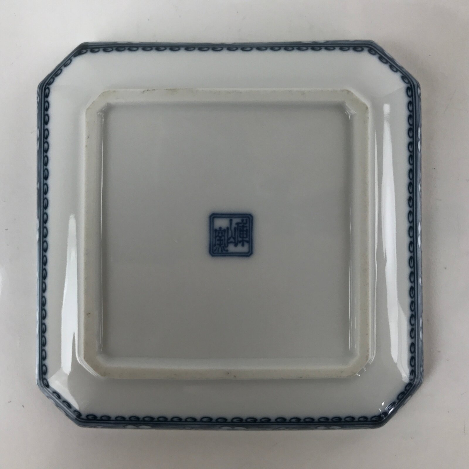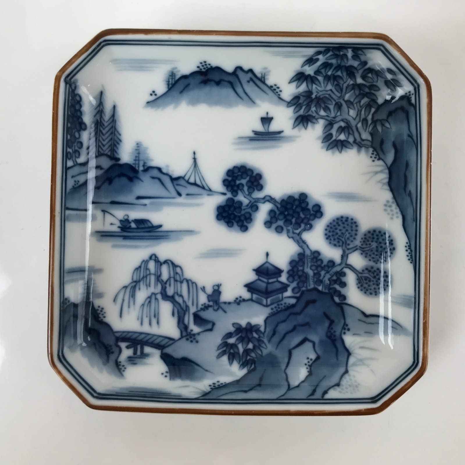 This is a vintage Japanese porcelain small plate. This square plate with squared corners is sometsuke (white porcelain with indigo blue design) with a brown edge. It has a beautiful mountain and river design with a fisherman, pagoda, and various trees. The underside has a blue floral pattern border. There is a blue maker’s mark on the back.