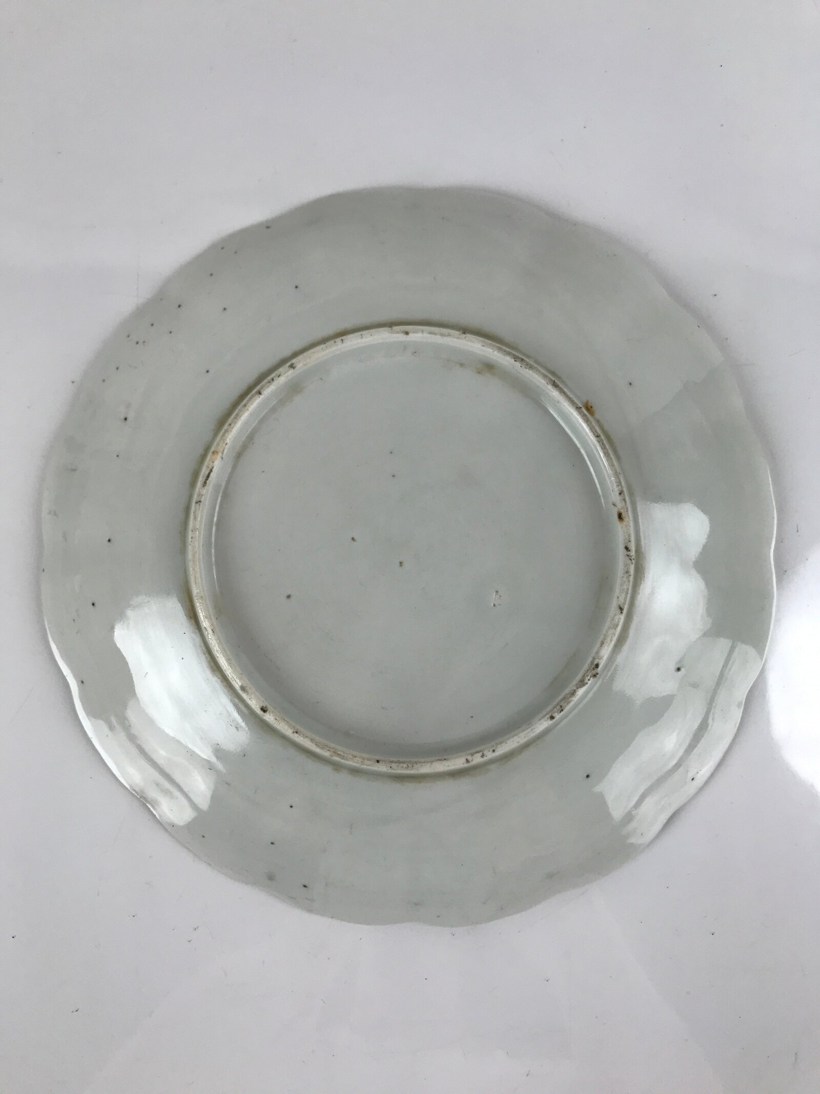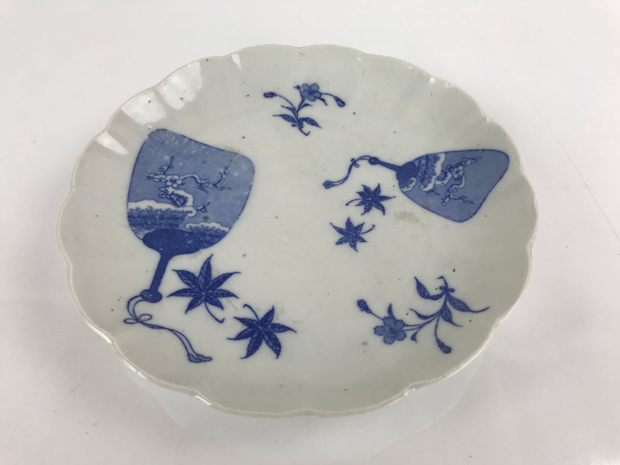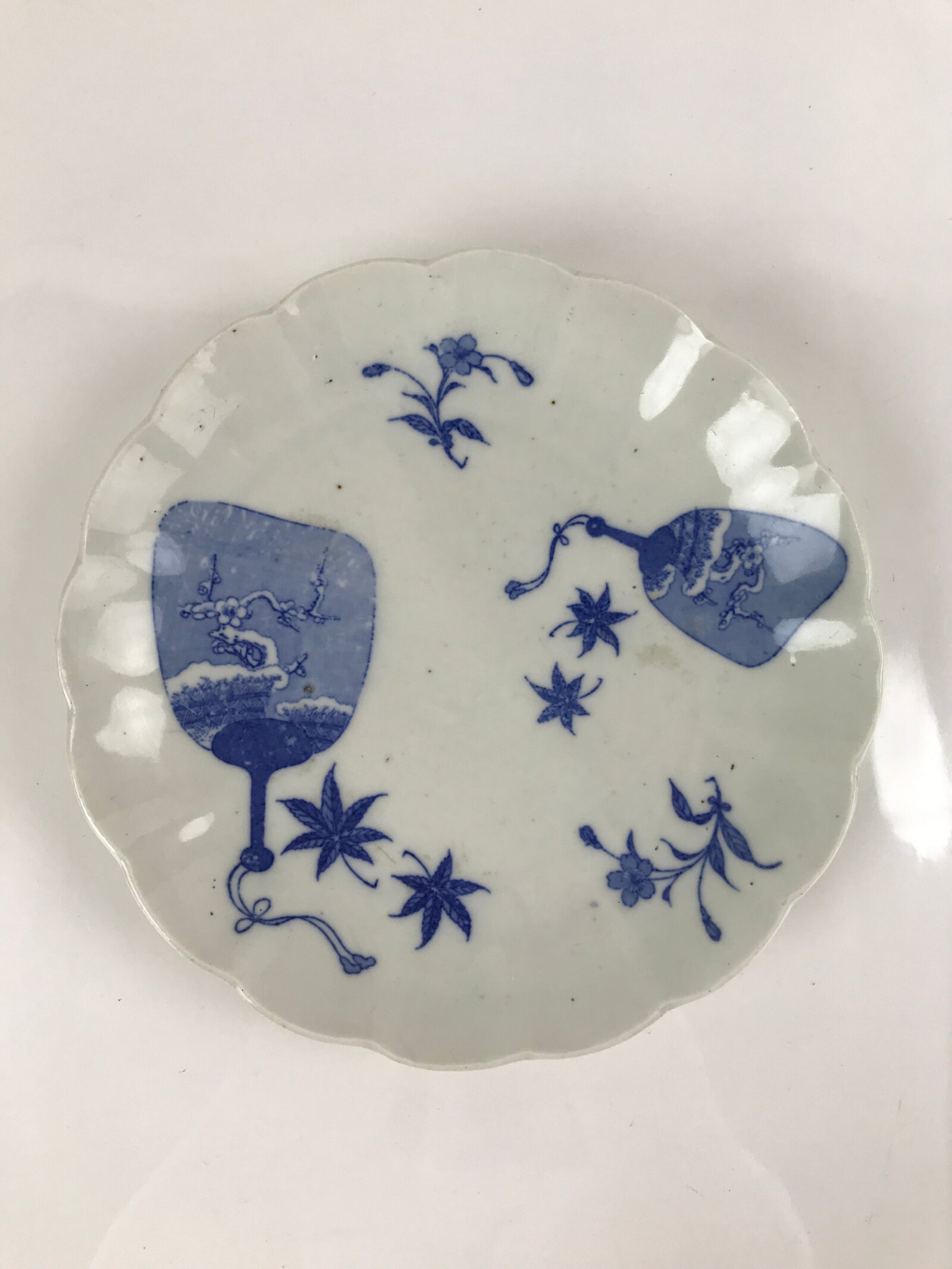 This is a vintage Japanese porcelain plate. This round plate roughly the size of a western salad or dinner plate is sometsuke (white porcelain with indigo blue design). It has scalloped edges and a beautiful uchiwa (flat fan) design that features plum blossoms and maple leaves.