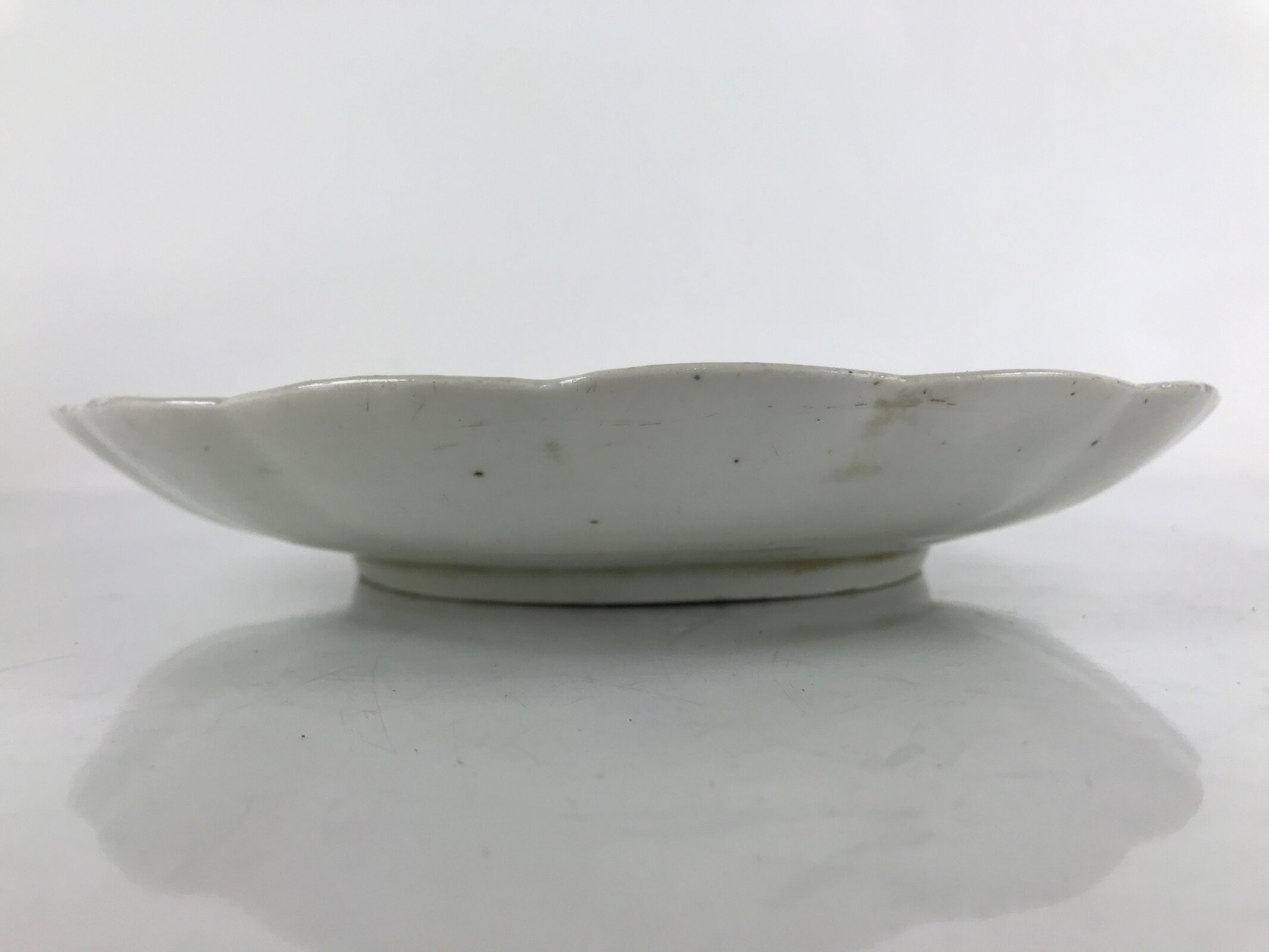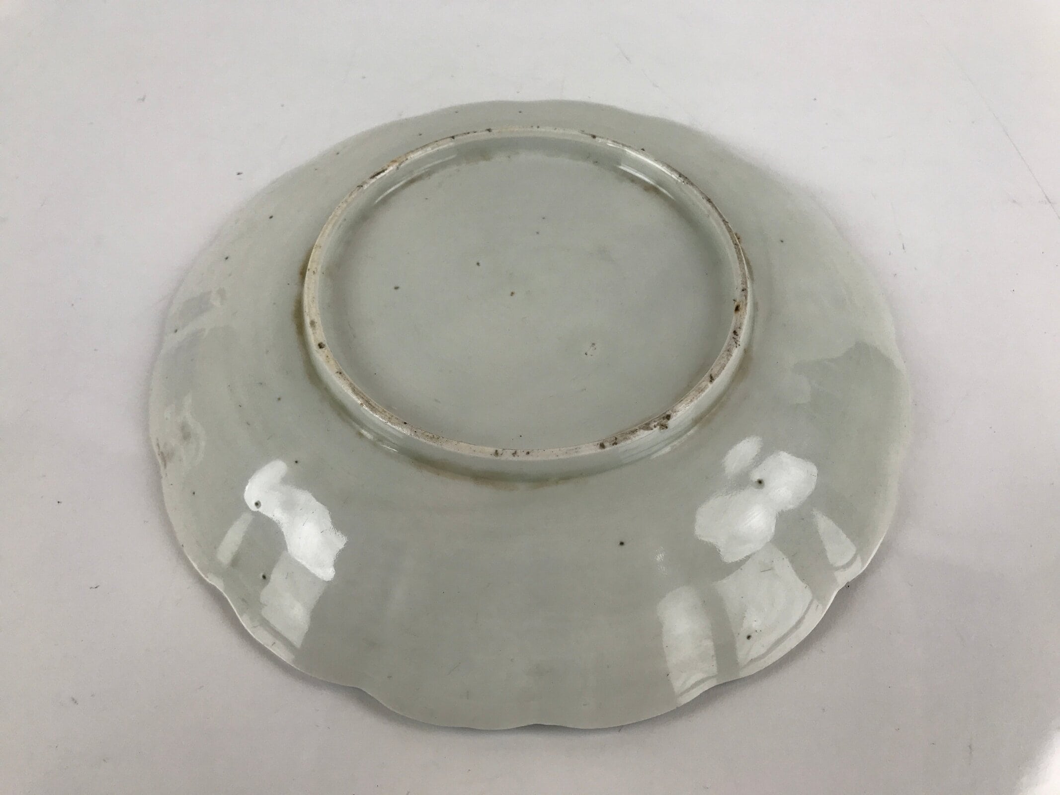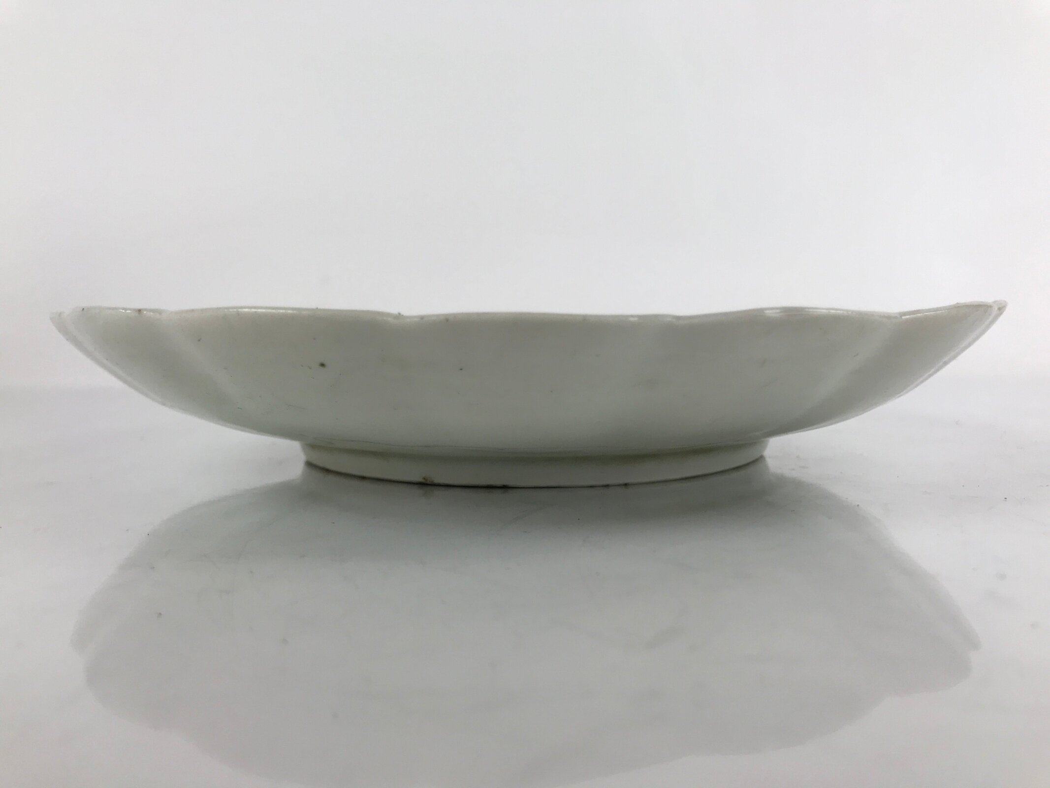 This is a vintage Japanese porcelain plate. This round plate roughly the size of a western salad or dinner plate is sometsuke (white porcelain with indigo blue design). It has scalloped edges and a beautiful uchiwa (flat fan) design that features plum blossoms and maple leaves.