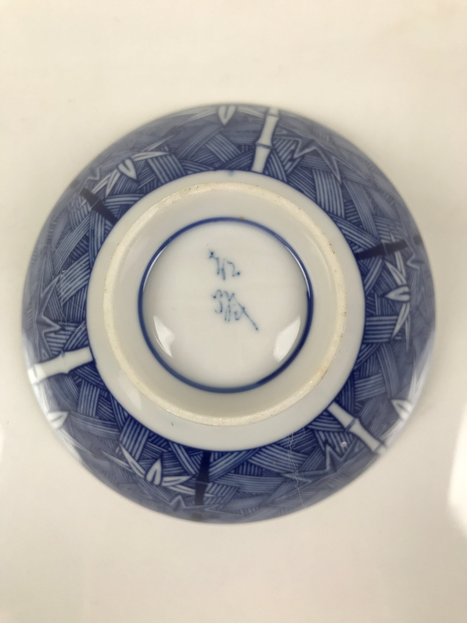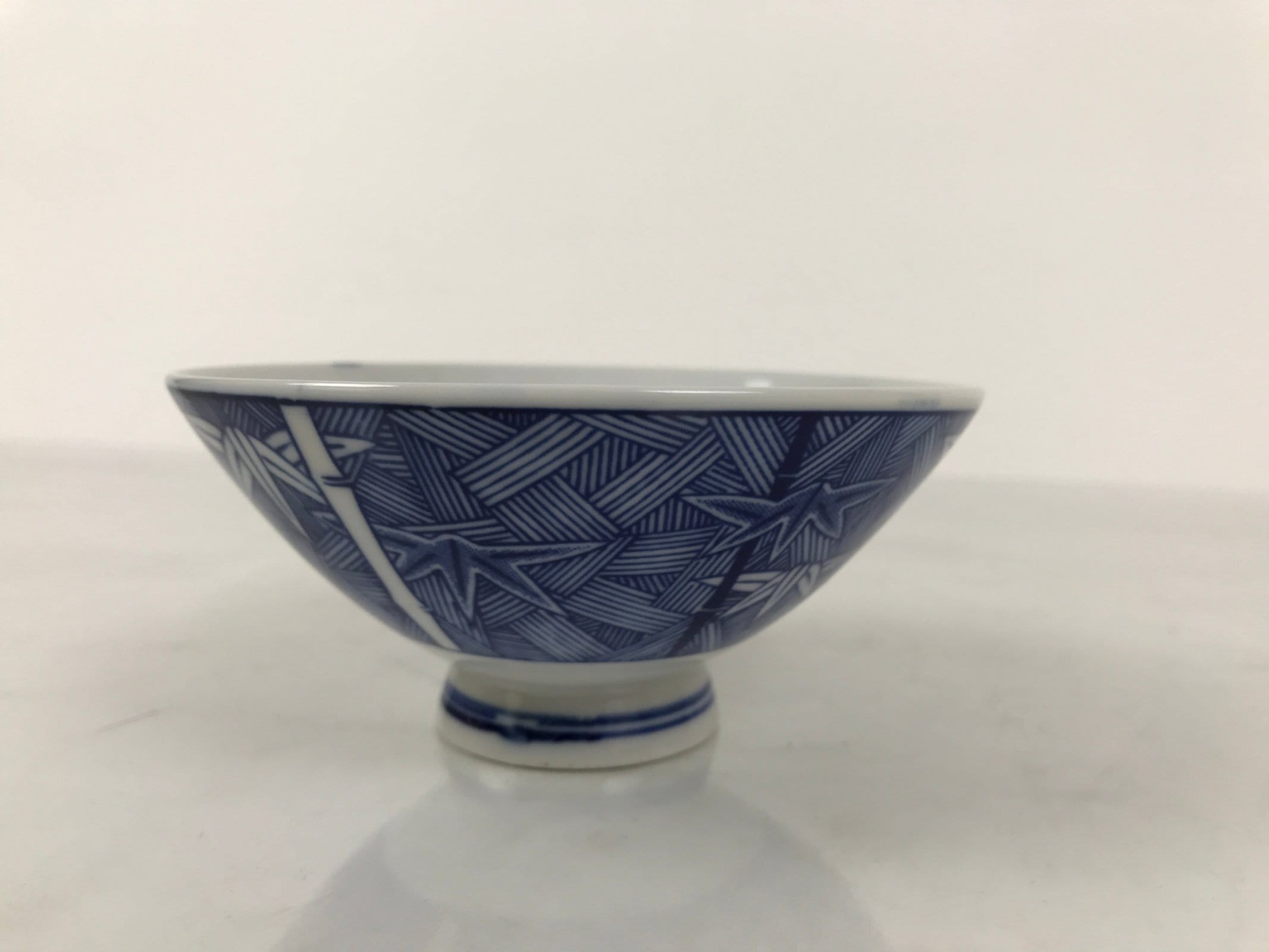 This item is a vintage Japanese porcelain rice bowl. The design on this wide-mouthed small bowl features a sometsuke white and blue design of stalks of bamboo in front of what appears to be a woven basket-like background. The foot of the bowl has two simple blue bands for decoration. It can also be used for side dishes. Rice bowls are made to be lightweight and held in one hand (thumb on rim, other fingers on foot).