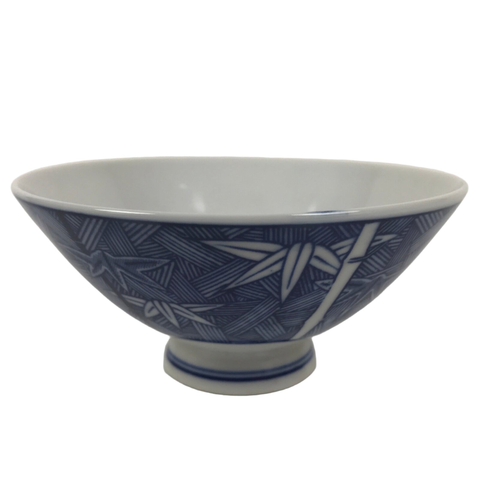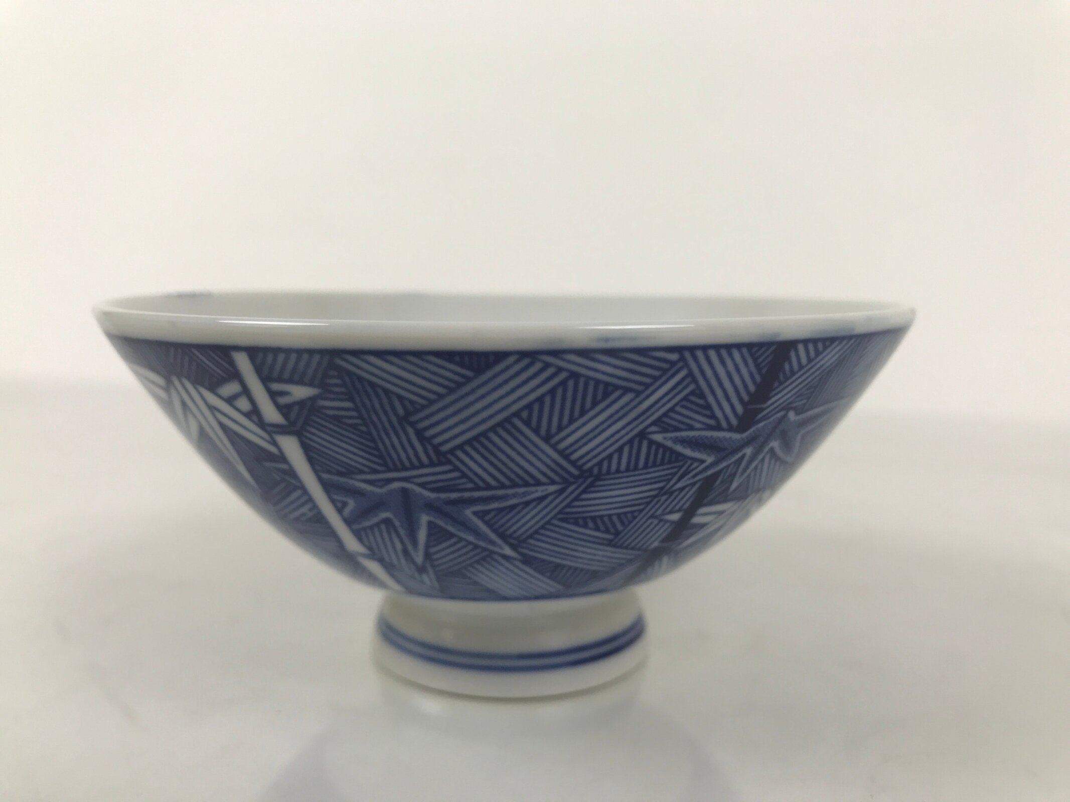 This item is a vintage Japanese porcelain rice bowl. The design on this wide-mouthed small bowl features a sometsuke white and blue design of stalks of bamboo in front of what appears to be a woven basket-like background. The foot of the bowl has two simple blue bands for decoration. It can also be used for side dishes. Rice bowls are made to be lightweight and held in one hand (thumb on rim, other fingers on foot).