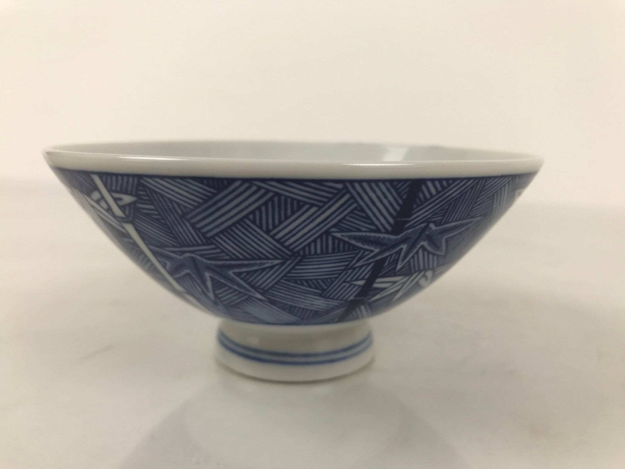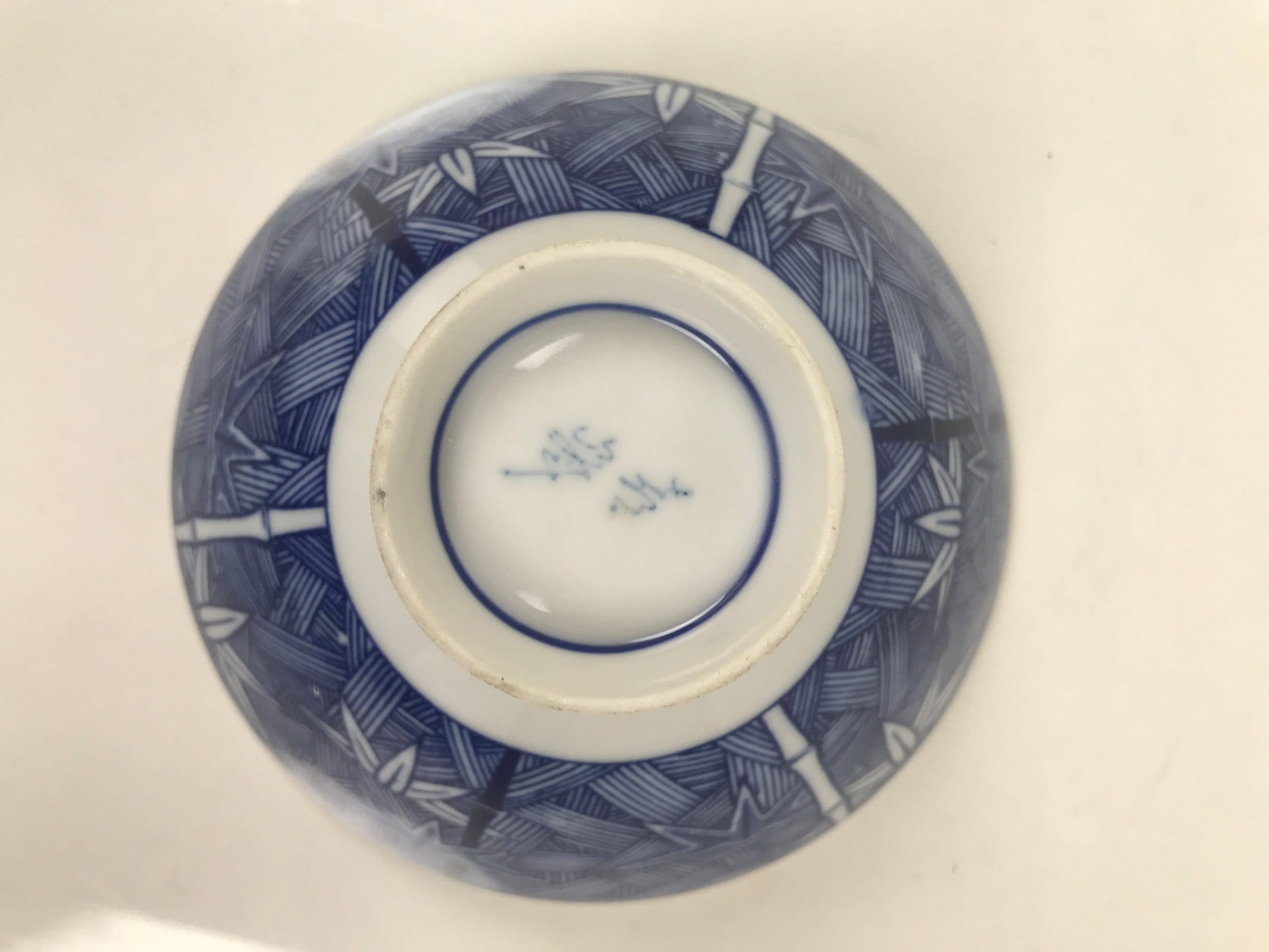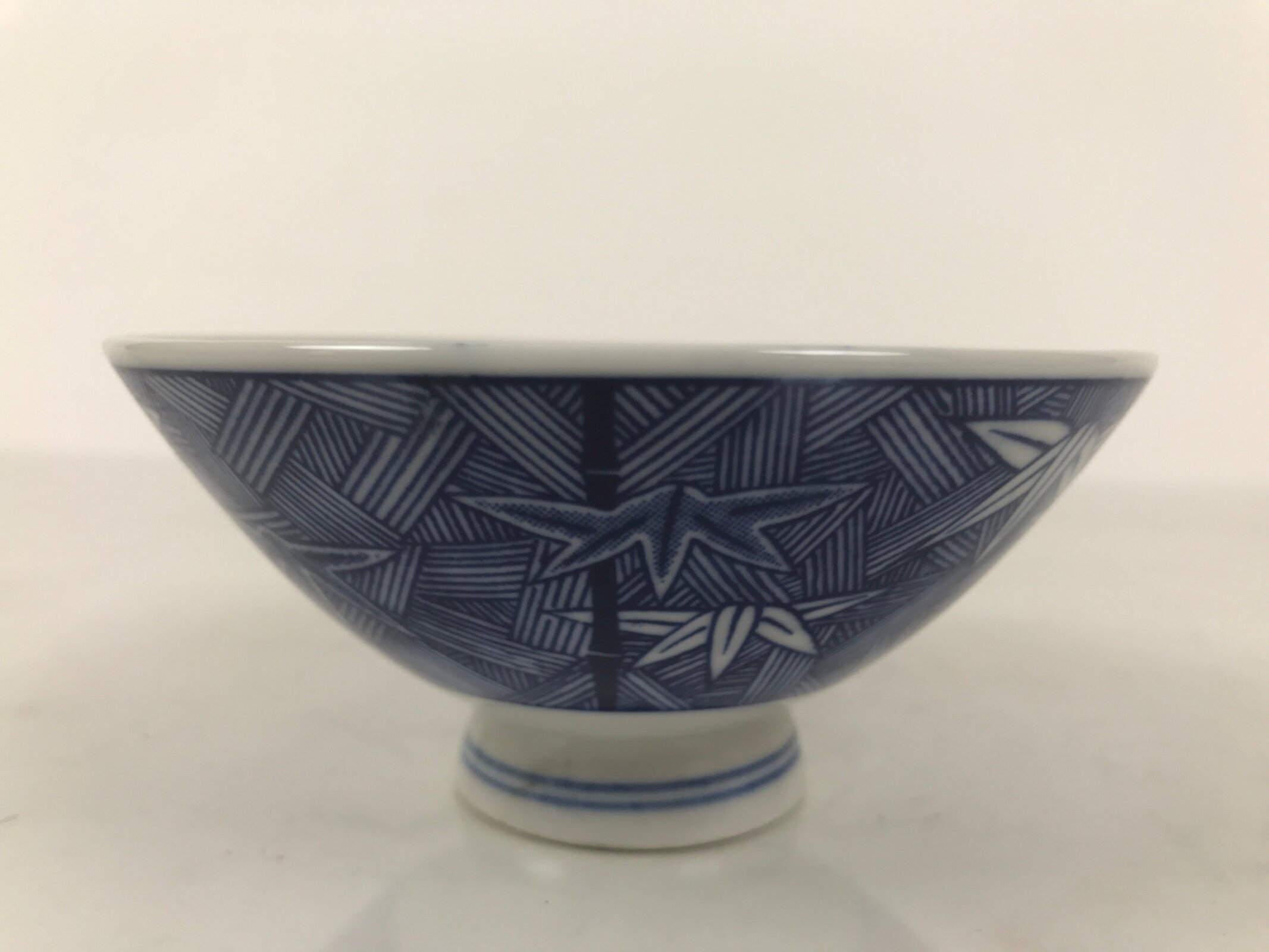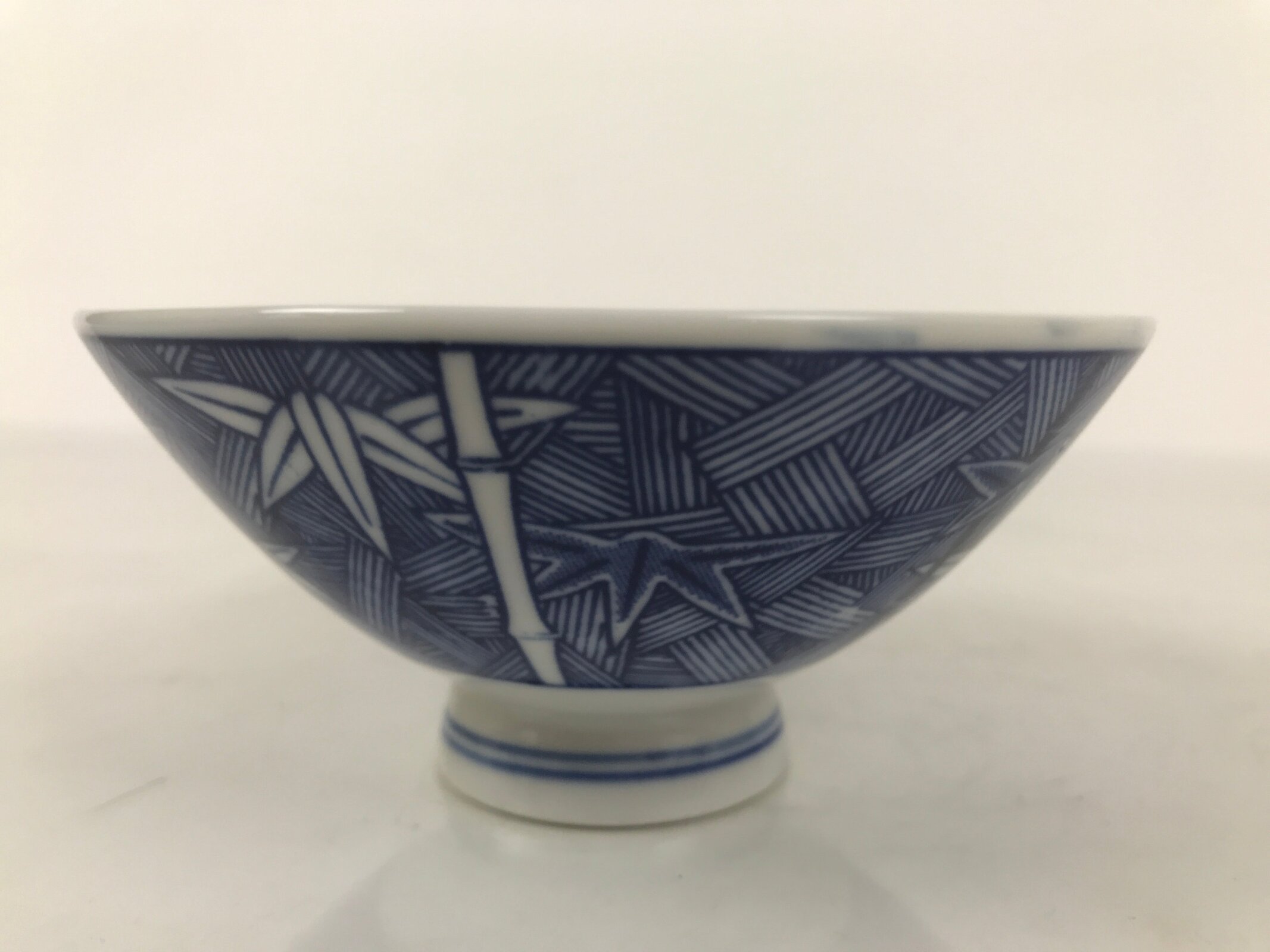This item is a vintage Japanese porcelain rice bowl. The design on this wide-mouthed small bowl features a sometsuke white and blue design of stalks of bamboo in front of what appears to be a woven basket-like background. The foot of the bowl has two simple blue bands for decoration. It can also be used for side dishes. Rice bowls are made to be lightweight and held in one hand (thumb on rim, other fingers on foot).