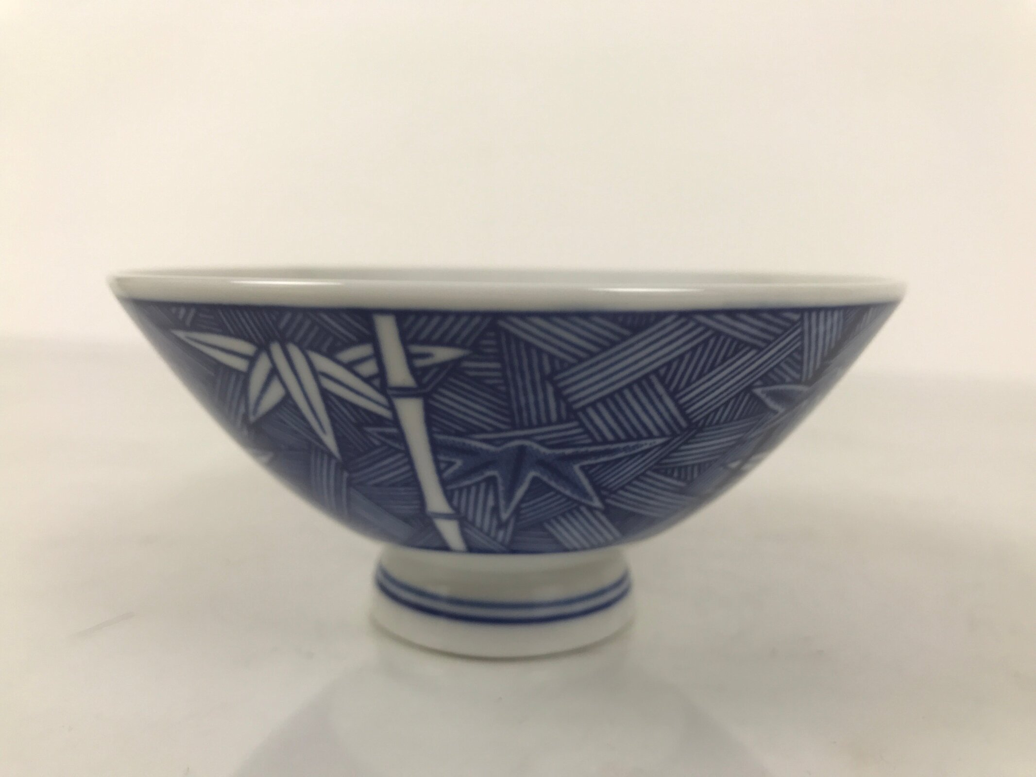 This item is a vintage Japanese porcelain rice bowl. The design on this wide-mouthed small bowl features a sometsuke white and blue design of stalks of bamboo in front of what appears to be a woven basket-like background. The foot of the bowl has two simple blue bands for decoration. It can also be used for side dishes. Rice bowls are made to be lightweight and held in one hand (thumb on rim, other fingers on foot).