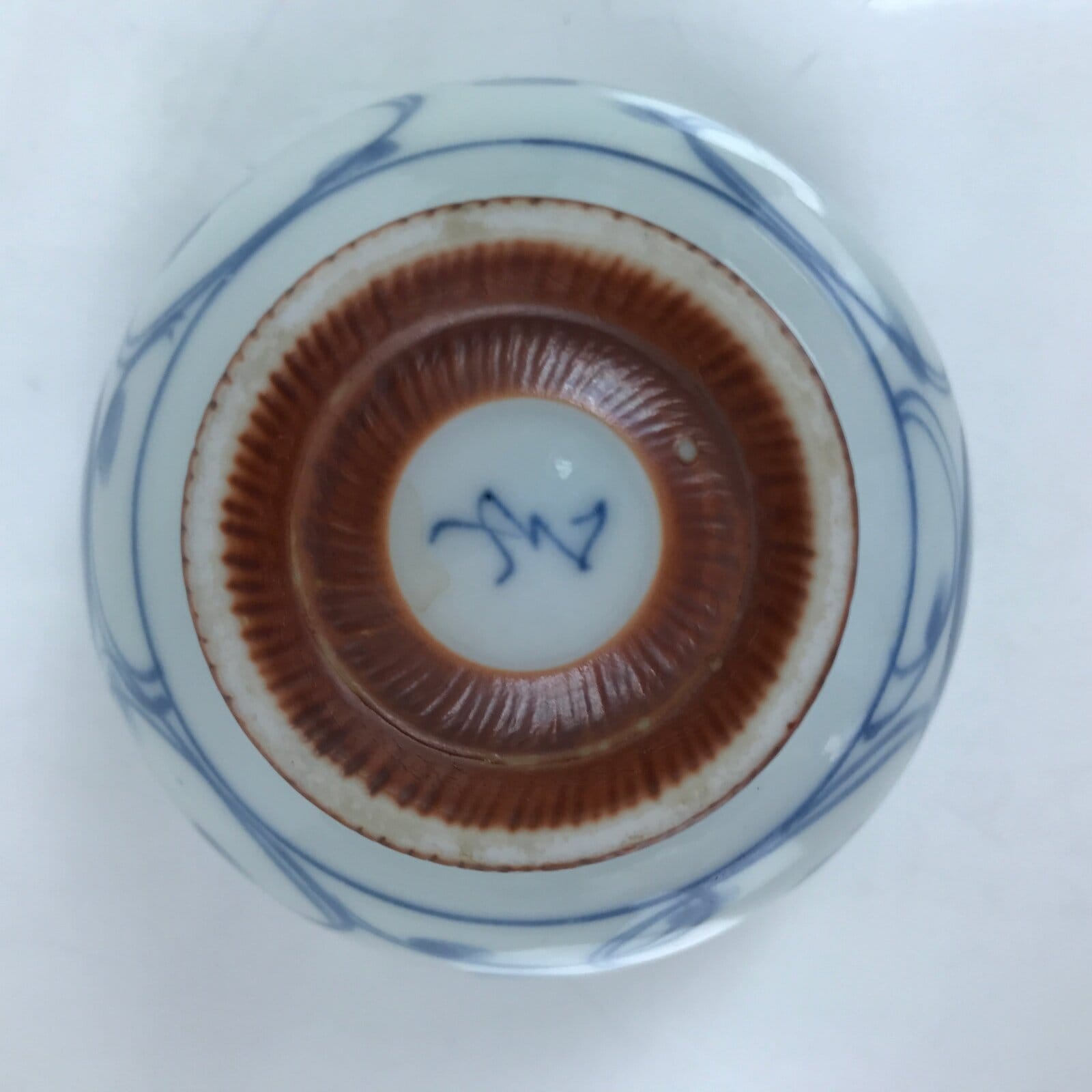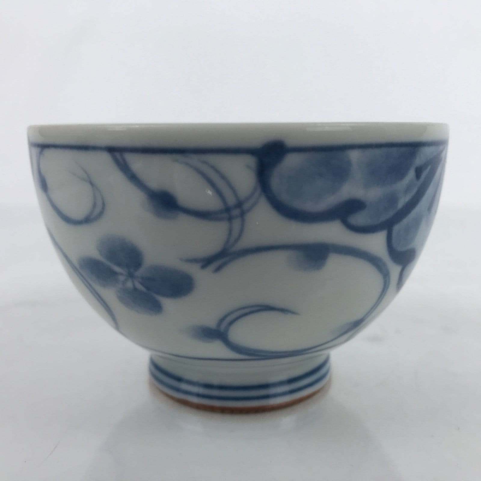 This is a Japanese vintage tea cup (Yunomi). The cup is white porcelain with blue floral designs (sometsuke). There are blue bands on the foot of the cup as well as on the inner lip. The bottom has carved lines glazed a matte brown color. There is a maker’s stamp on the bottom. This cup is for serving sencha (steeped loose leaf tea).