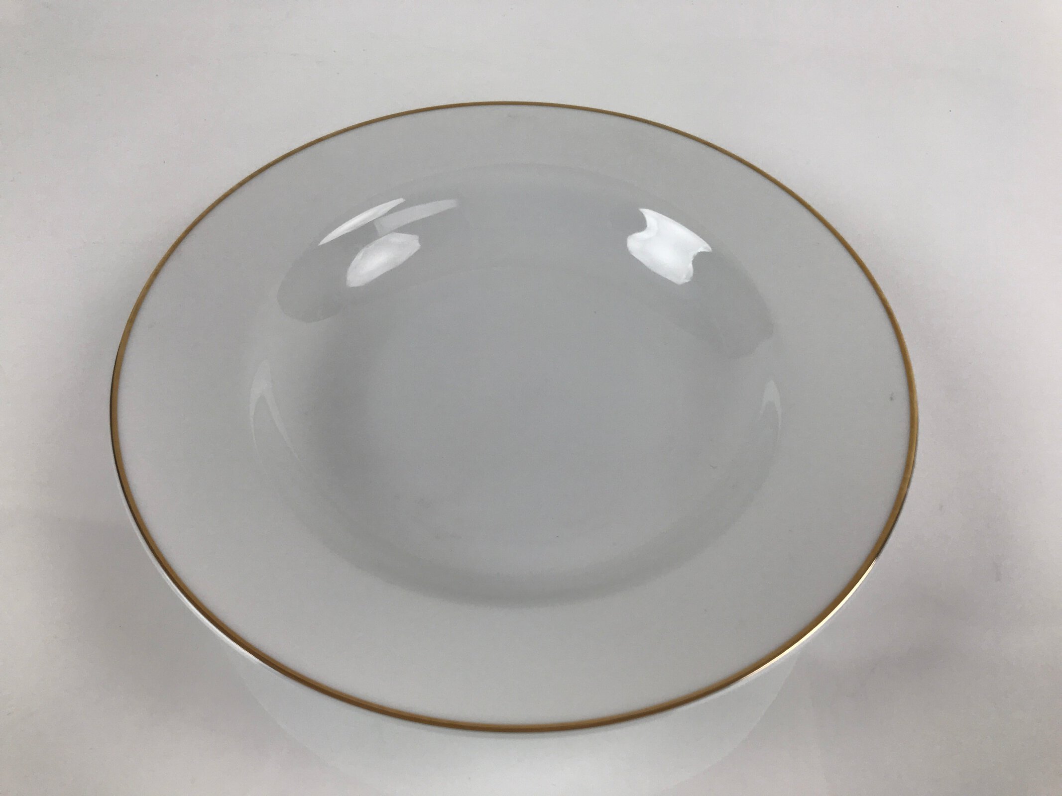 This is a vintage Showa-era Japanese porcelain china soup or pasta bowl. This round, shallow bowl is mostly white with an elegant gold rim. While the overall design is simple, it is a great mix-and-match piece.
