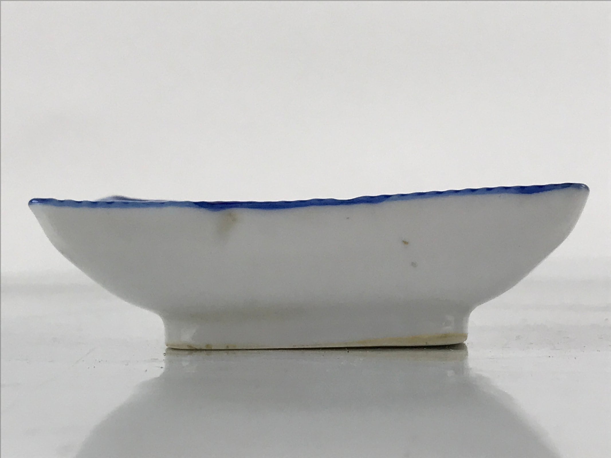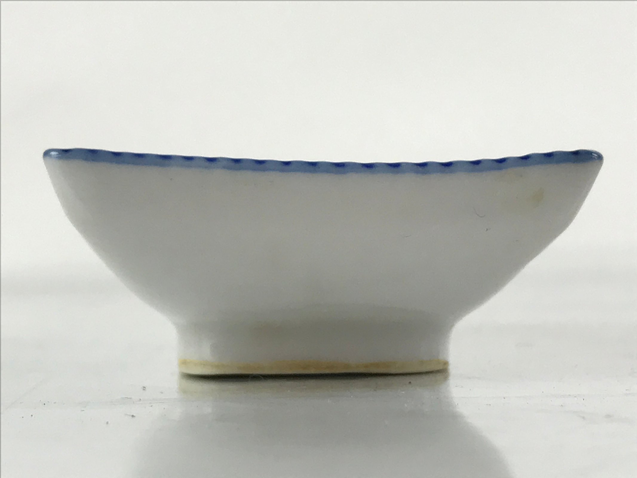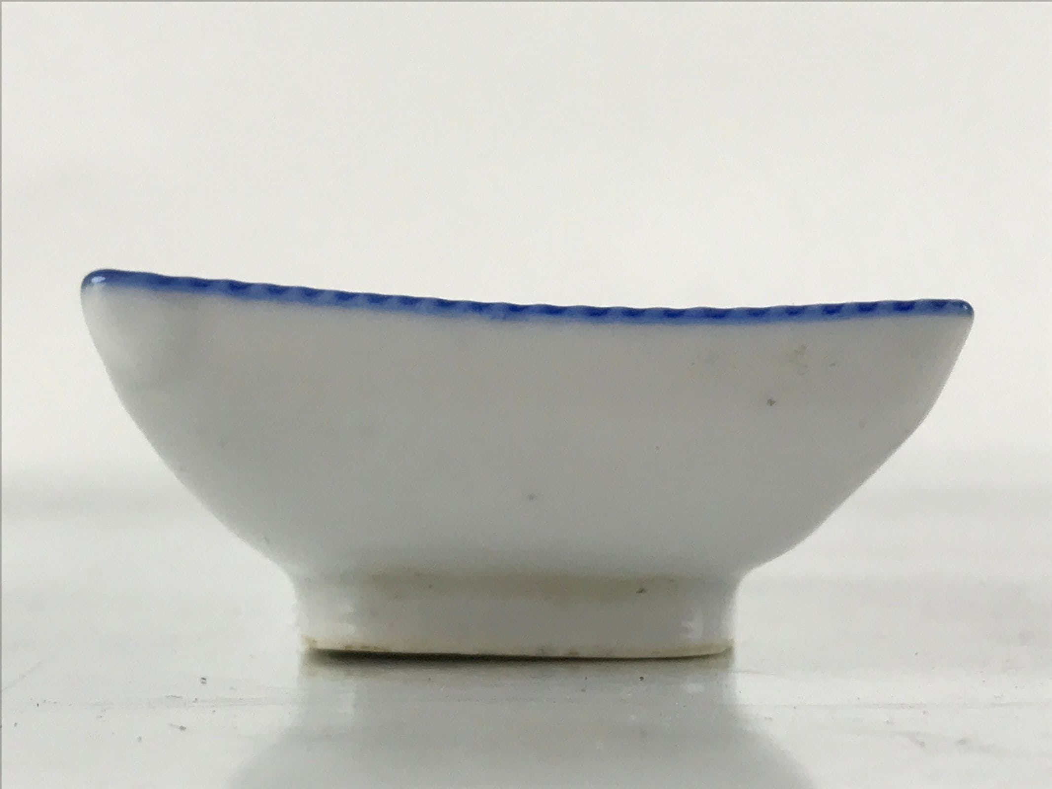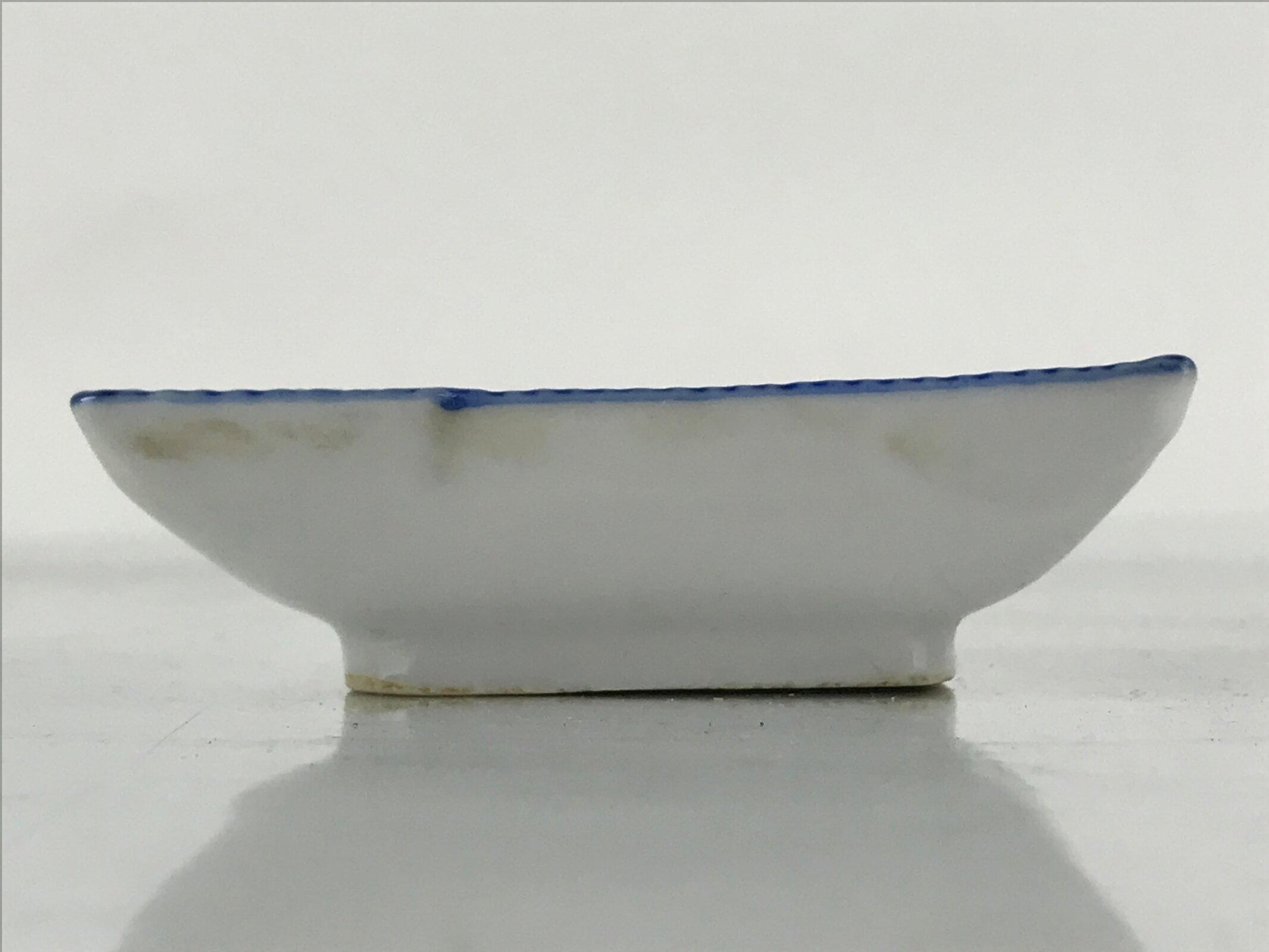 This is a vintage Japanese soy sauce dish, Seiji. It is a small, rectangular shallow bowl or plate meant to hold soy sauce as well as other seasonings for the purpose of dipping. Featuring a twisted cord-looking blue edge design, this white little bowl can also hold other food items such as pickles. This is a common dish when eating sashimi, for example.