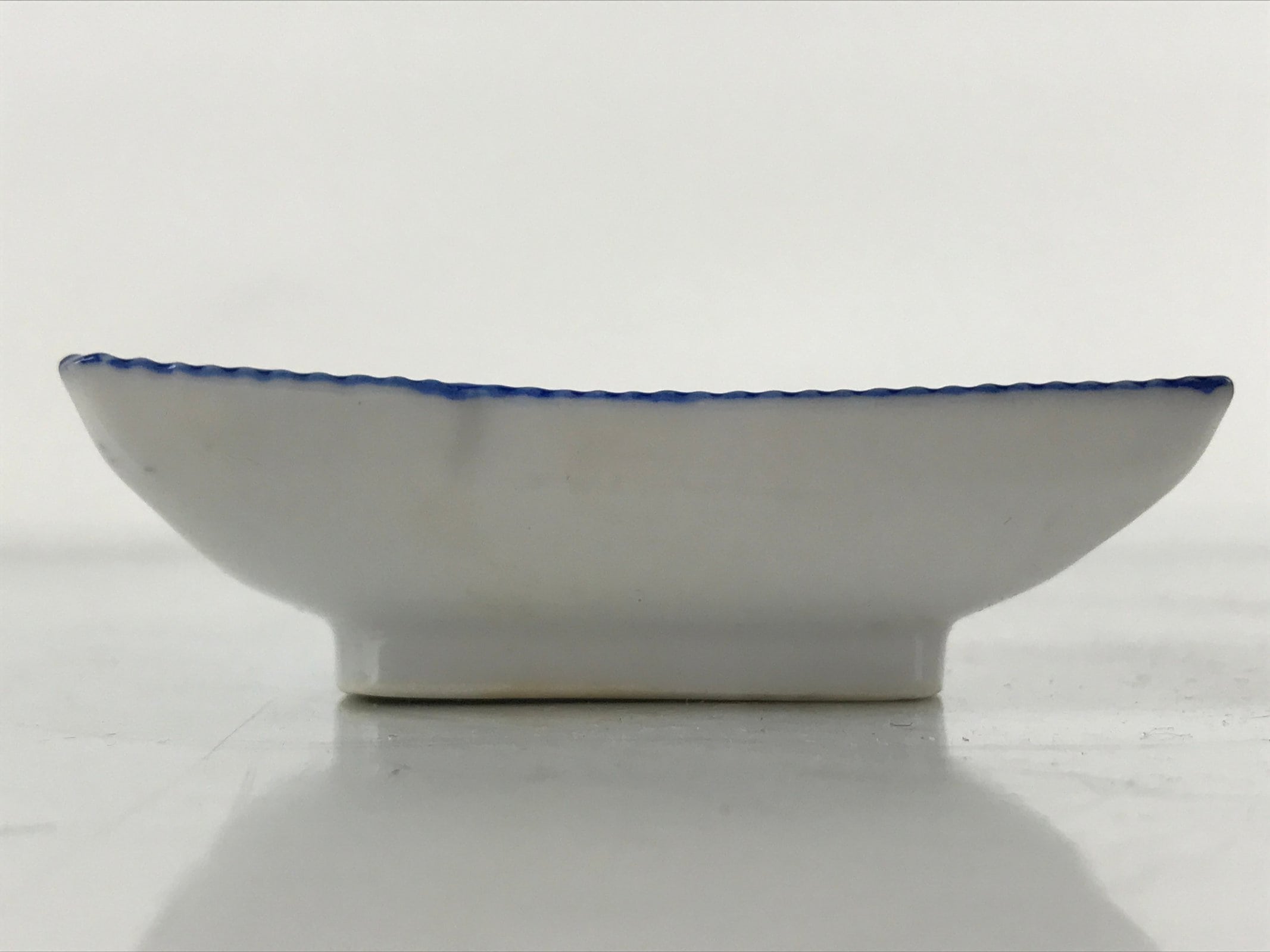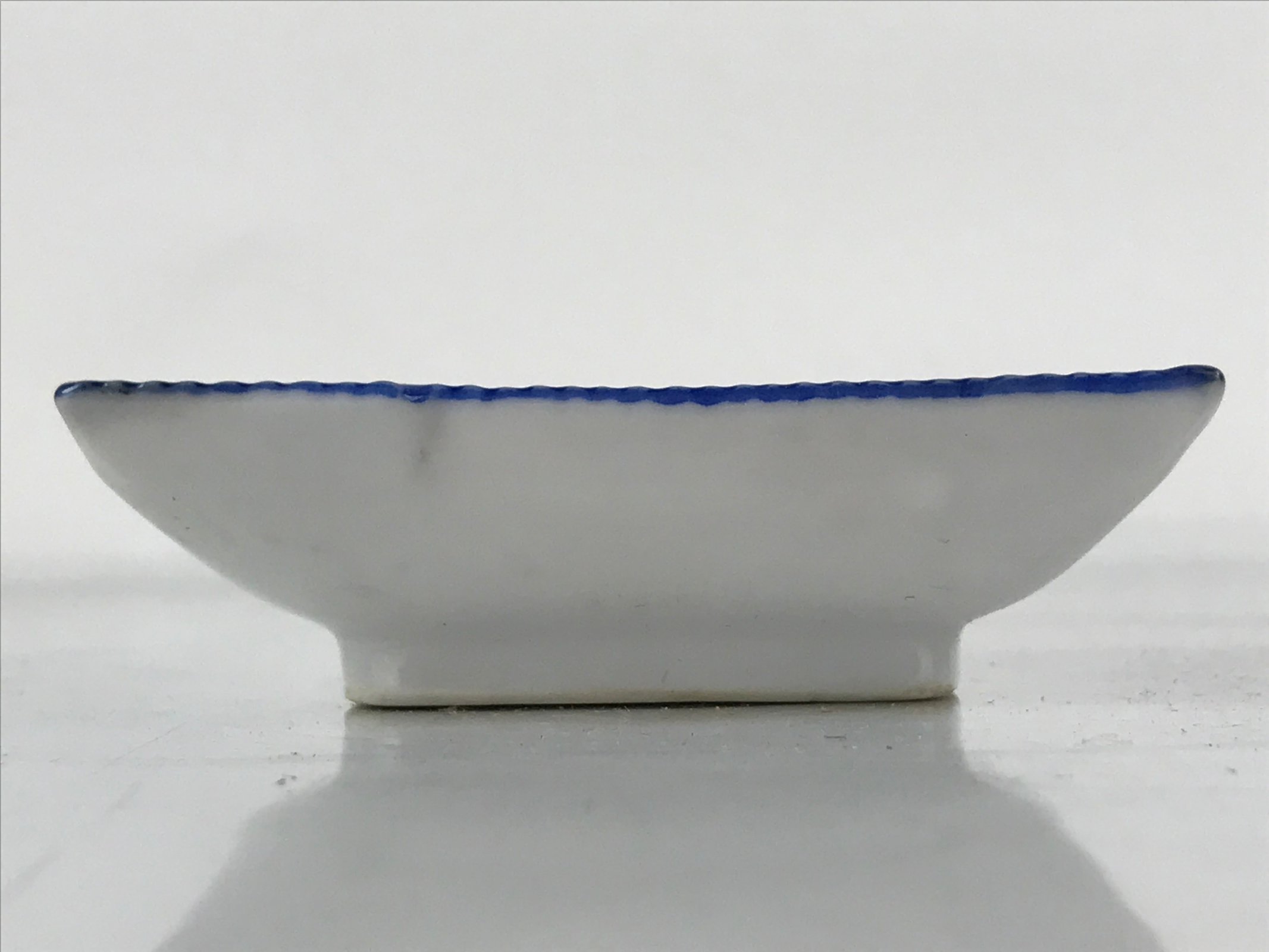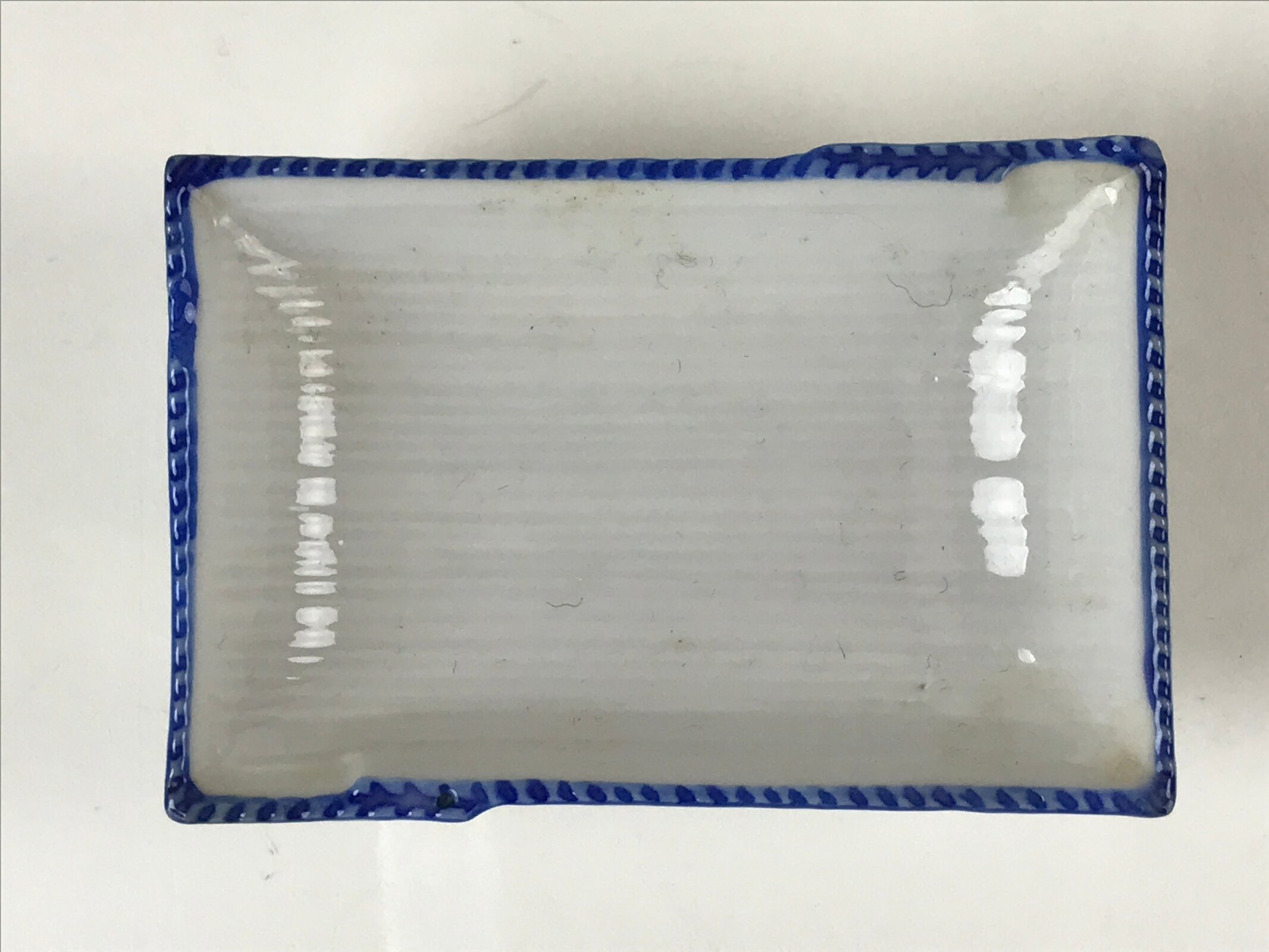 This is a vintage Japanese soy sauce dish, Seiji. It is a small, rectangular shallow bowl or plate meant to hold soy sauce as well as other seasonings for the purpose of dipping. Featuring a twisted cord-looking blue edge design, this white little bowl can also hold other food items such as pickles. This is a common dish when eating sashimi, for example.