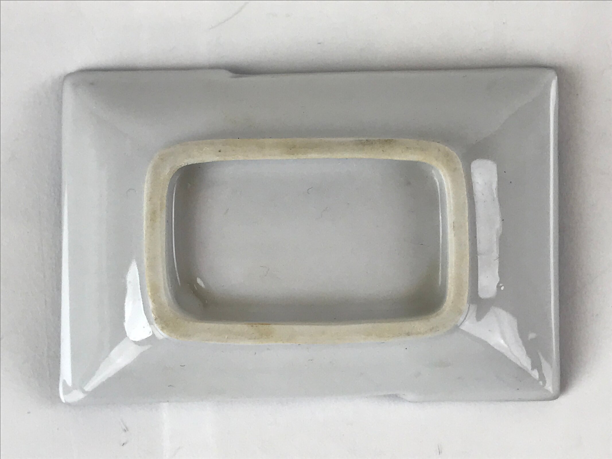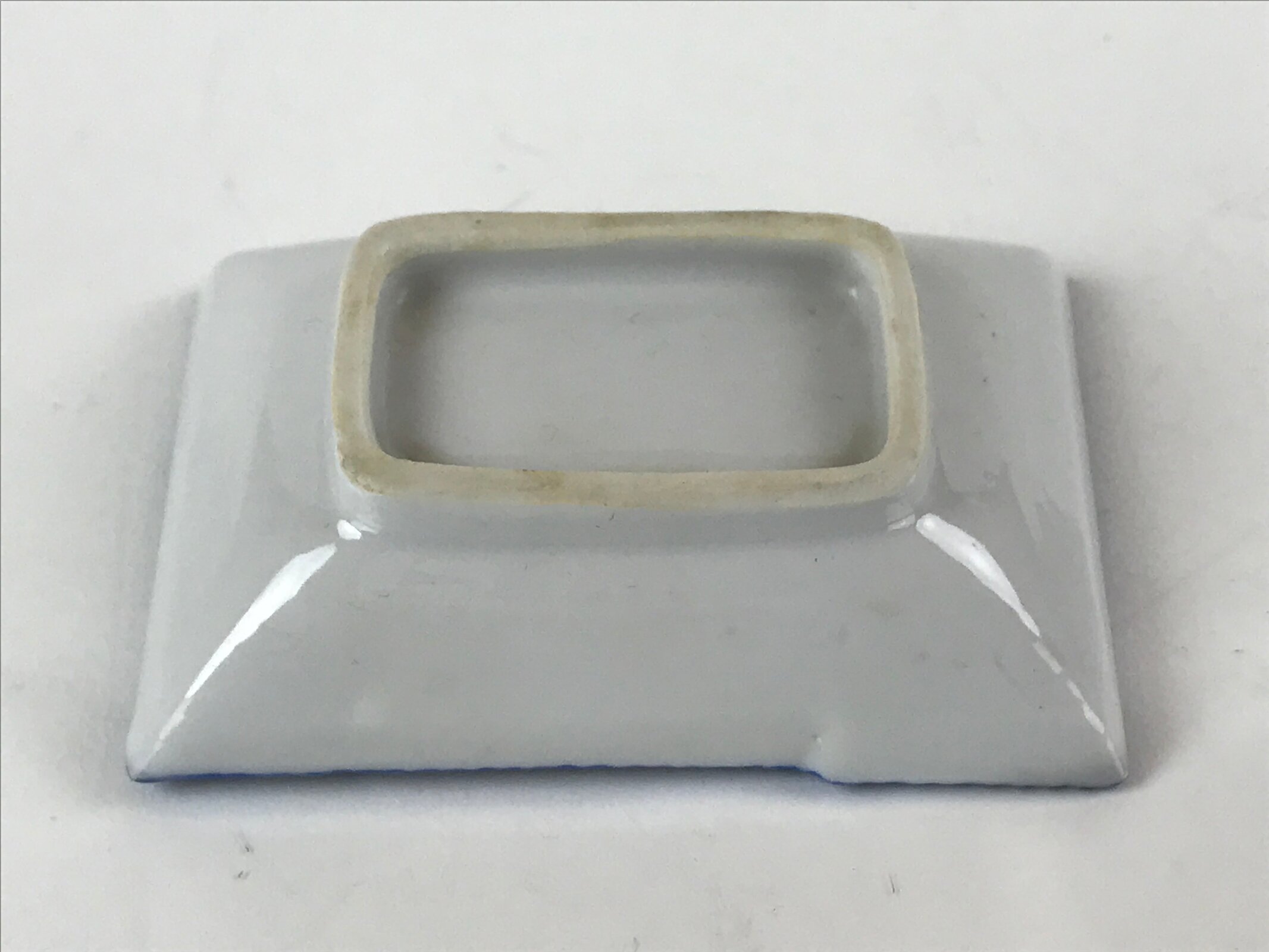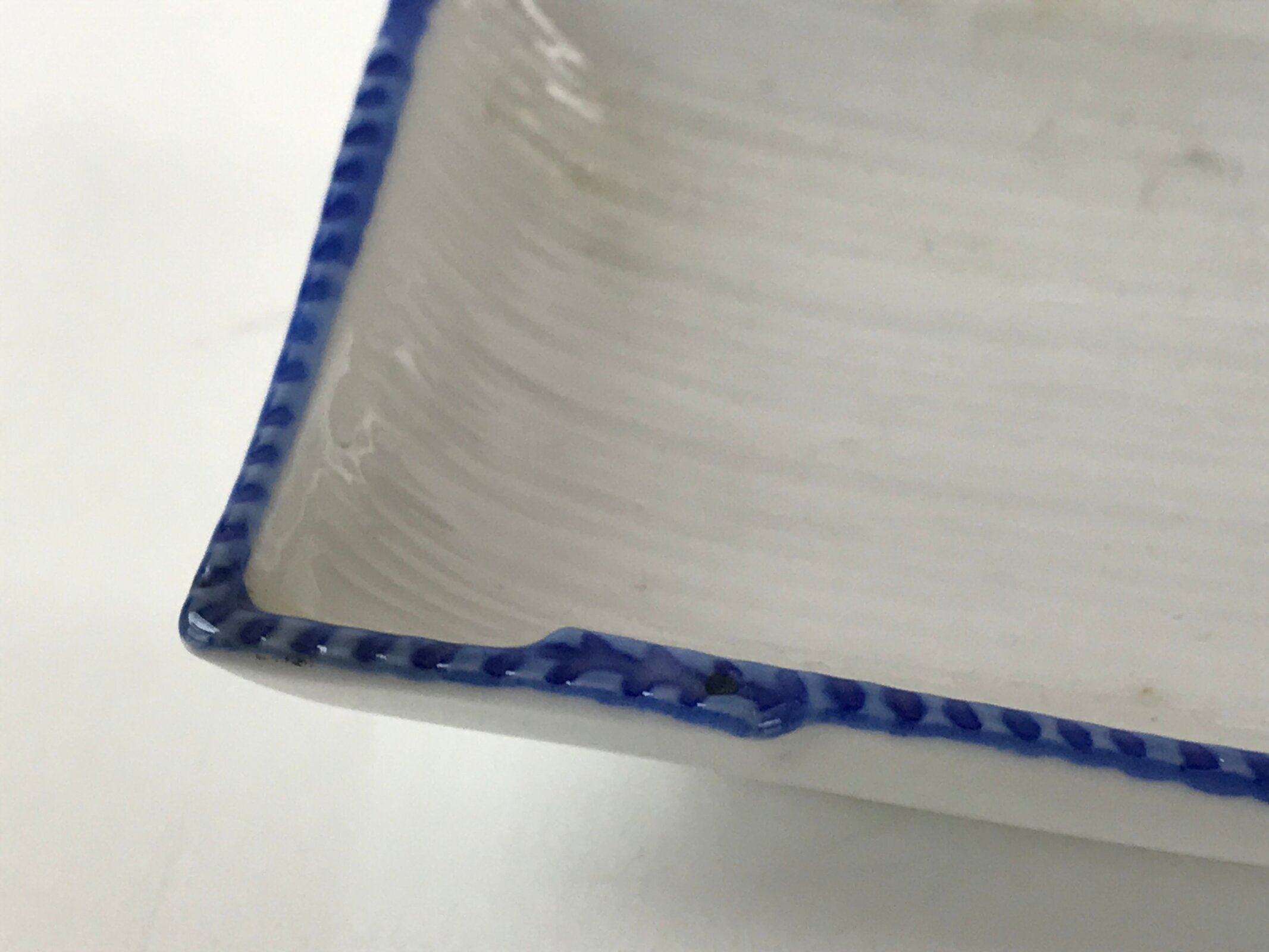 This is a vintage Japanese soy sauce dish, Seiji. It is a small, rectangular shallow bowl or plate meant to hold soy sauce as well as other seasonings for the purpose of dipping. Featuring a twisted cord-looking blue edge design, this white little bowl can also hold other food items such as pickles. This is a common dish when eating sashimi, for example.