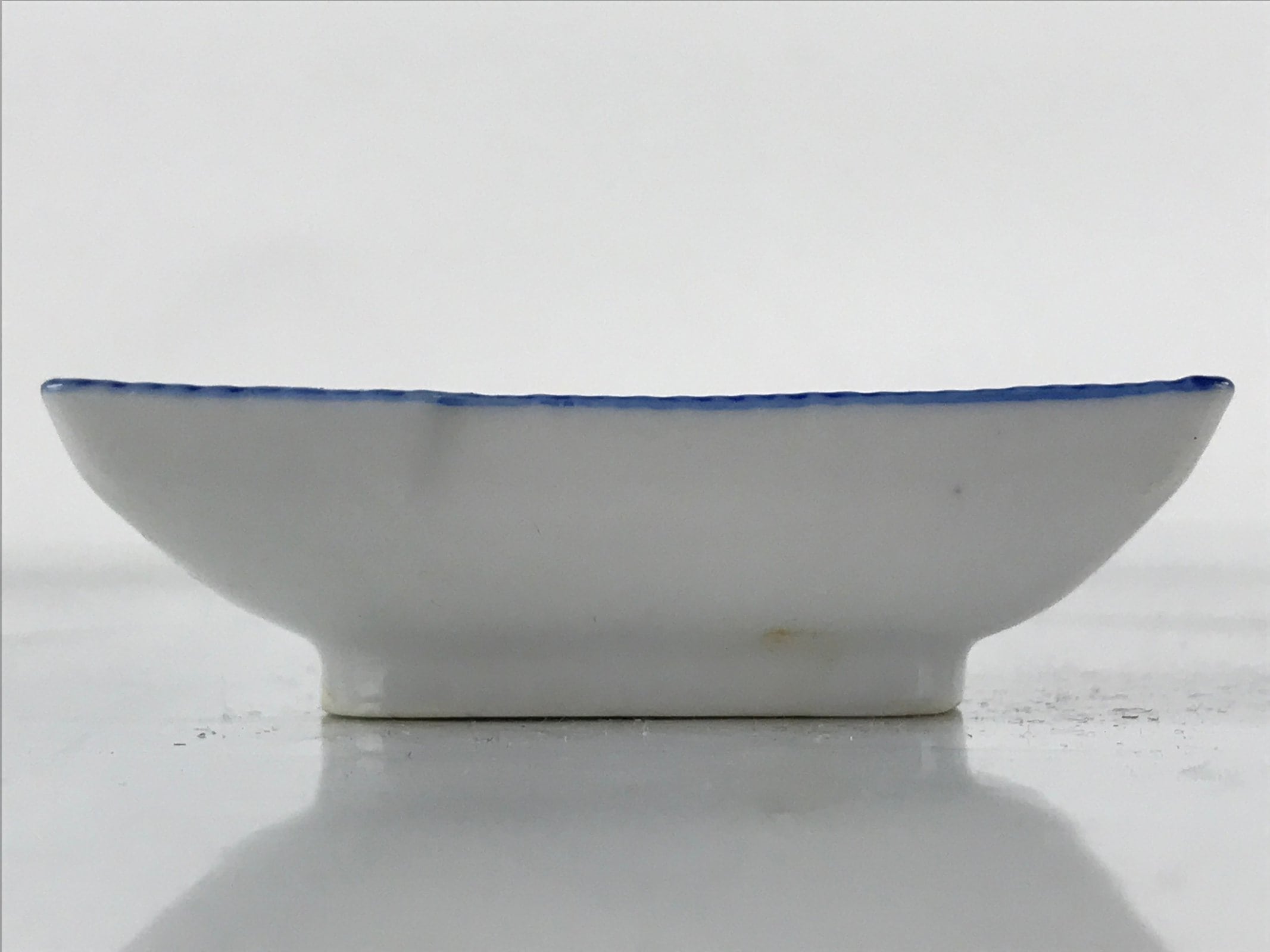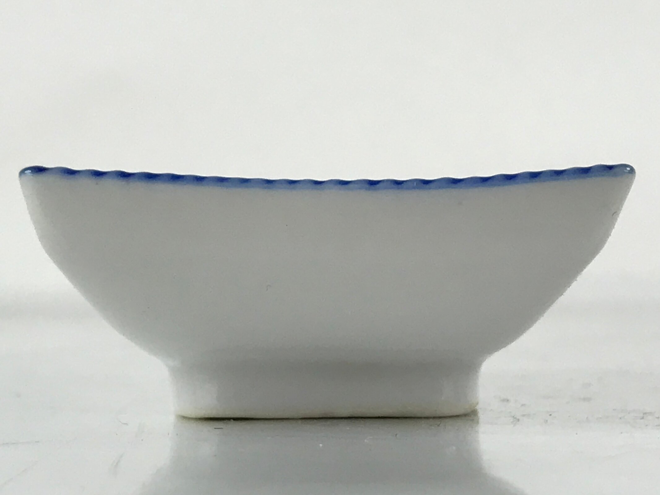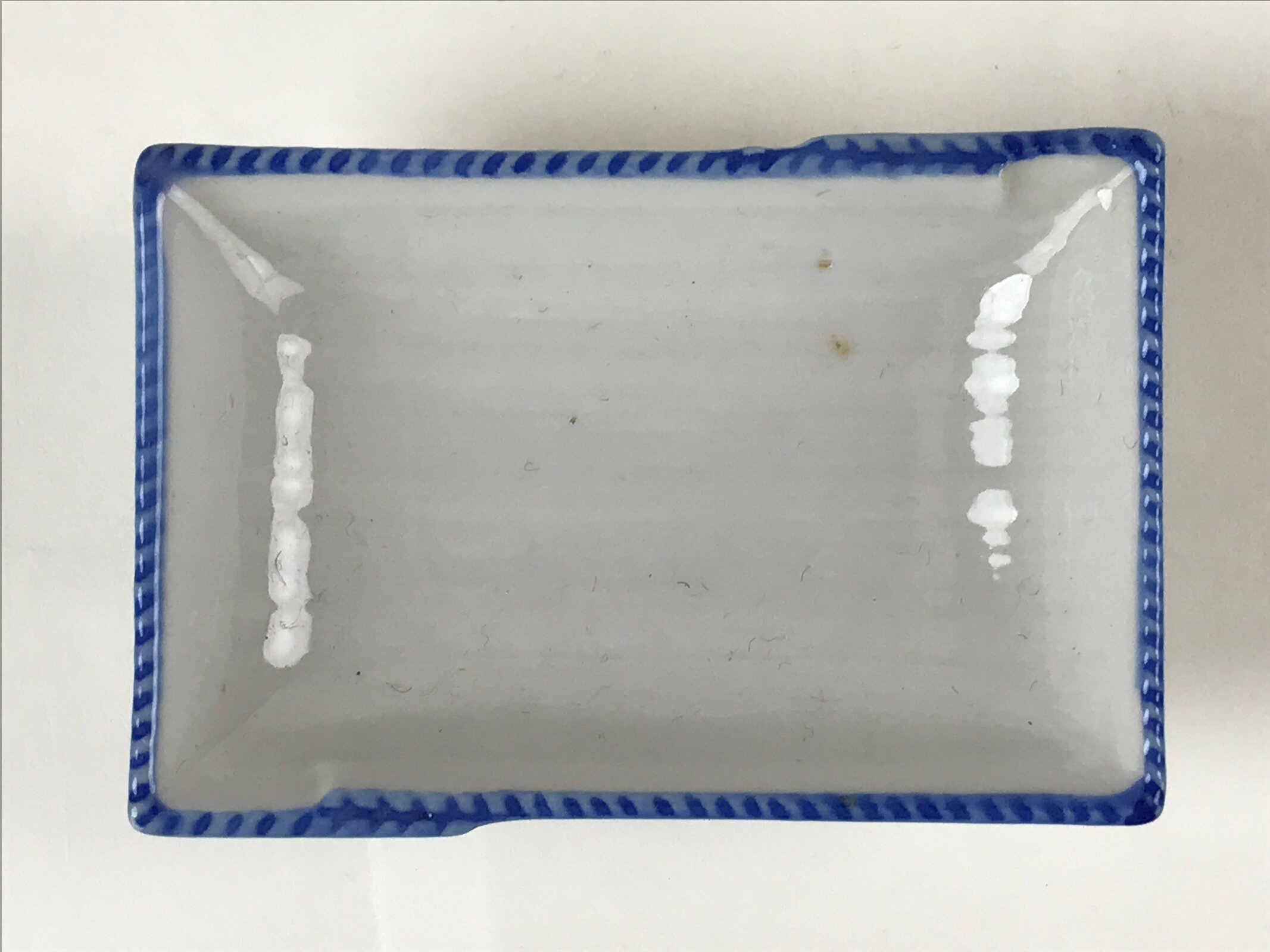This is a vintage Japanese soy sauce dish, Seiji. It is a small, rectangular shallow bowl or plate meant to hold soy sauce as well as other seasonings for the purpose of dipping. Featuring a twisted cord-looking blue edge design, this white little bowl can also hold other food items such as pickles. This is a common dish when eating sashimi, for example.