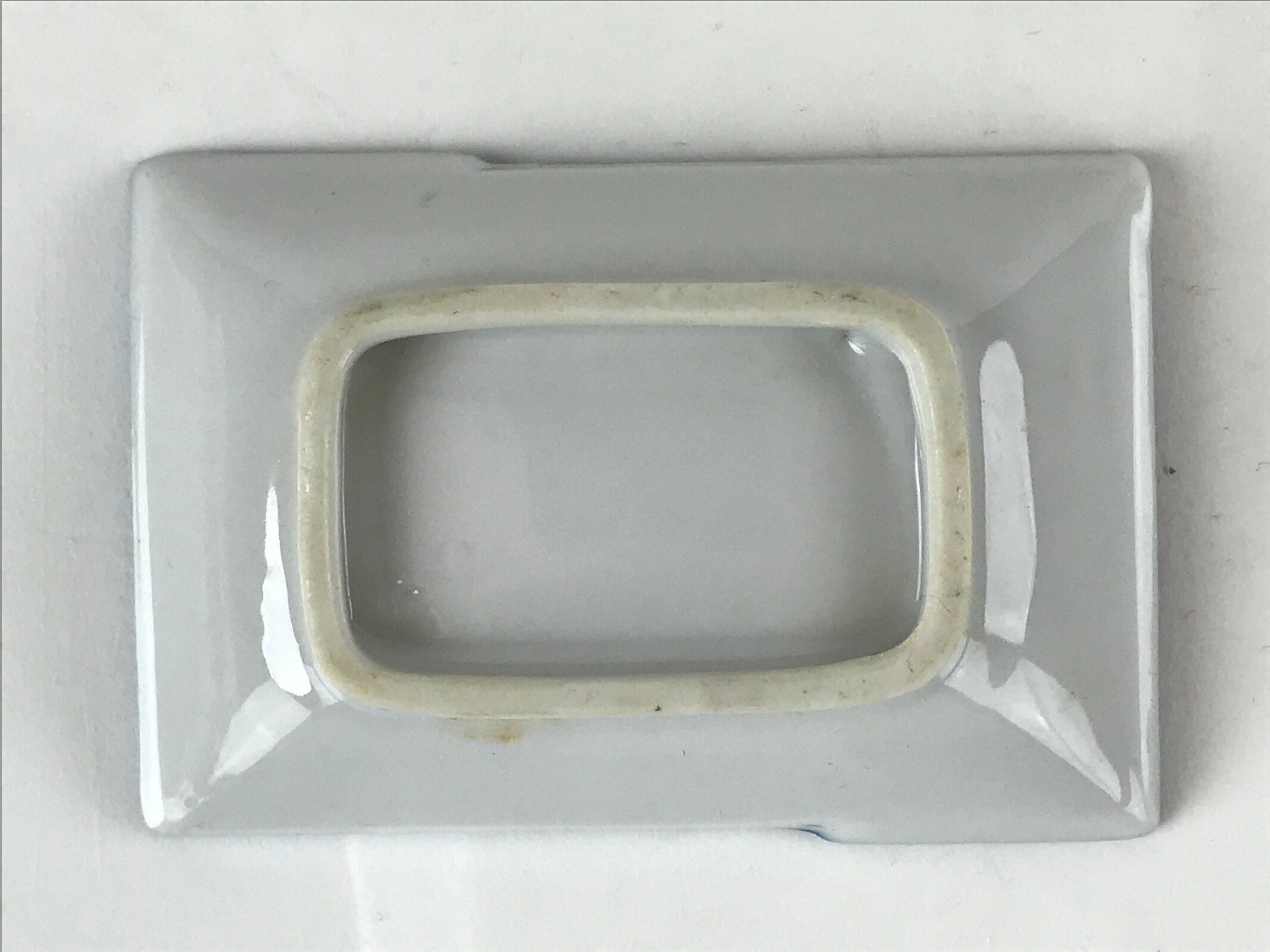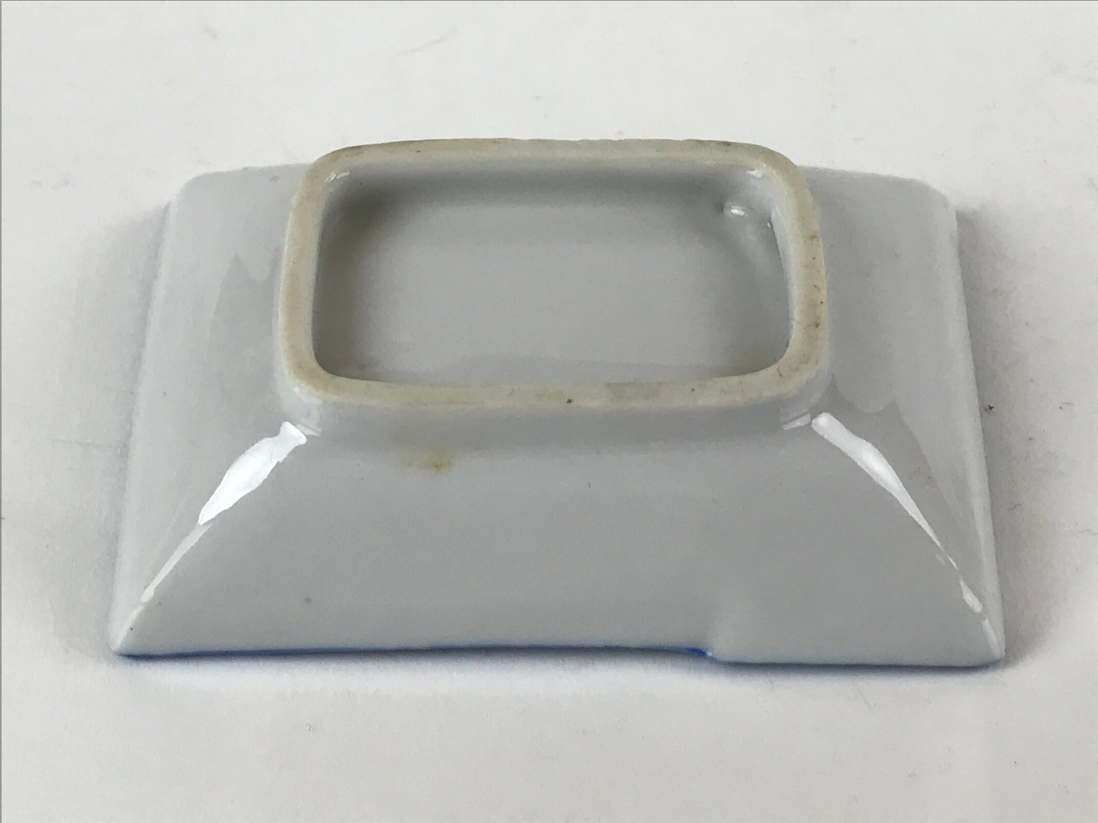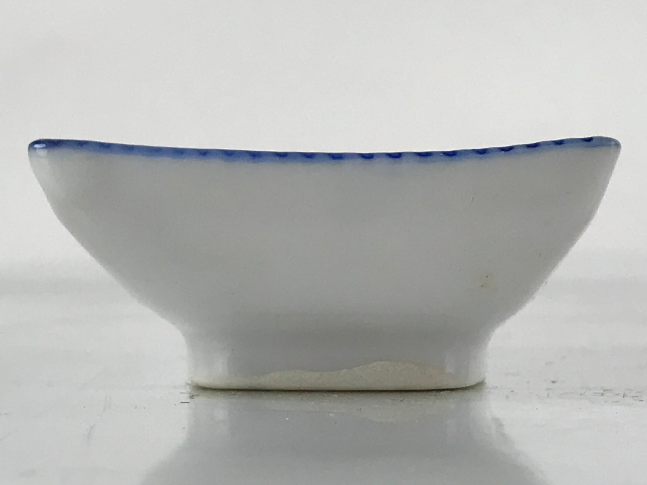 This is a vintage Japanese soy sauce dish, Seiji. It is a small, rectangular shallow bowl or plate meant to hold soy sauce as well as other seasonings for the purpose of dipping. Featuring a twisted cord-looking blue edge design, this white little bowl can also hold other food items such as pickles. This is a common dish when eating sashimi, for example.