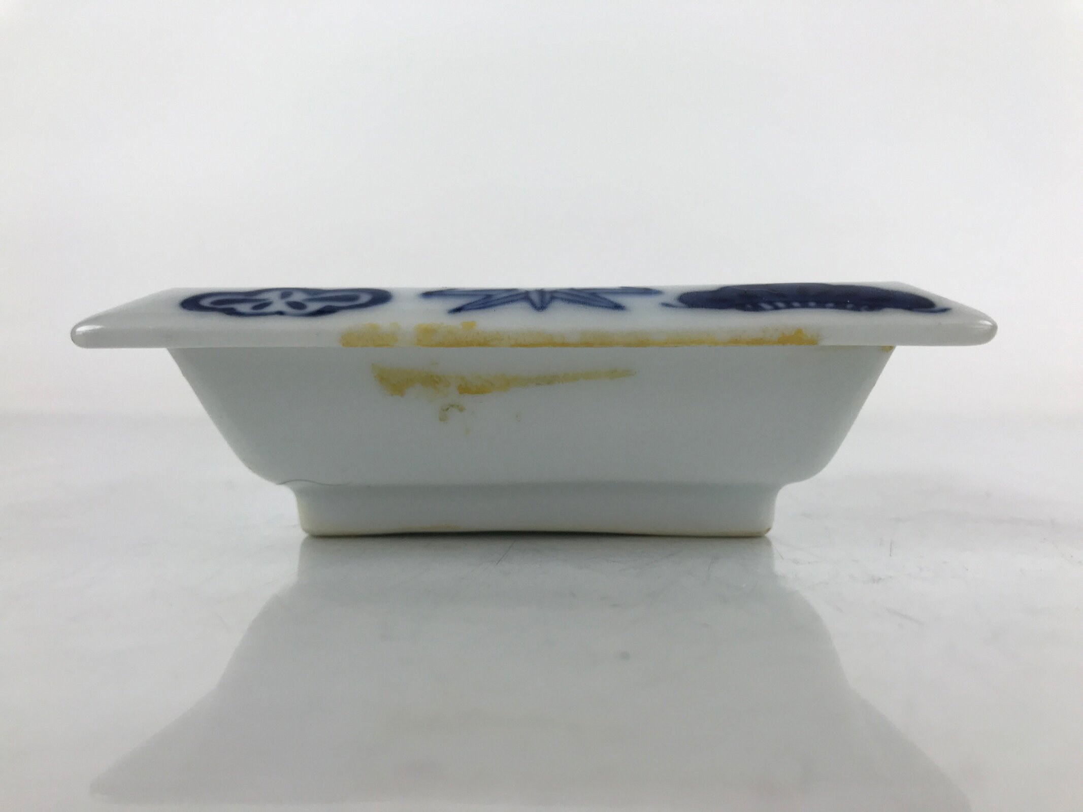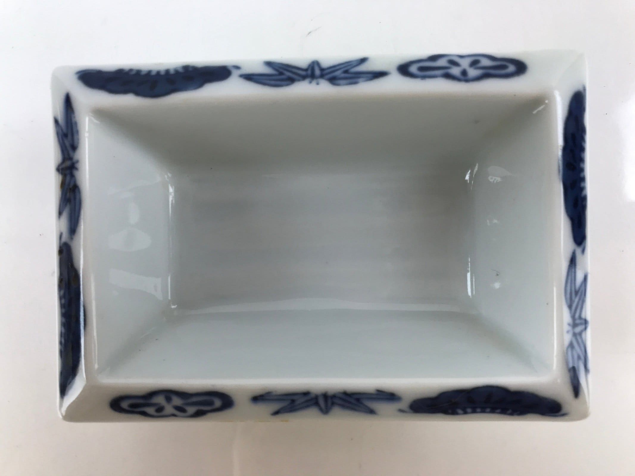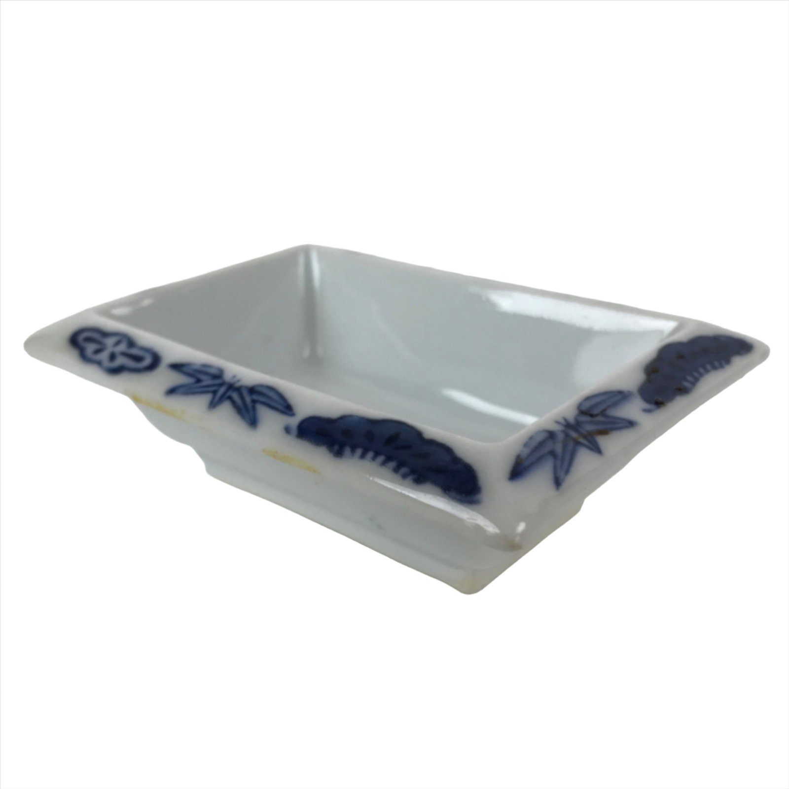 This is a vintage Japanese soy sauce dish, Seiji. It is a small, rectangular shallow bowl or plate meant to hold soy sauce as well as other seasonings for the purpose of dipping. It is mostly white with lovely blue designs depicting shochikubai (friends of winter: bamboo, pine, plum) around the edge. This is a common dish when eating sashimi or sushi, for example.